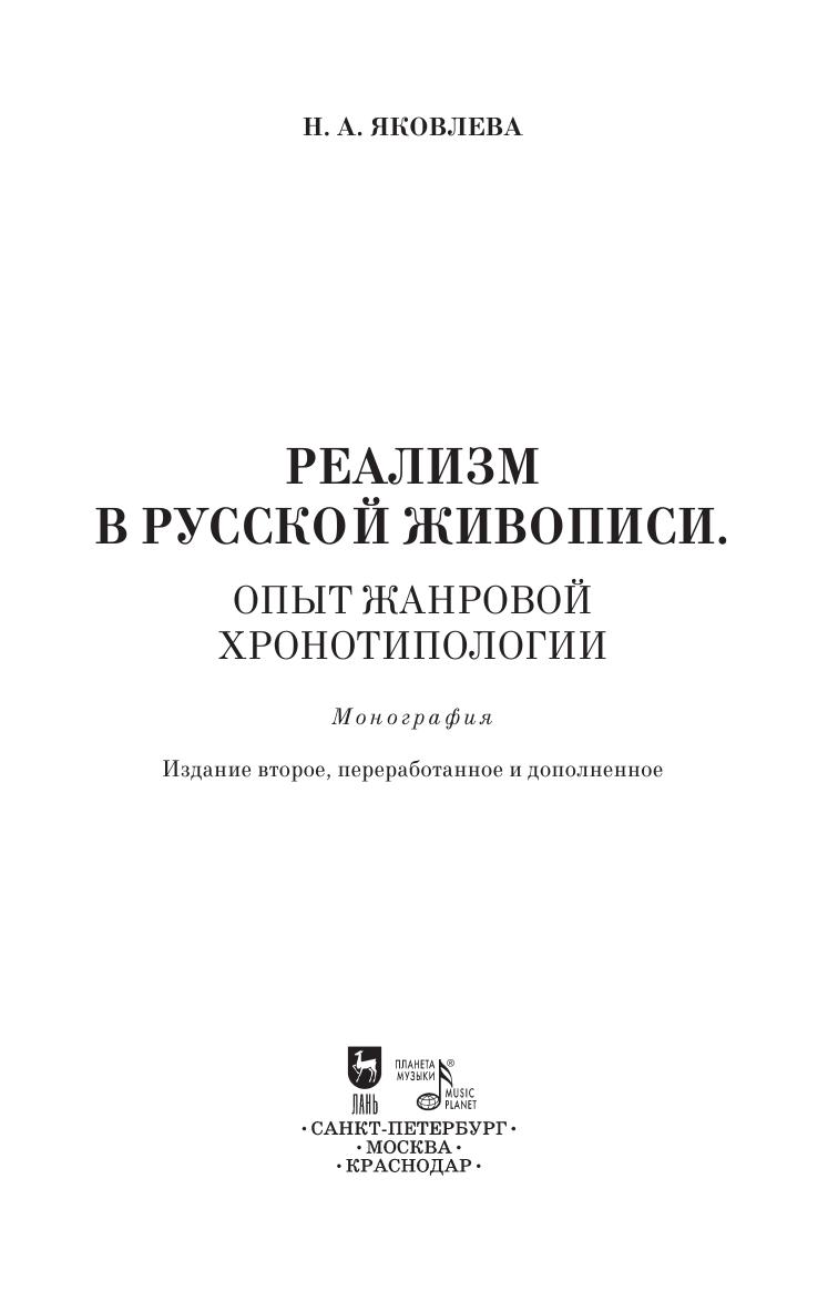 В монографии Н.А. Яковлевой русская реалистическая живопись Нового времени впервые описана как жанровая хронотипология - целостная исторически развивающаяся система жанров. Исследованы все этапы развития системы – от ее скрытого зарождения в недрах художественного процесса (первая половина Х1Х века), революционного явления в 1860-е годы и до вершины реализации ее программы в диахронной жанровой структуре в 1890—1900-е годы. Определены координаты реализма в жанровой сверхсистеме русской живописи Нового времени и намечены пути.