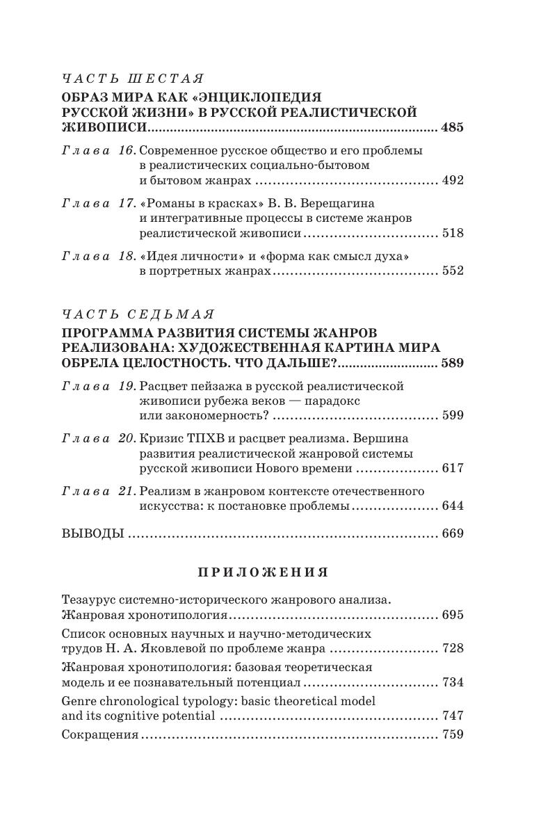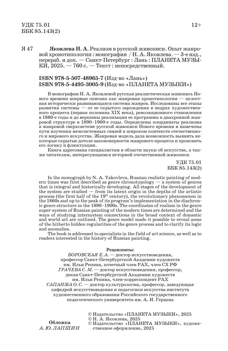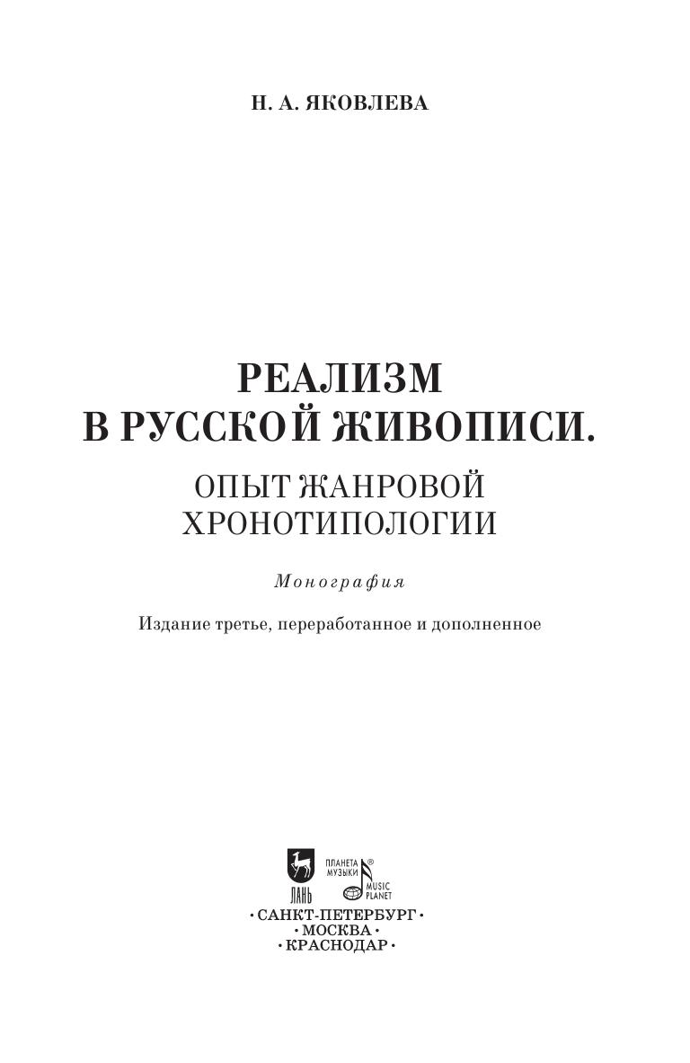 В монографии Н. А. Яковлевой русская реалистическая живопись Нового времени впервые описана как жанровая хронотипология — целостная исторически развивающаяся система жанров. Исследованы все этапы развития системы — от ее скрытого зарождения в недрах художественного процесса (первая половина ХIХ века), революционного становления в 1860-е годы и до вершины реализации ее программы в диахронной жанровой структуре в 1890–1900-е годы. Определены координаты реализма в жанровой сверхсистеме русской живописи Нового времени и намечены пути изучения межсистемных связей в широком контексте отечественного и мирового искусства. Жанровая модель дала возможность выявить некоторые скрытые дотоле закономерности жанрового процесса и прояснить его логику и флюктуации. Книга адресована специалистам в области науки об искусстве, а также читателям, интересующимся историей отечественной живописи. In the monograph by N. A. Yakovleva, Russian realistic painting of modern times was first described as genre chronotypology — a system of genres that is integral and his-torically developing. All stages of the development of the system are studied — from its latent origin in the depths of the artistic process (the first half of the 19th century), the revolutionary phenomenon in the 1860s and up to the peak of its program’s implementa-tion in the diachronic genre structure in the 1890–1900s. The coordinates of realism in the genre super-system of Russian painting of the modern times are determined and the ways of studying intersystem connections in the broad context of domestic and world art are outlined. The genre model made it possible to reveal some of the hitherto hidden regulari-ties of the genre process and to clarify its logic and anomalies. The book is addressed to specialists in the field of art science, as well as to readers interested in the history of Russian painting.
