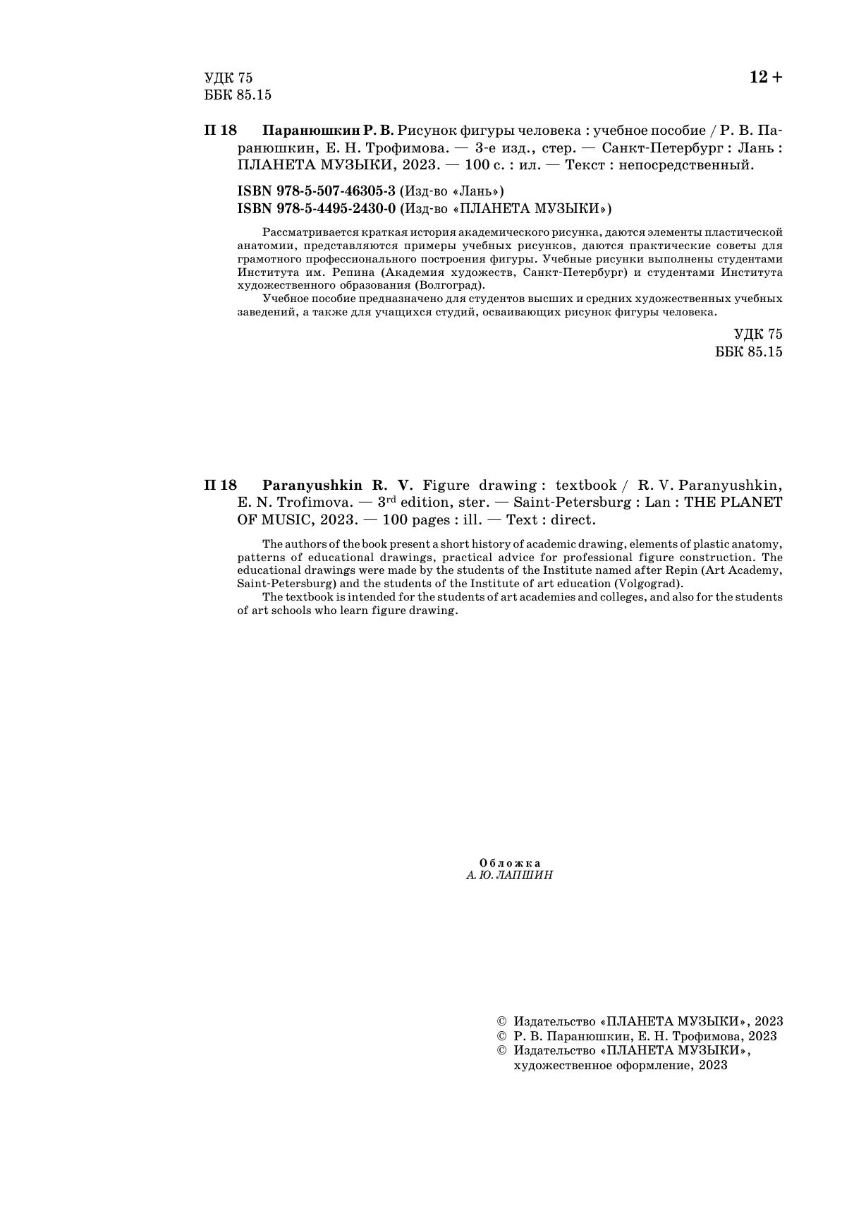 Рассматривается краткая история академического рисунка, даются элементы пластической анатомии, представляются примеры учебных рисунков, даются практические советы для грамотного профессионального построения фигуры. Учебные рисунки выполнены студентами Института им. Репина (Академия художеств, Санкт-Петербург) и студентами Института художественного образования (Волгоград).