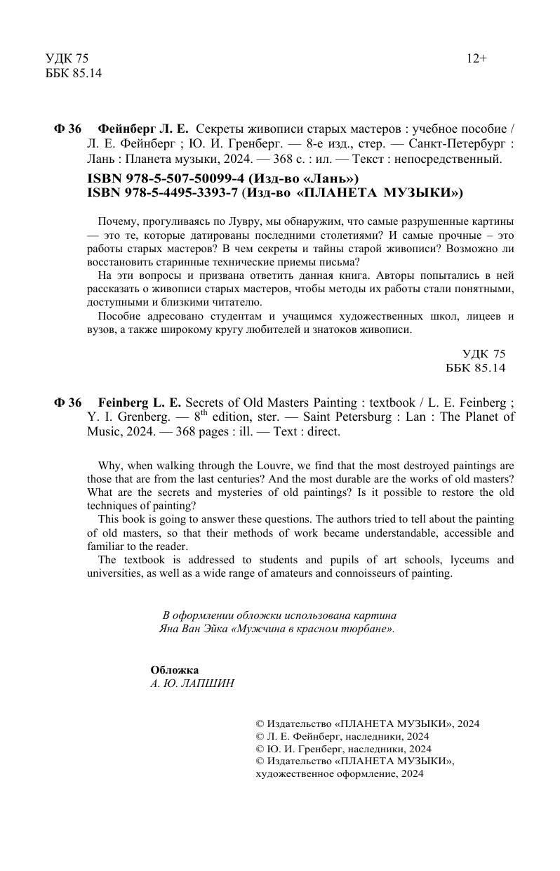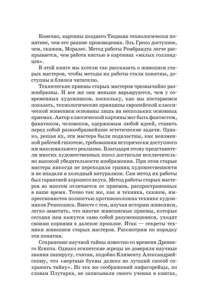 Почему, прогуливаясь по Лувру, мы обнаружим, что самые разрушенные картины – это те, которые датированы последними столетиями? И самые прочные – это работы старых мастеров? В чем секреты и тайны старой живописи? Возможно ли восстановить старинные технические приемы письма? На эти вопросы и призвана ответить данная книга. Авторы попытались в ней рассказать о живописи старых мастеров, чтобы методы их работы стали понятными, доступными и близкими читателю. Пособие адресовано студентам и учащимся художественных школ, лицеев и вузов, а также широкому кругу любителей и знатоков живописи. Why, when walking through the Louvre, we find that the most destroyed paintings are those that are from the last centuries? And the most durable are the works of old masters? What are the secrets and mysteries of old paintings? Is it possible to restore the old techniques of painting? This book is going to answer these questions. The authors tried to tell about the painting of the old masters, so that their methods of work became understandable, accessible and familiar to the reader. The textbook is addressed to students and pupils of art schools, lyceums and universities, as well as a wide range of amateurs and connoisseurs of painting.