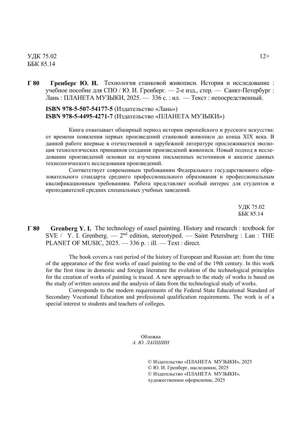 Книга охватывает обширный период истории европейского и русского искусства: от времени появления первых произведений станковой живописи до конца XIX века. В данной работе впервые в отечественной и зарубежной литературе прослеживается эволюция технологических принципов создания произведений живописи. Новый подход в исследовании произведений основан на изучении письменных источников и анализе данных технологического исследования произведений. Работа представляет особый интерес для студентов и преподавателей средних специальных учебных заведений. The book covers a vast period of the history of European and Russian art: from the time of the appearance of the first works of easel painting to the end of the 19th century. In this work for the first time in domestic and foreign literature the evolution of the technological principles for the creation of works of painting is traced. A new approach to the study of works is based on the study of written sources and the analysis of data from the technological study of works. The work is of special interest to students and teachers of colleges.