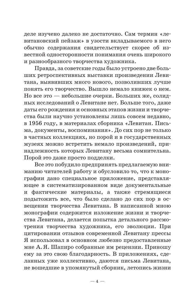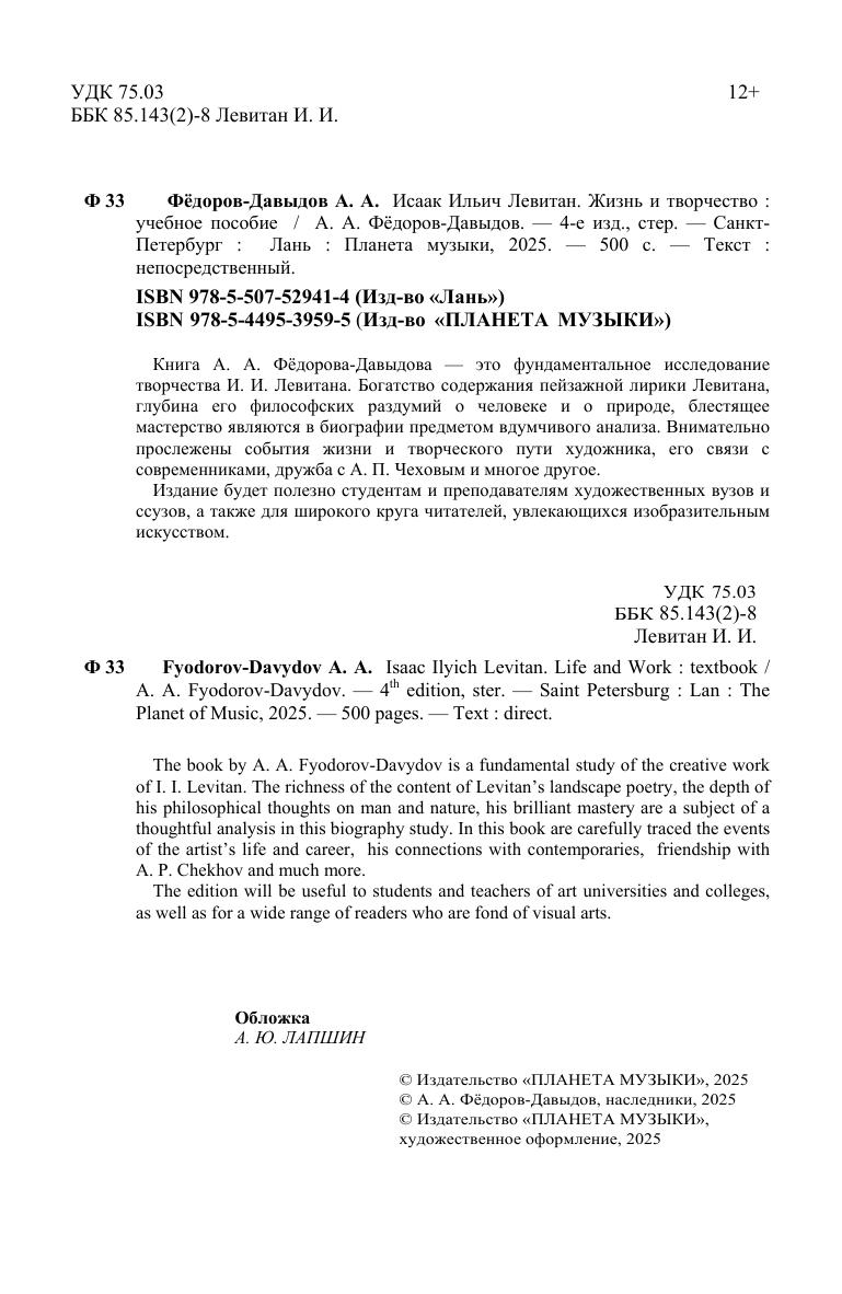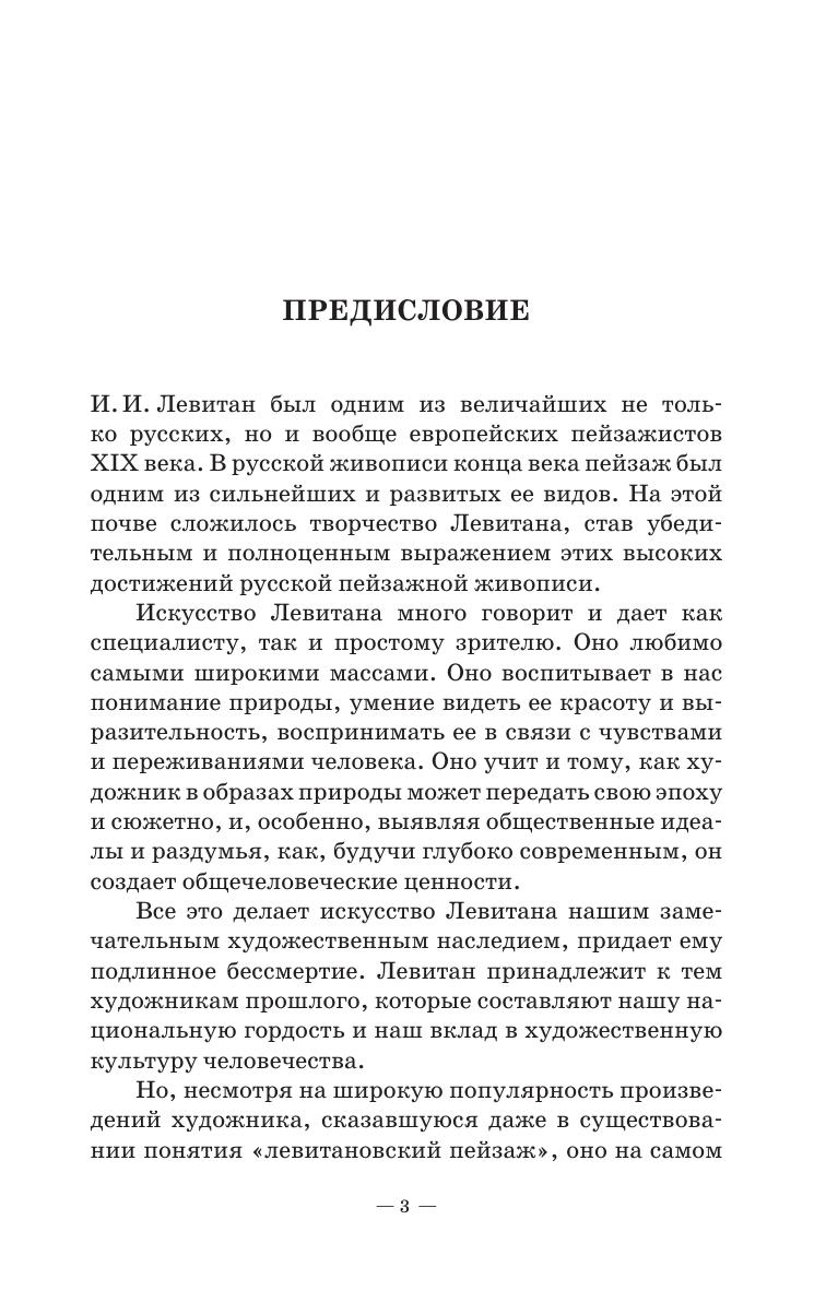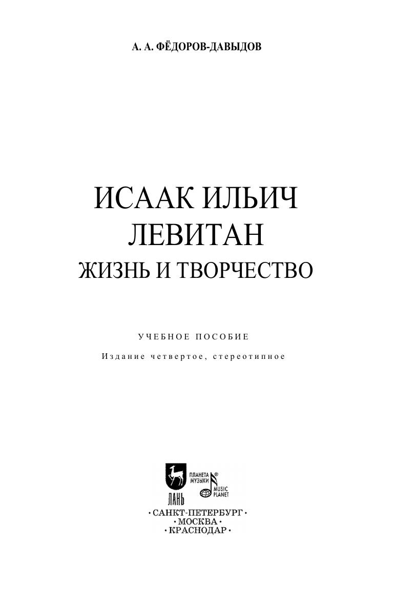 Книга А. А. Федорова-Давыдова - это фундаментальное исследование творчества И. И. Левитана. Богатство содержания пейзажной лирики Левитана, глубина его философских раздумий о человеке и о природе, блестящее мастерство являются в биографии предметом вдумчивого анализа. Внимательно прослежены события жизни и творческого пути художника, его связи с современниками, дружба с А. П. Чеховым и многое другое. Издание будет полезно студентам и преподавателям художественных вузов и ссузов, а также для широкого круга людей, увлекающихся изобразительным искусством.