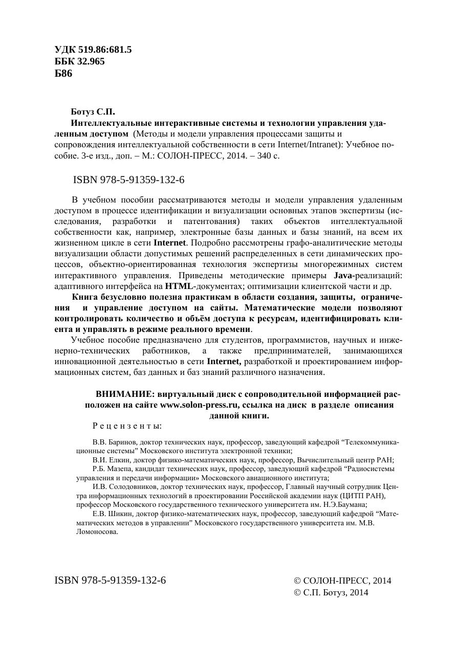 В учебном пособии рассматриваются методы и модели управления удаленным доступом в процессе идентификации и визуализации основных этапов экспертизы (исследования, разработки и патентования) таких объектов интеллектуальнойсобственности как, например, электронные базы данных и базы знаний, на всем их жизненном цикле в сети Internet. Подробно рассмотрены графо-аналитические методы визуализации области допустимых решений распределенных в сети динамических процессов, объектно-ориентированная технология экспертизы многорежимных систем интерактивного управления. Приведены методические примеры Java-реализаций: адаптивного интерфейса на HTML-документах оптимизации клиентской части и др. Книга безусловно полезна практикам в области создания, защиты, ограничения и управление доступом на сайты. Математические модели позволяют контролировать количество и объём доступа к ресурсам, идентифицировать клиента и управлять в режиме реального времени. Учебное пособие предназначено для студентов, программистов, научных и инженерно-технических работников, а также предпринимателей, занимающихся инновационной деятельностью в сети Internet, разработкой и проектированием информационных систем, баз данных и баз знаний различного назначения.