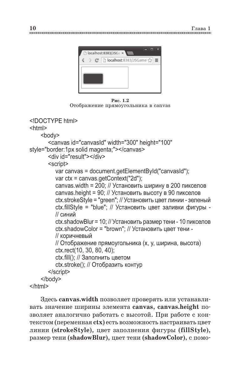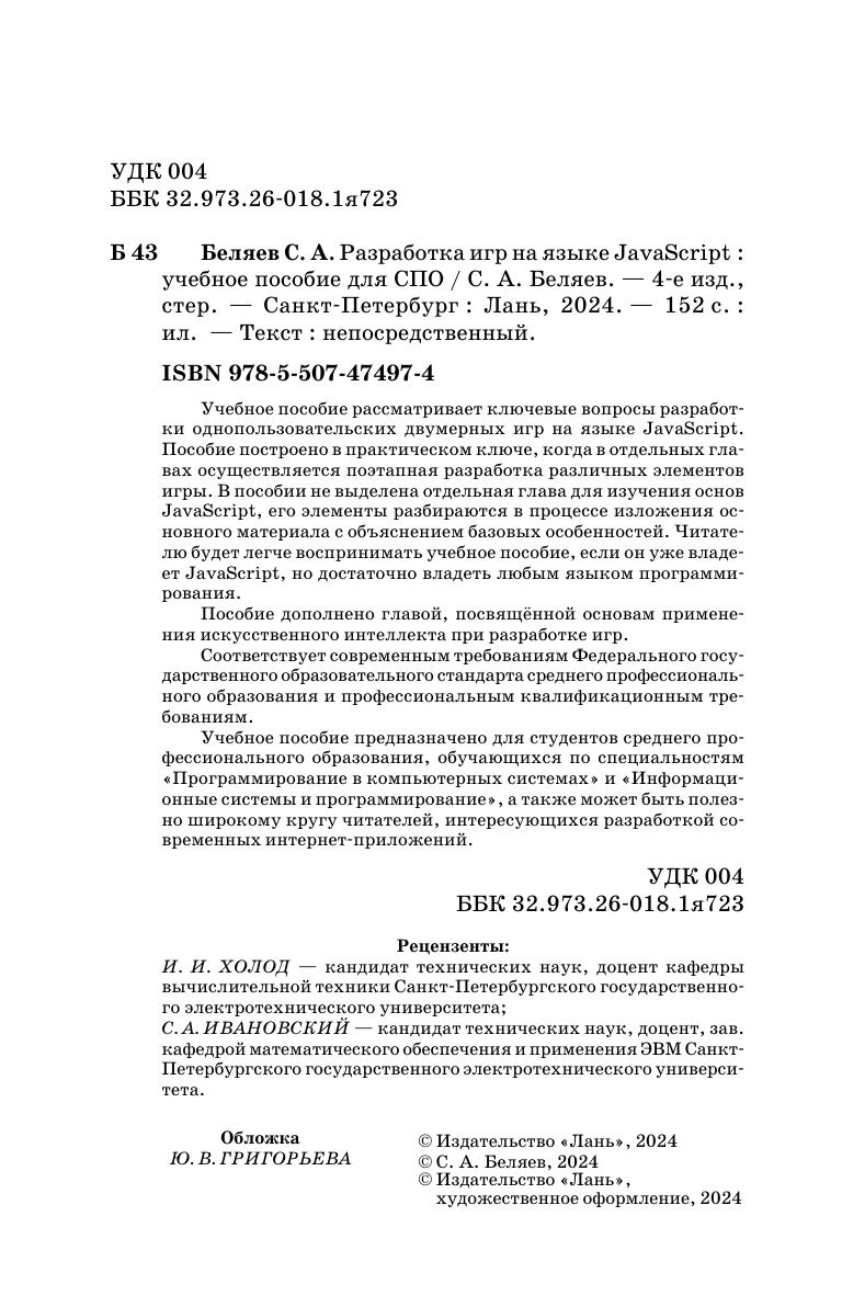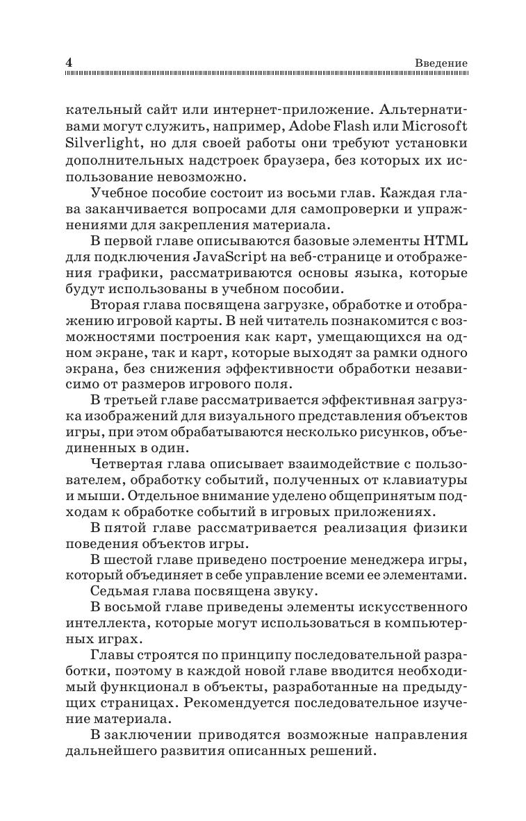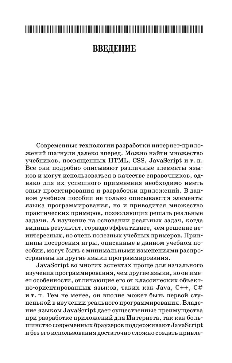 Учебное пособие рассматривает ключевые вопросы разработки однопользовательских двумерных игр на языке JavaScript. Пособие построено в практическом ключе, когда в отдельных главах осуществляется поэтапная разработка различных элементов игры. В пособии не выделена отдельная глава для изучения основ JavaScript, его элементы разбираются в процессе изложения основного материала с объяснением базовых особенностей. Читателю будет легче воспринимать учебное пособие, если он уже владеет JavaScript, но достаточно владеть любым языком программирования. Пособие дополнено главой, посвящённой основам применения искусственного интеллекта при разработке игр. Соответствует современным требованиям Федерального государственного образовательного стандарта среднего профессионального образования и профессиональным квалификационным требованиям. Учебное пособие предназначено для студентов среднего профессионального образования, обучающихся по специальностям «Программирование в компьютерных системах» и «Информационные системы и программирование», а также может быть полезно широкому кругу читателей, интересующихся разработкой современных интернет-приложений.