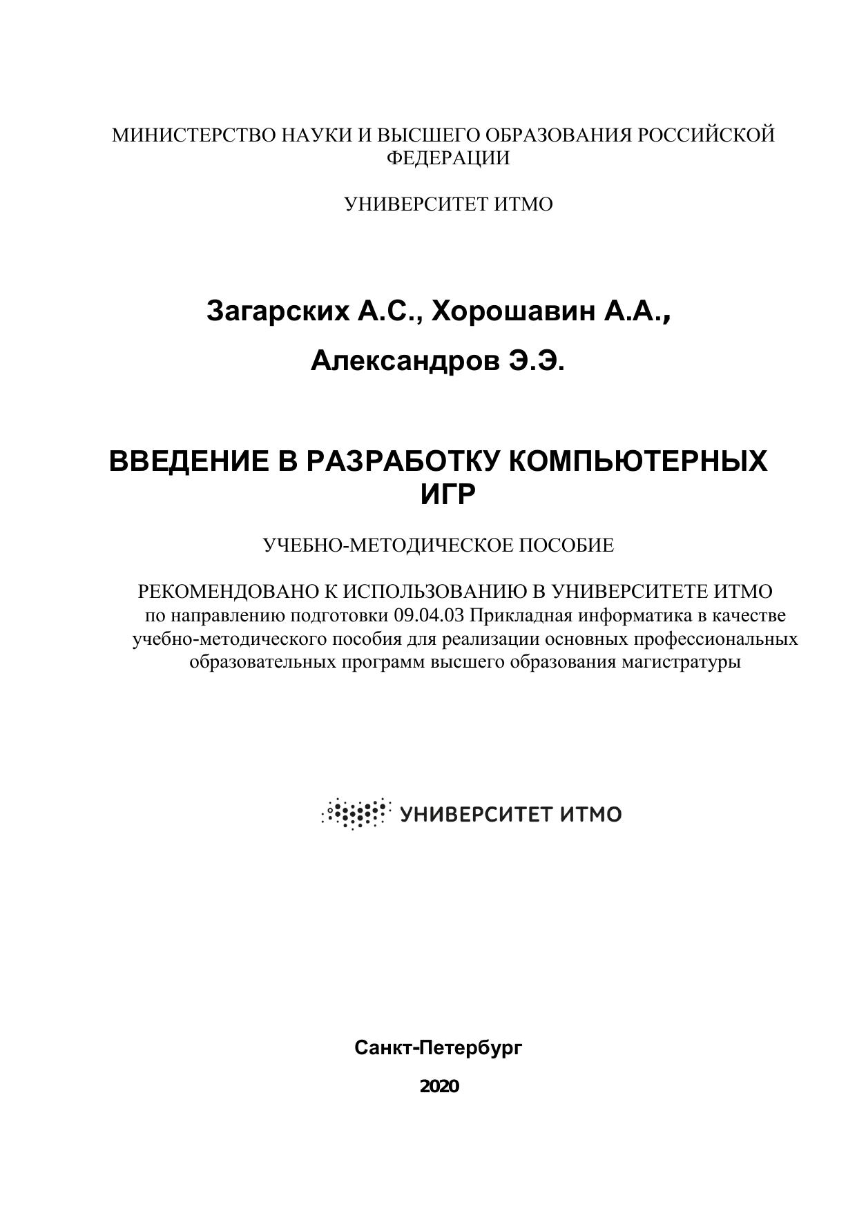 В пособии приводятся краткие теоретические сведения и изложения содержания практических занятий, методические указания и требования к курсовому проекту по дисциплине “Основы разработки компьютерных игр” направления подготовки магистратуры 09.04.03 “Прикладная информатика” по профилю “Технологии разработки компьютерных игр”.