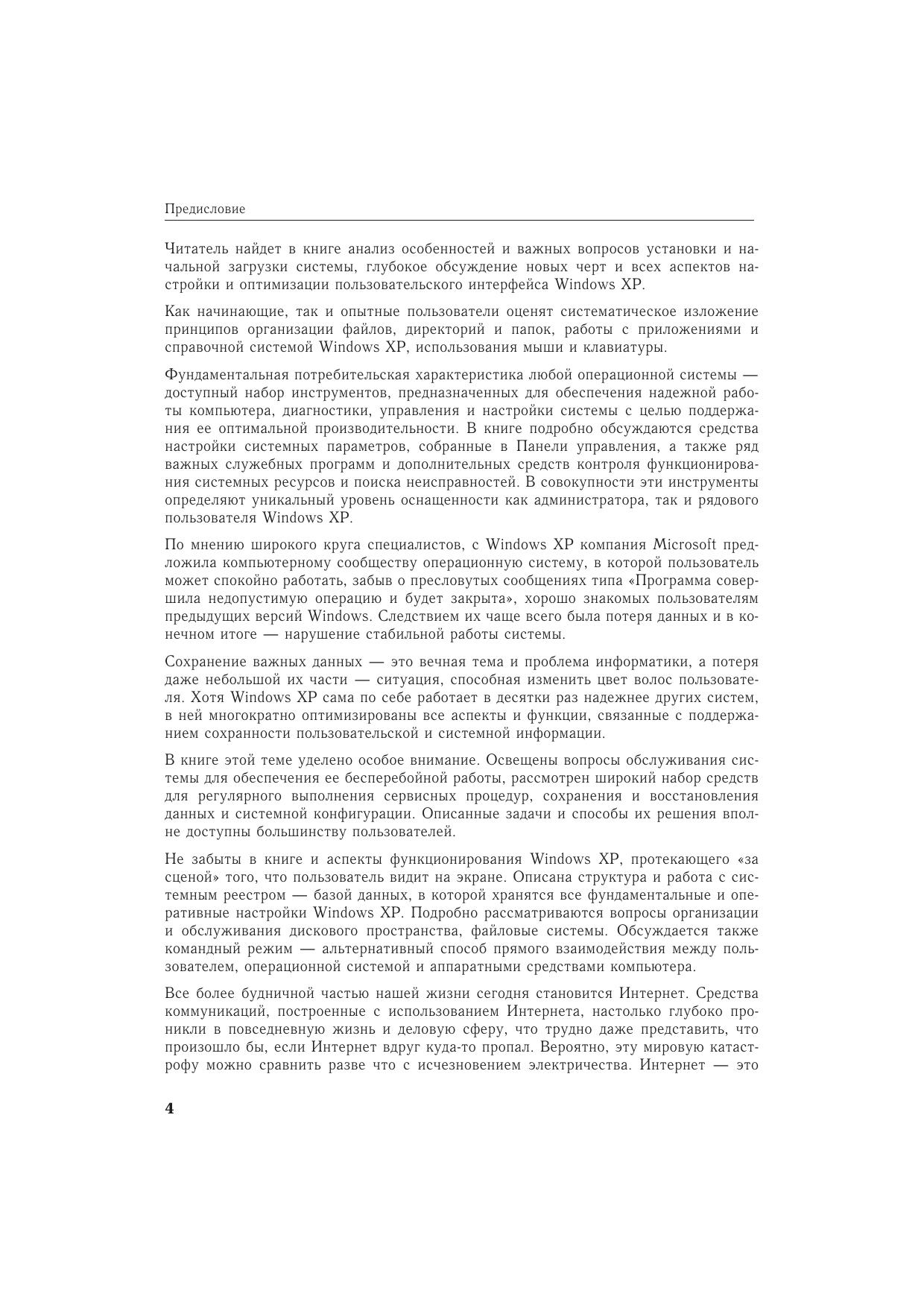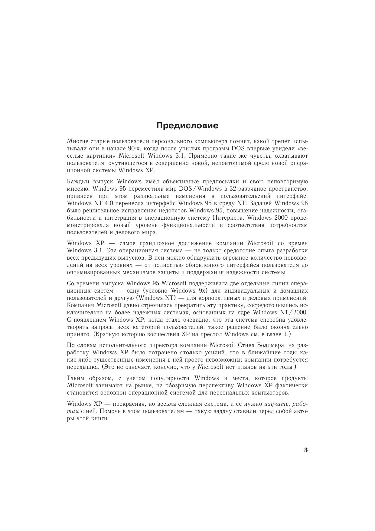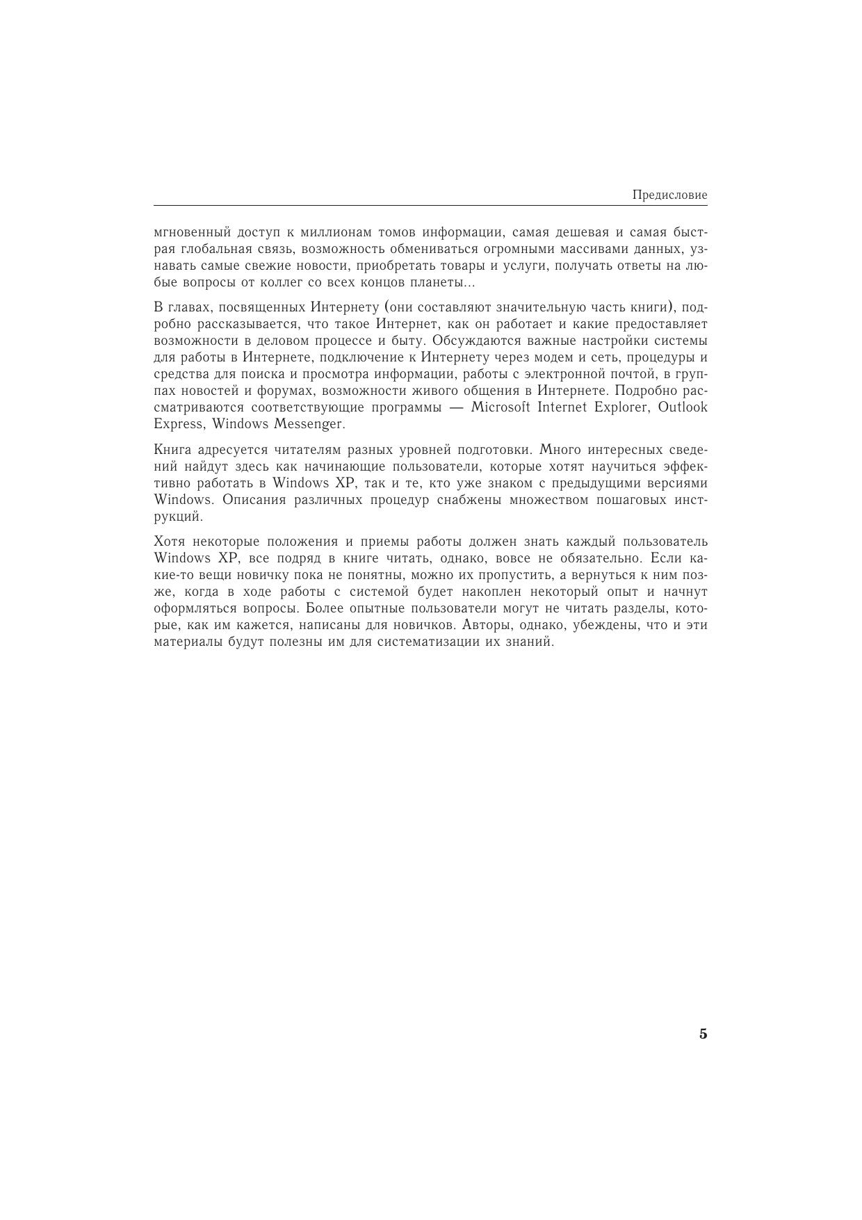 Книга посвящена новой операционной системе Microsoft Windows XP.В книге подробно описываются все аспекты работы с системой: особенности установки, настройка нового стиля интерфейса пользователя, организация данных, работа с файлами, папками и приложениями, настройка и обслуживание системы, восстановление данных и системной конфигурации, организация системного реестра, работа в командном режиме. Важное место в книге отведено вопросам, связанным с использованием Интернета, подробно рассмотрены базовые положения Интернета, настройка подключения и соответствующие программы: Microsoft Internet Explorer, Outlook Express, Windows Messenger.Материал книги излагается очень динамично и насыщенно. Читатель найдет в ней ответы на ряд важных вопросов эксплуатации компьютера и множество пошаговых инструкций, рекомендаций и советов по эффективной работе с Windows XP.Книга предназначена для широкого круга пользователей персонального компьютера. Может также использоваться в качестве пособия для компьютерных курсов начального и продвинутого уровней.