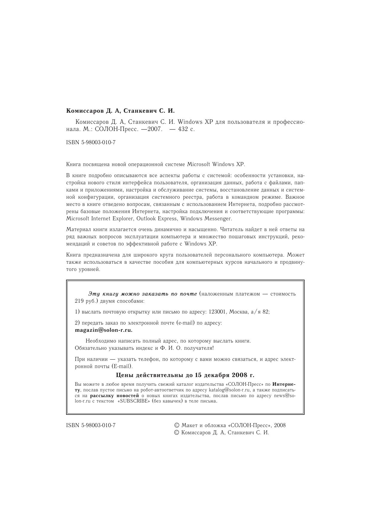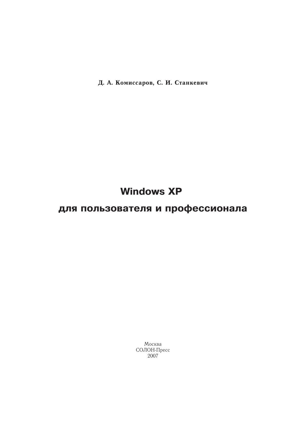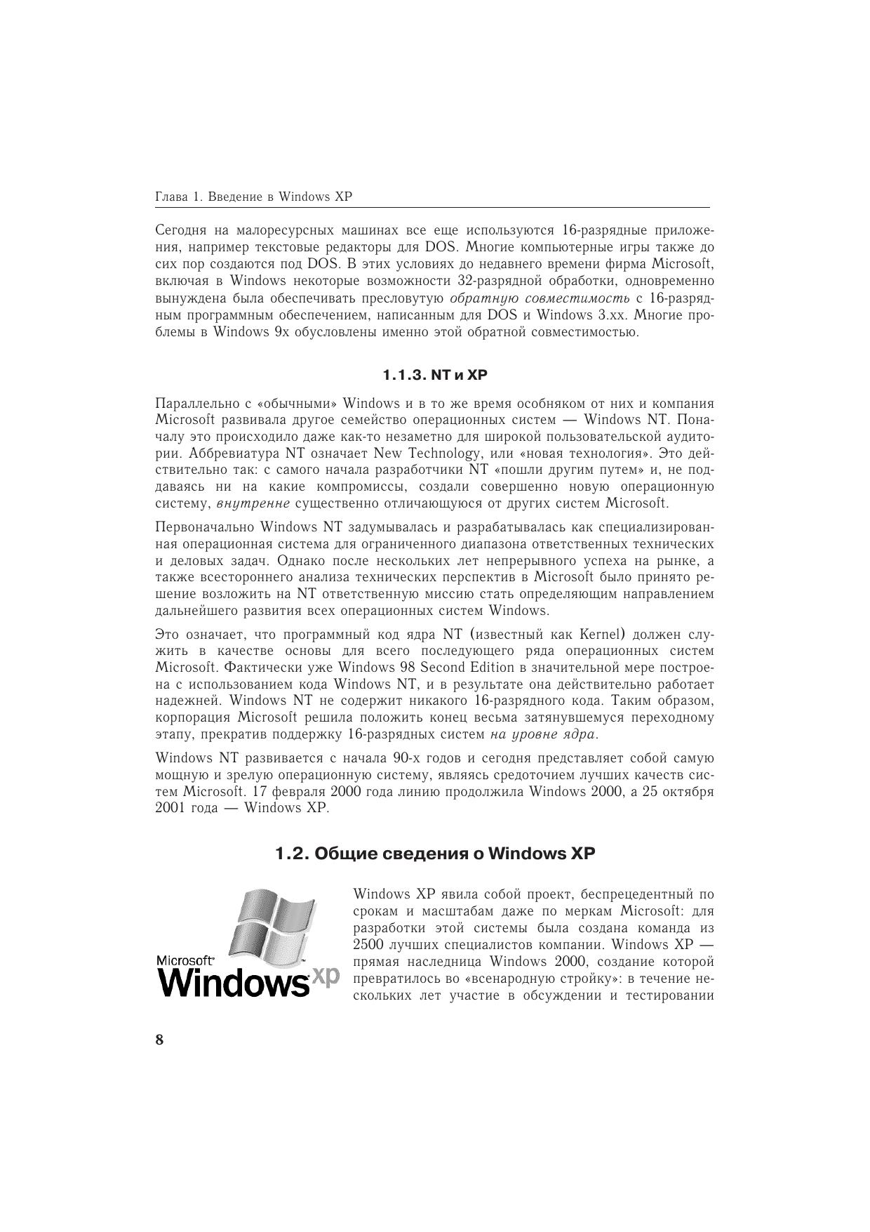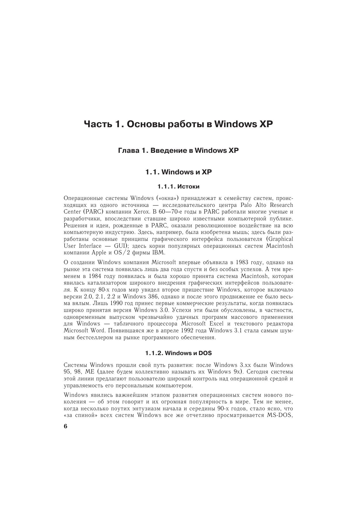 Книга посвящена новой операционной системе Microsoft Windows XP.В книге подробно описываются все аспекты работы с системой: особенности установки, настройка нового стиля интерфейса пользователя, организация данных, работа с файлами, папками и приложениями, настройка и обслуживание системы, восстановление данных и системной конфигурации, организация системного реестра, работа в командном режиме. Важное место в книге отведено вопросам, связанным с использованием Интернета, подробно рассмотрены базовые положения Интернета, настройка подключения и соответствующие программы: Microsoft Internet Explorer, Outlook Express, Windows Messenger.Материал книги излагается очень динамично и насыщенно. Читатель найдет в ней ответы на ряд важных вопросов эксплуатации компьютера и множество пошаговых инструкций, рекомендаций и советов по эффективной работе с Windows XP.Книга предназначена для широкого круга пользователей персонального компьютера. Может также использоваться в качестве пособия для компьютерных курсов начального и продвинутого уровней.