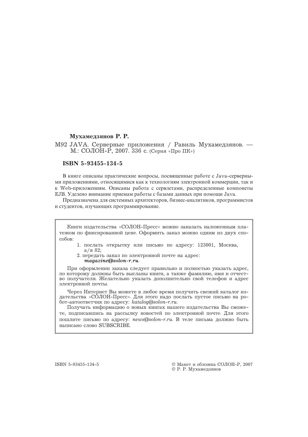 В книге описаны практические вопросы, посвященные работе с Java-серверными приложениями, относящимися как к технологиям электронной коммерции, так и к Web-приложениям. Описаны работа с сервлетами, распределенные компонеты EJB. Уделено внимание приемам работы с базами данных при помощи Java. Предназначена для системных архитекторов, бизнес-аналитиков, программистов и студентов, изучающих программирование.