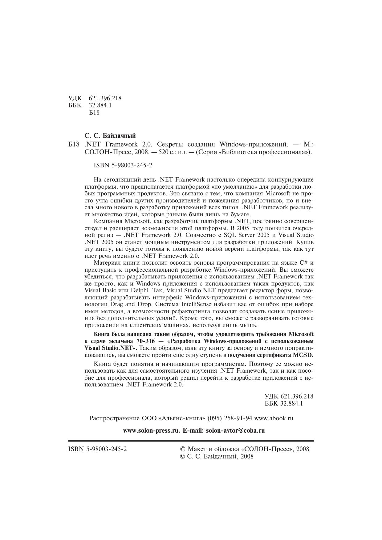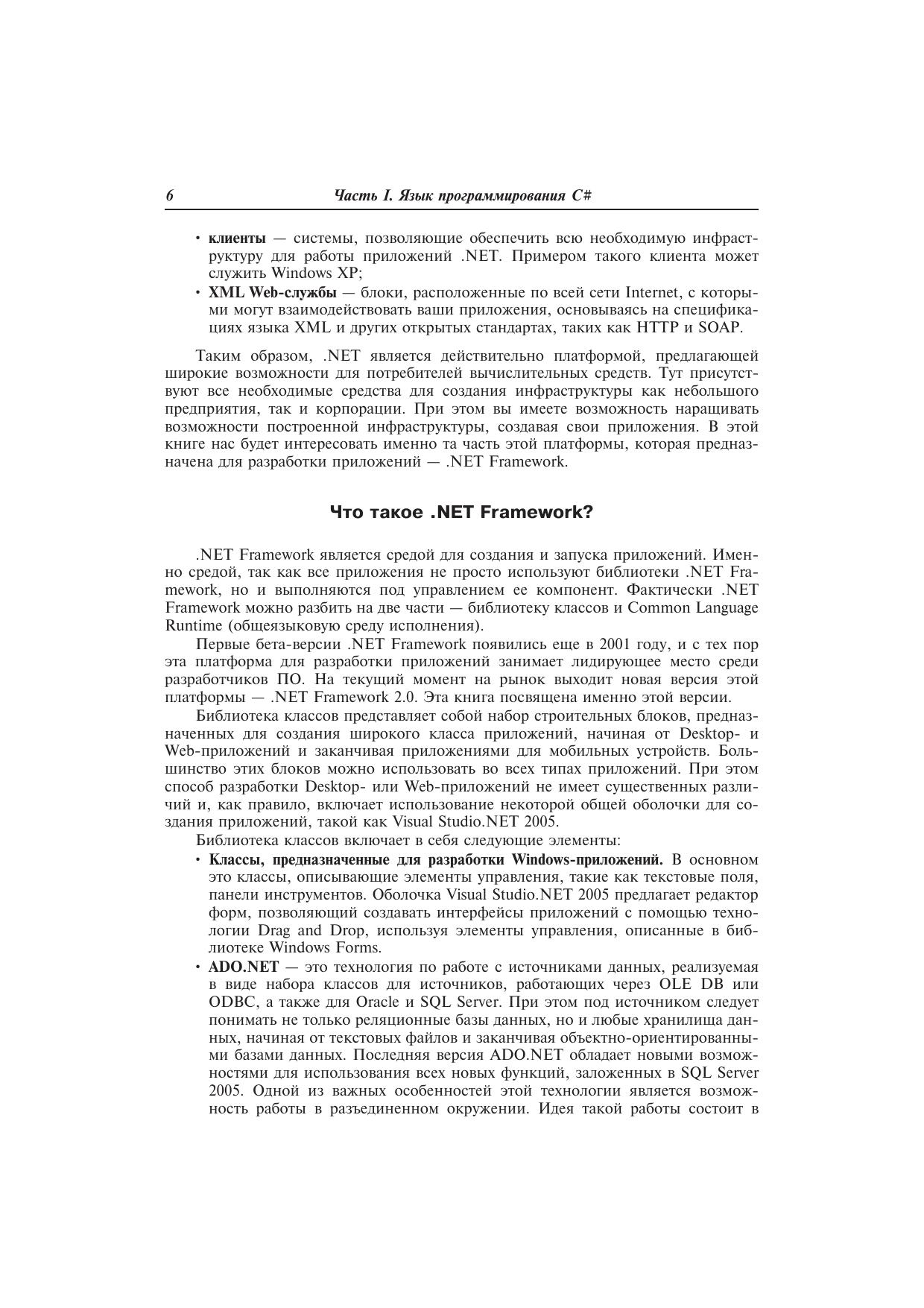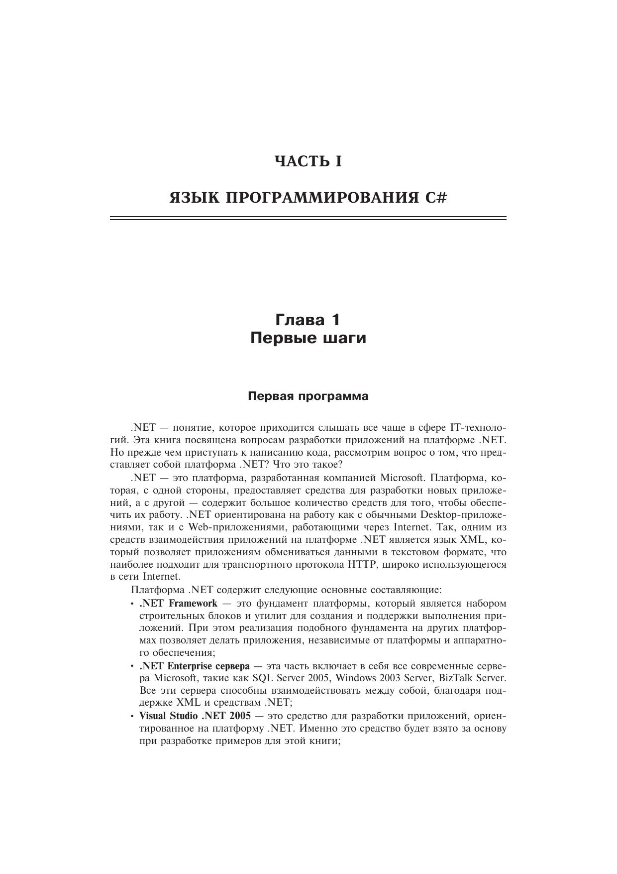 На сегодняшний день .NET Framework настолько опередила конкурирующие платформы, что предполагается платформой «по умолчанию» для разработки любых программных продуктов. Это связано с тем, что компания Microsoft не просто учла ошибки других производителей и пожелания разработчиков, но и внесла много нового в разработку приложений всех типов. .NET Framework реализует множество идей, которые раньше были лишь на бумаге.Компания Microsoft, как разработчик платформы .NET, постоянно совершенствует и расширяет возможности этой платформы. В 2005 году появится очередной релиз — .NET Framework 2.0. Совместно с SQL Server 2005 и Visual Studio .NET 2005 он станет мощным инструментом для разработки приложений. Купив эту книгу, вы будете готовы к появлению новой версии платформы, так как тут идет речь именно о .NET Framework 2.0.Материал книги позволит освоить основы программирования на языке С# и приступить к профессиональной разработке Windows-приложений. Вы сможете убедиться, что разрабатывать приложения с использованием .NET Framework так же просто, как и Windows-приложения с использованием таких продуктов, как Visual Basic или Delphi.