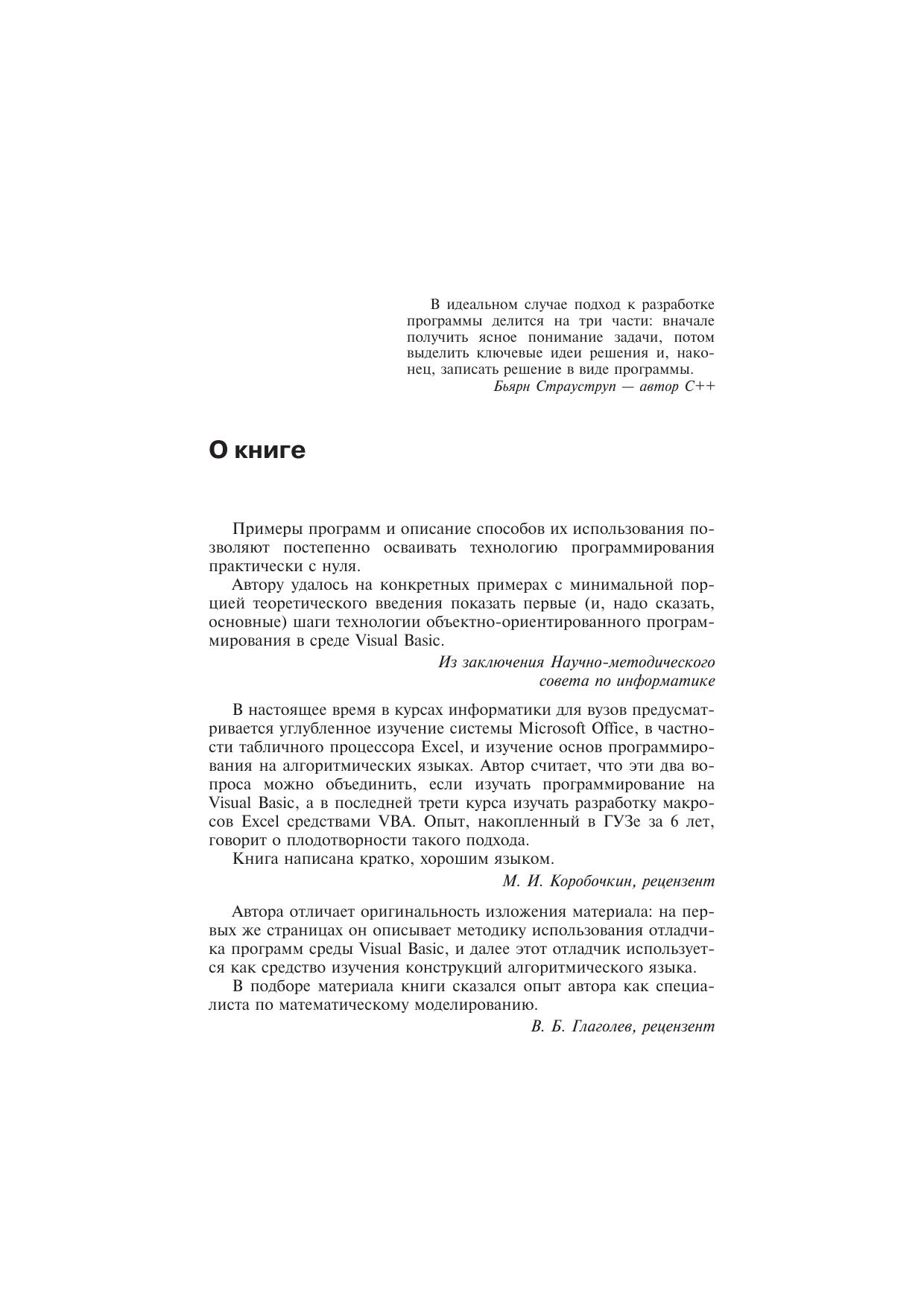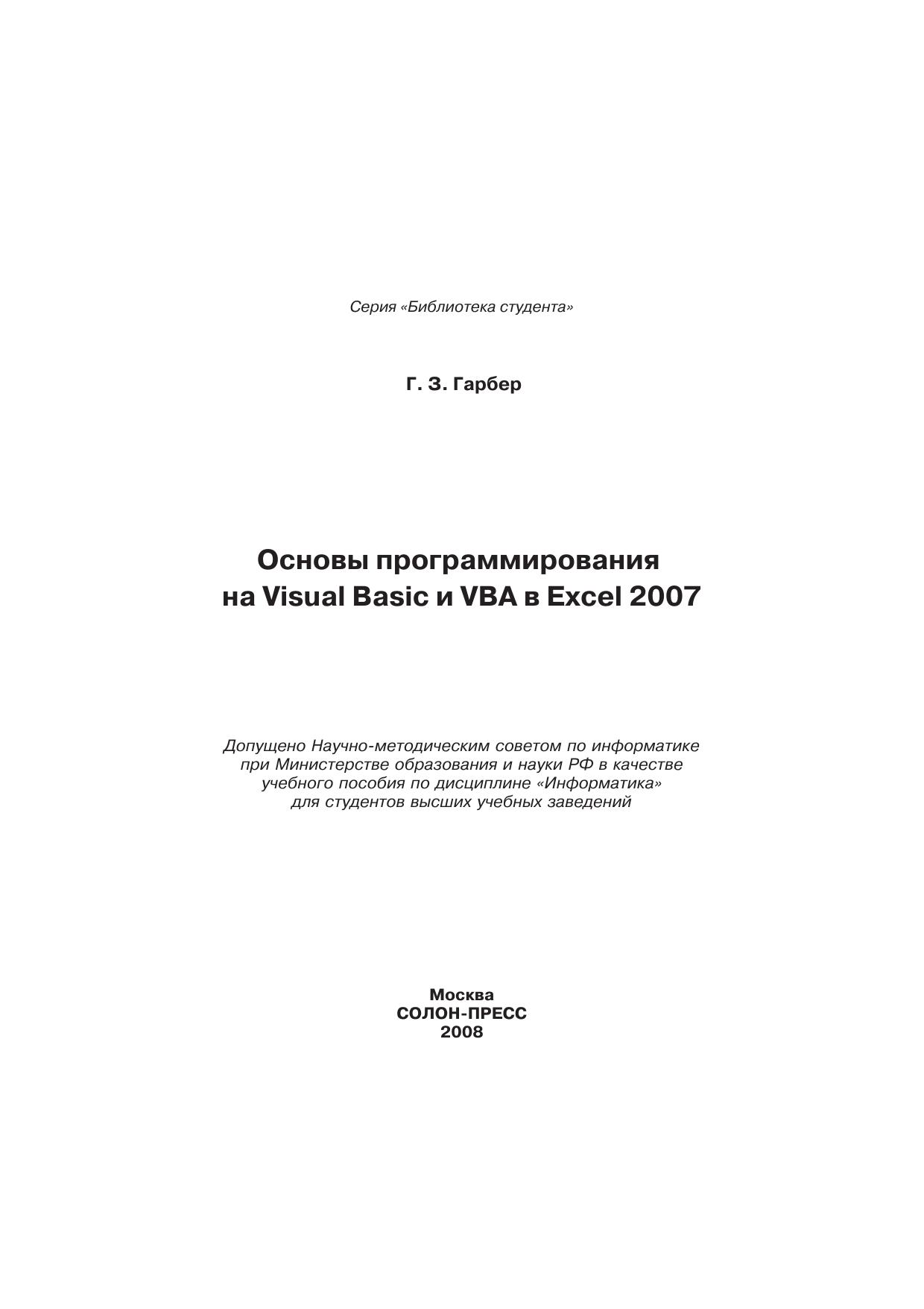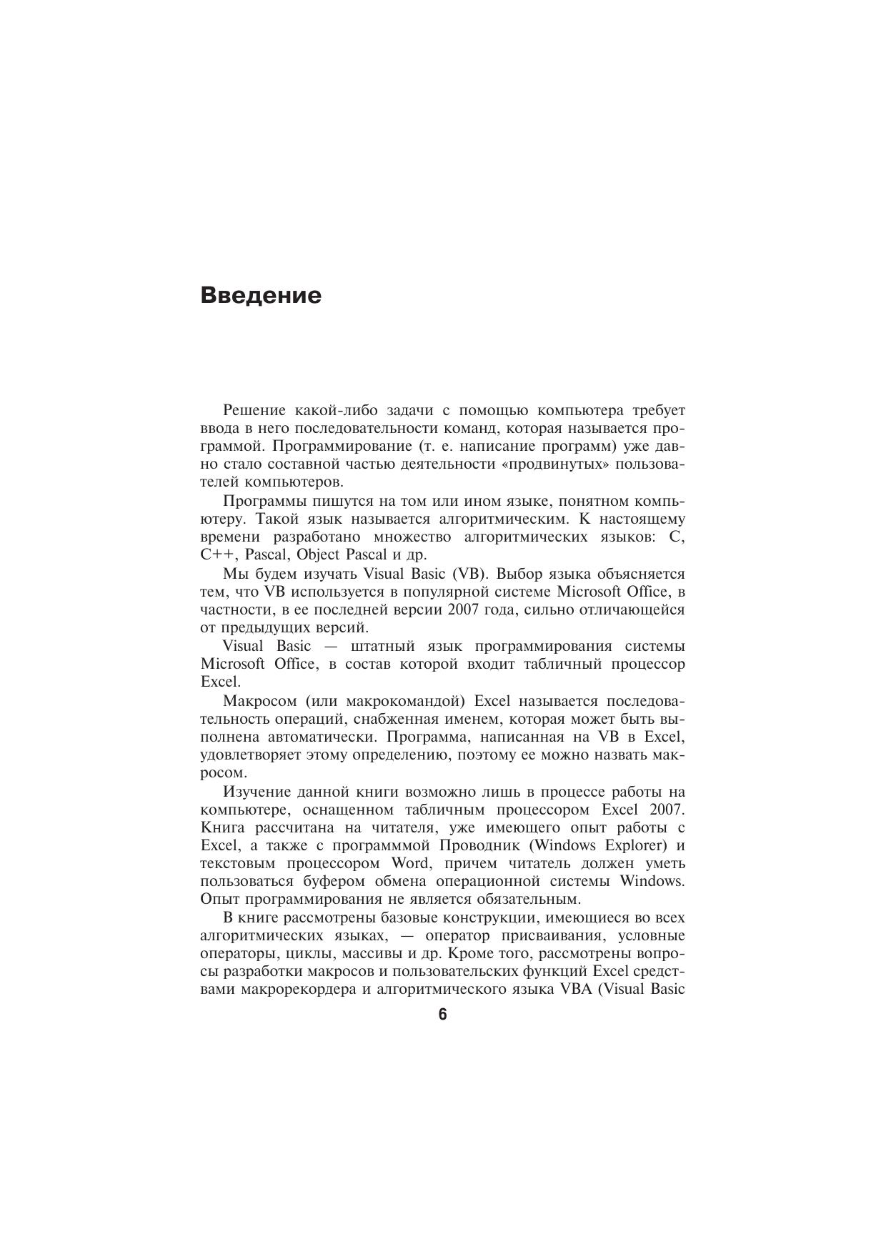 Рассматриваются основные элементы среды разработки программ, а также базовые конструкции алгоритмических языков Visual Basic и VBA (Visual Basic для приложений). В качестве пользовательского интерфейса программы (макроса) используются стандартные окна Windows, текстовые файлы, формы, таблица Excel. Рассматривается также вопрос разработки пользовательских функций Excel. Продемонстрированы приемы работы с отладчиком программ, справочными системами, макрорекордером и личной книгой макросов. Опыт программирования не является обязательным. Книга ориентирована на преподавателей информатики, студентов вузов и колледжей, а также на широкий круг читателей, имеющих желание научиться программировать в табличном процессоре Excel 2007 и тем самым существенно расширить круг решаемых задач.
