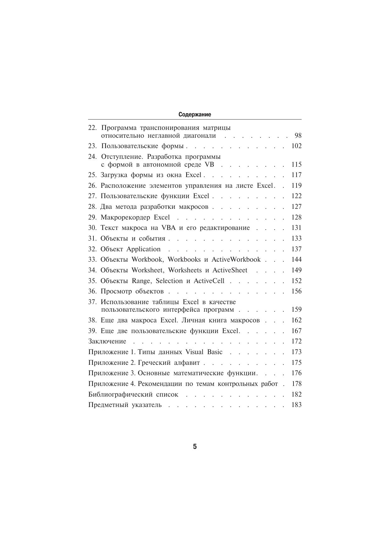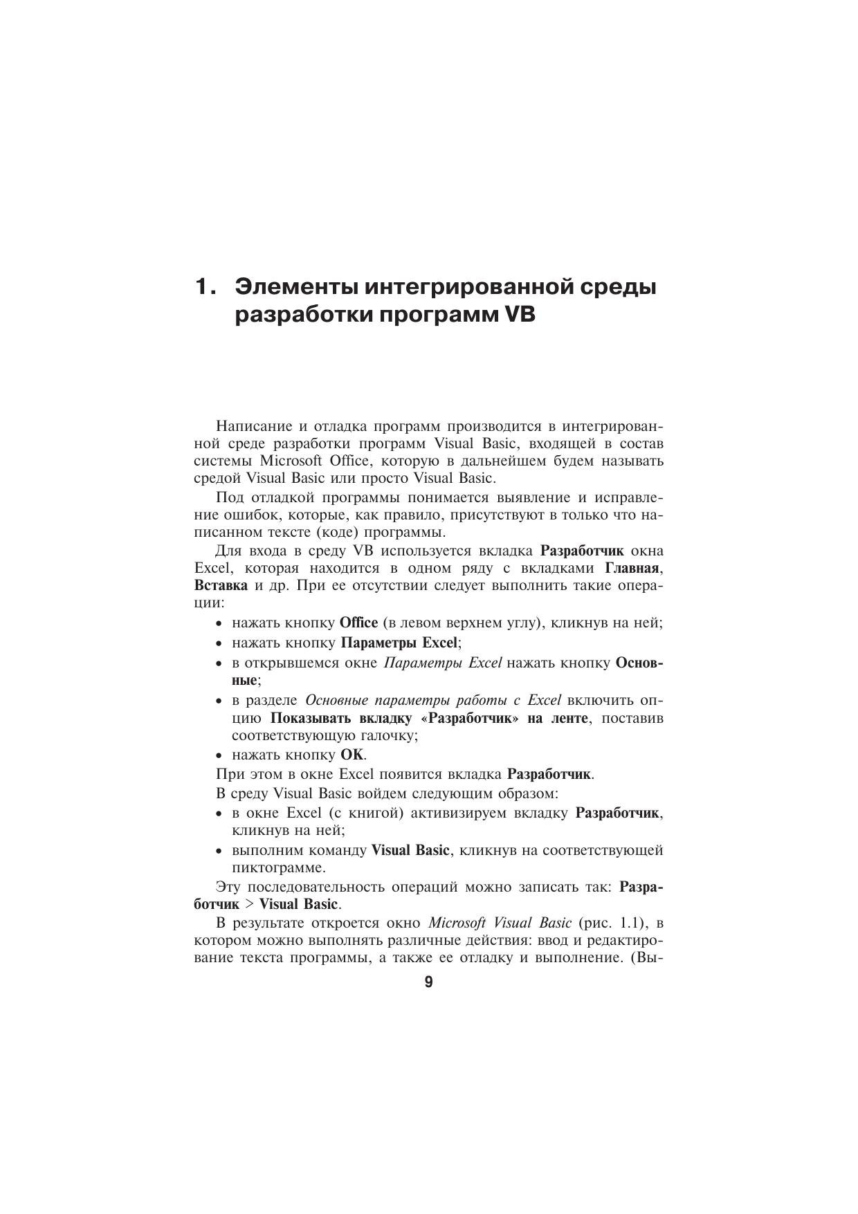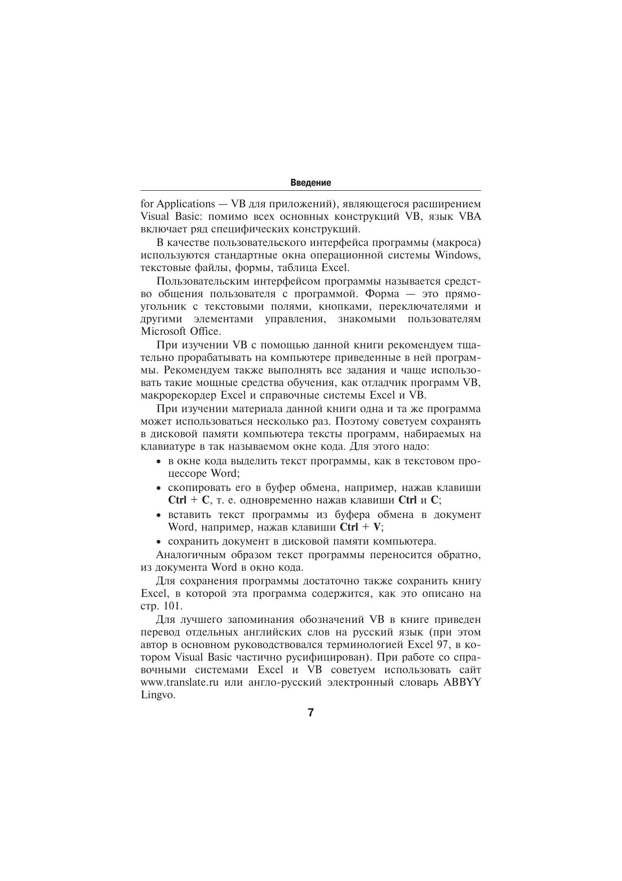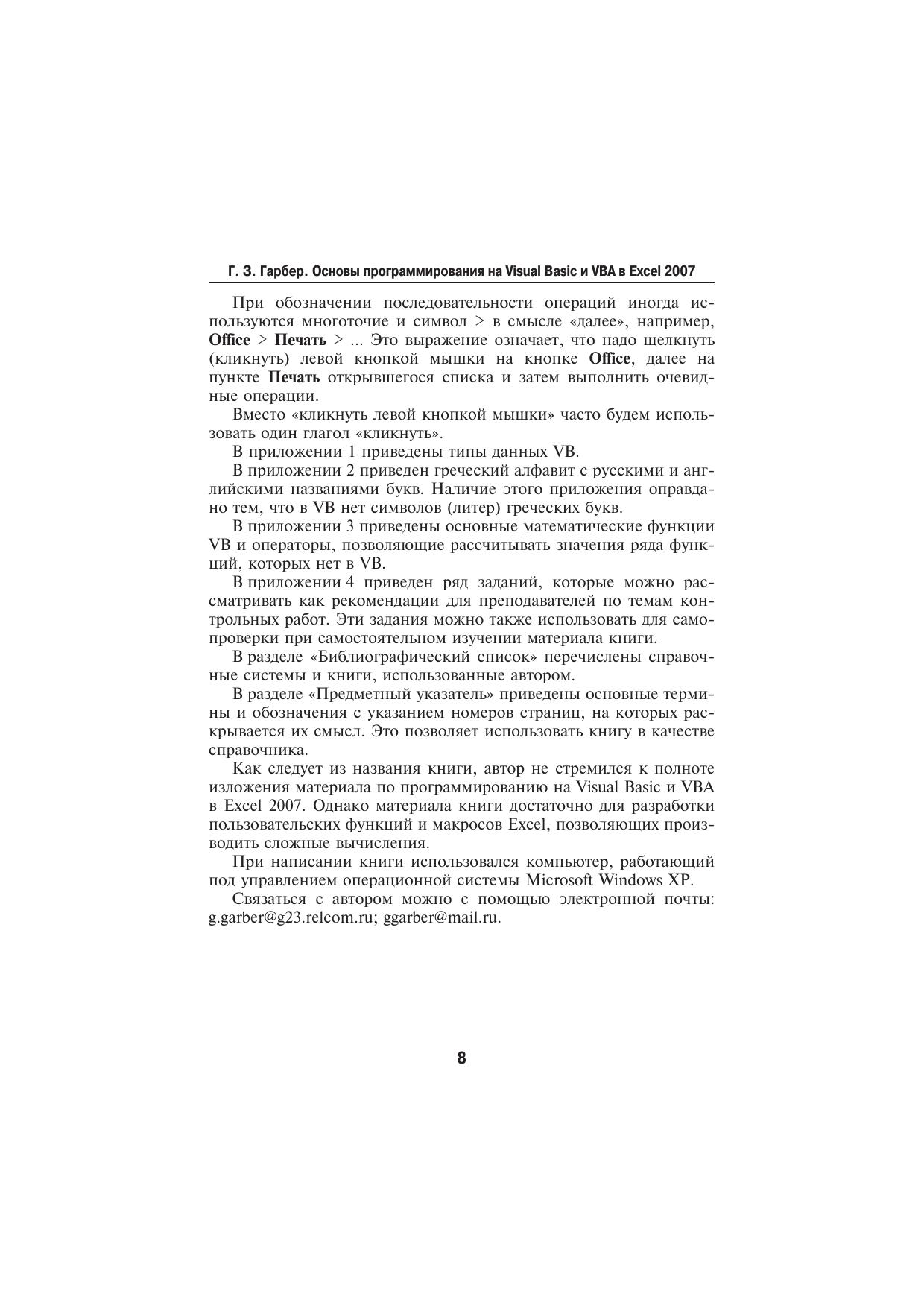 Рассматриваются основные элементы среды разработки программ, а также базовые конструкции алгоритмических языков Visual Basic и VBA (Visual Basic для приложений). В качестве пользовательского интерфейса программы (макроса) используются стандартные окна Windows, текстовые файлы, формы, таблица Excel. Рассматривается также вопрос разработки пользовательских функций Excel. Продемонстрированы приемы работы с отладчиком программ, справочными системами, макрорекордером и личной книгой макросов. Опыт программирования не является обязательным. Книга ориентирована на преподавателей информатики, студентов вузов и колледжей, а также на широкий круг читателей, имеющих желание научиться программировать в табличном процессоре Excel 2007 и тем самым существенно расширить круг решаемых задач.