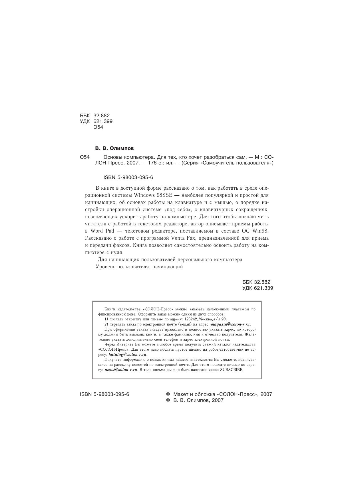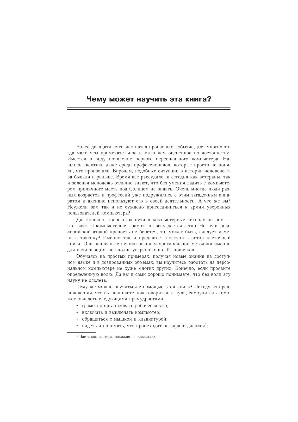 В книге в доступной форме рассказано о том, как работать в среде операционной системы Windows 98SSE — наиболее популярной и простой для начинающих, об основах работы на клавиатуре и с мышью, о порядке настройки операционной системе «под себя», о клавиатурных сокращениях, позволяющих ускорить работу на компьютере. Для того чтобы познакомить читателя с работой в текстовом редакторе, автор описывает приемы работы в Word Pad — текстовом редакторе, поставляемом в составе ОС Win98. Рассказано о работе с программой Venta Fax, предназначенной для приема и передачи факсов. Книга позволяет самостоятельно освоить работу на компьютере с нуля. Для начинающих пользователей персонального компьютера. Уровень пользователя: начинающий.