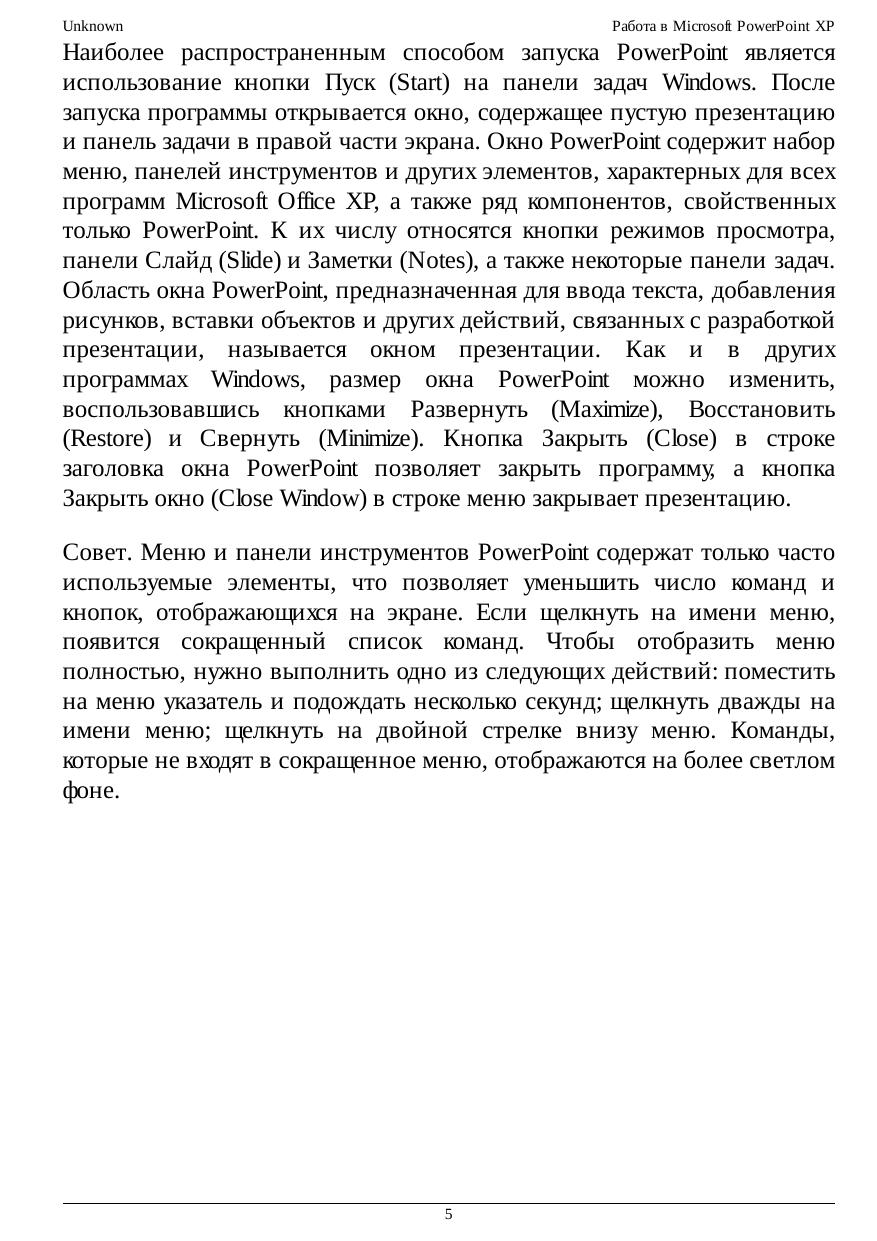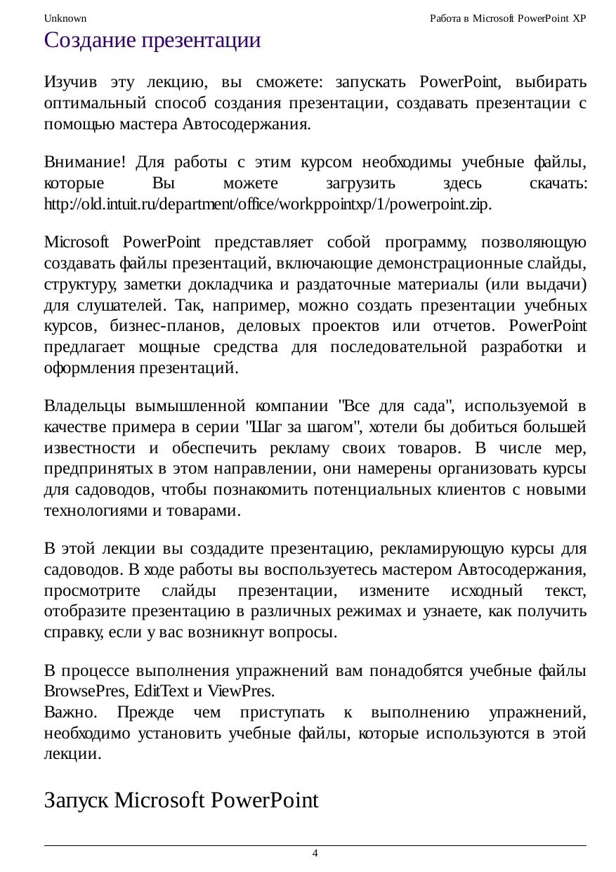 Краткий курс из серии "Шаг за шагом" знакомит с основными возможностями работы с Microsoft PowerPoint XP. Microsoft PowerPoint представляет собой программу, позволяющую создавать файлы презентаций, включающие демонстрационные слайды, структуру, заметки докладчика и раздаточные материалы (или выдачи) для слушателей. Так, например, можно создать презентации учебных курсов, бизнес-планов, деловых проектов или отчетов. PowerPoint предлагает мощные средства для последовательной разработки и оформления презентаций.