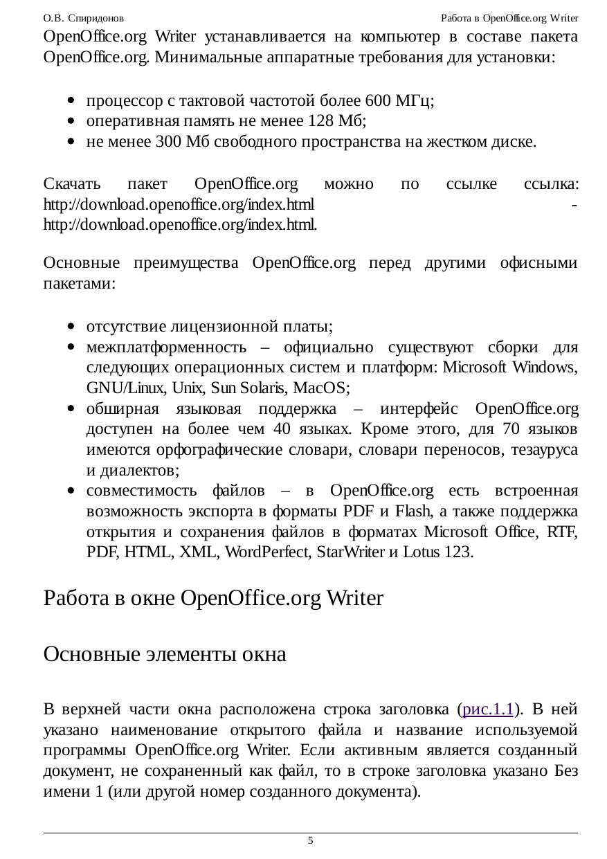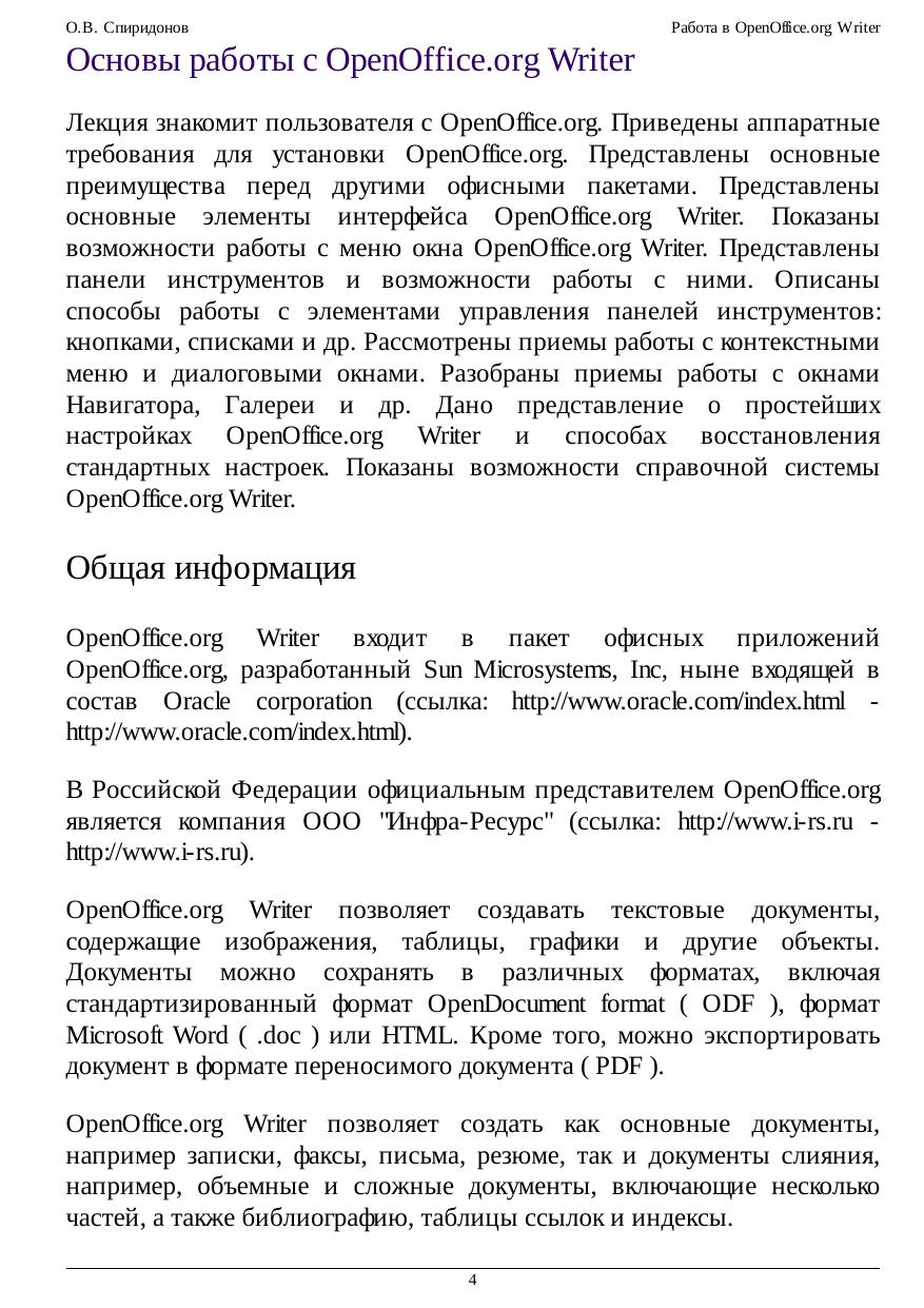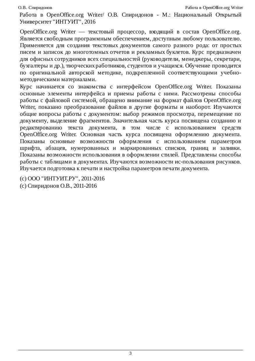 писем и записок до многотомных отчетов и рекламных буклетов. Курс предназначен для офисных сотрудников всех специальностей (руководители, менеджеры, секретари, бухгалтеры и др.), творческих работников, студентов и учащихся. Обучение проводится по оригинальной авторской методике, подкрепленной соответствующими учебно-методическими материалами. Курс начинается со знакомства с интерфейсом OpenOffice.org Writer. Показаны основные элементы интерфейса и приемы работы с ними. Рассмотрены способы работы с файловой системой, обращено внимание на формат файлов OpenOffice.org Writer, показано преобразование файлов в другие форматы и наоборот. Изучаются общие вопросы работы с документом: выбор режимов просмотра, перемещение по документу, выделение фрагментов. Значительная часть курса посвящена созданию и редактированию текста документа, в том числе с использованием средств OpenOffice.org Writer. Основная часть курса посвящена оформлению документа. Показаны основные возможности оформления с использованием параметров шрифта, абзацев, нумерованных и маркированных списков, границ и заливки. Показаны возможности использования в оформлении стилей. Представлены способы работы с таблицами в документах. Изучаются возможности ис-пользования рисунков. Изучается подготовка к печати и настройка параметров печати документа.