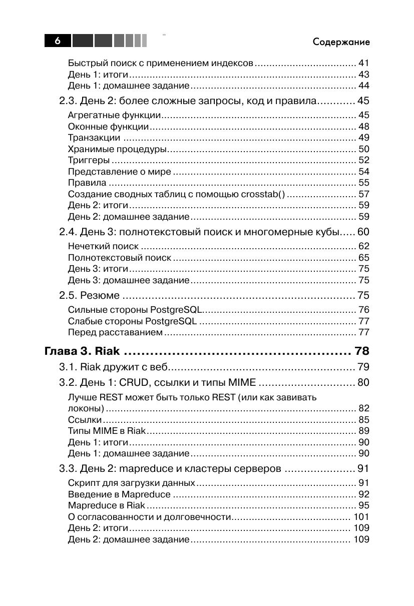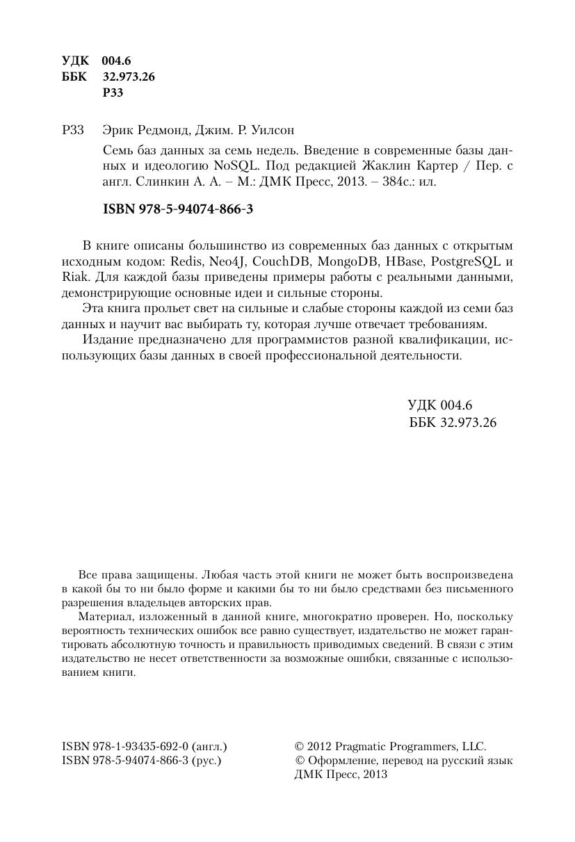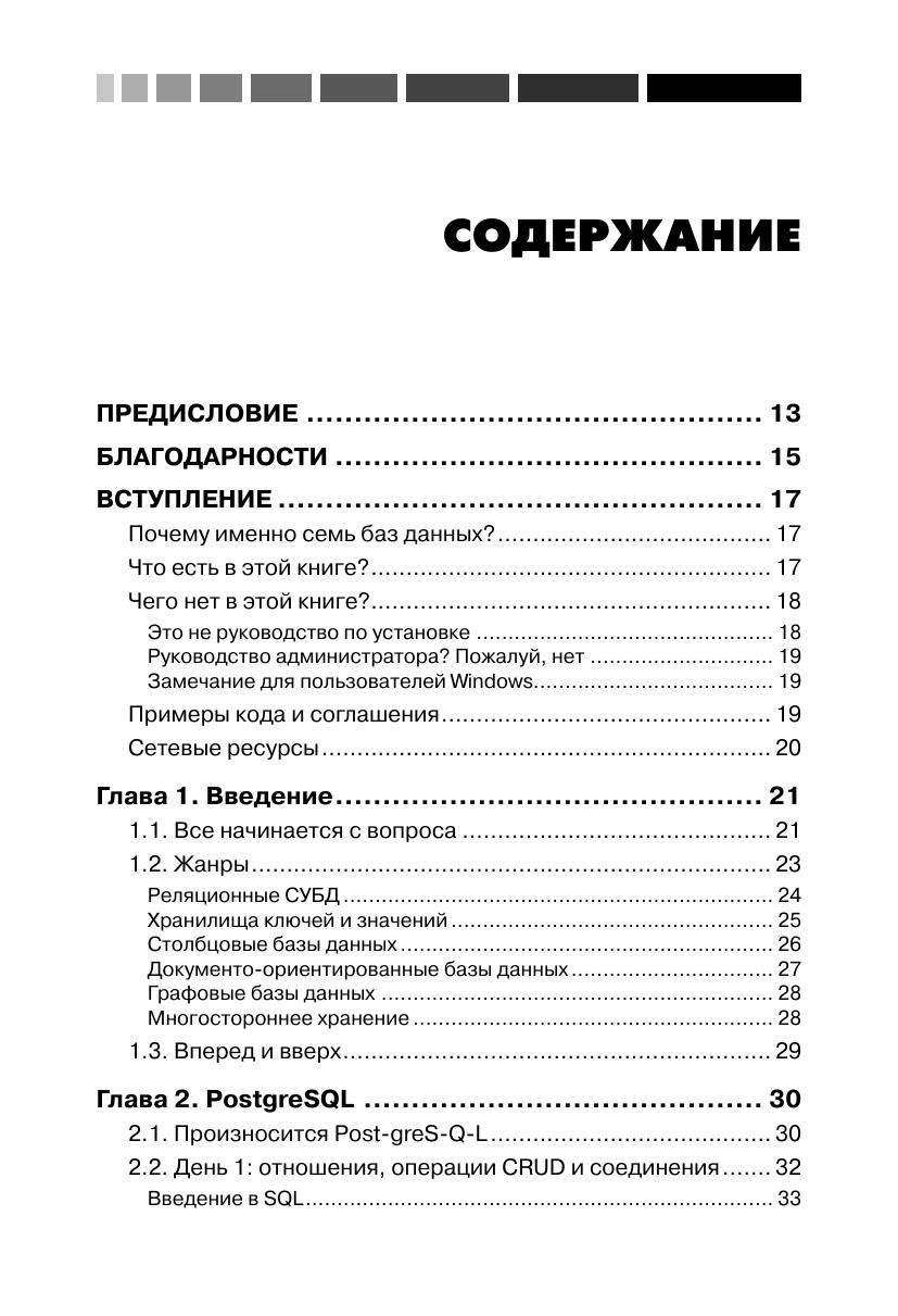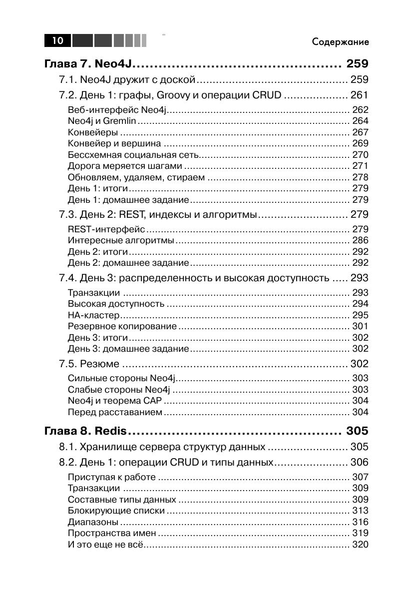 В книге описаны большинство из современных баз данных с открытым исходным кодом: Redis, Neo4J, CouchDB, MongoDB, HBase, PostgreSQL и Riak. Для каждой базы приведены примеры работы с реальными данными, демонстрирующие основные идеи и сильные стороны. Эта книга прольет свет на сильные и слабые стороны каждой из семи баз данных и научит вас выбирать ту, которая лучше отвечает требованиям. Издание предназначено для программистов разной квалификации, использующих базы данных в своей профессиональной деятельности.
