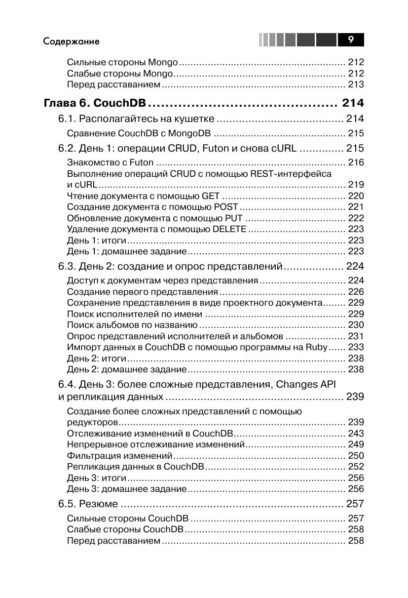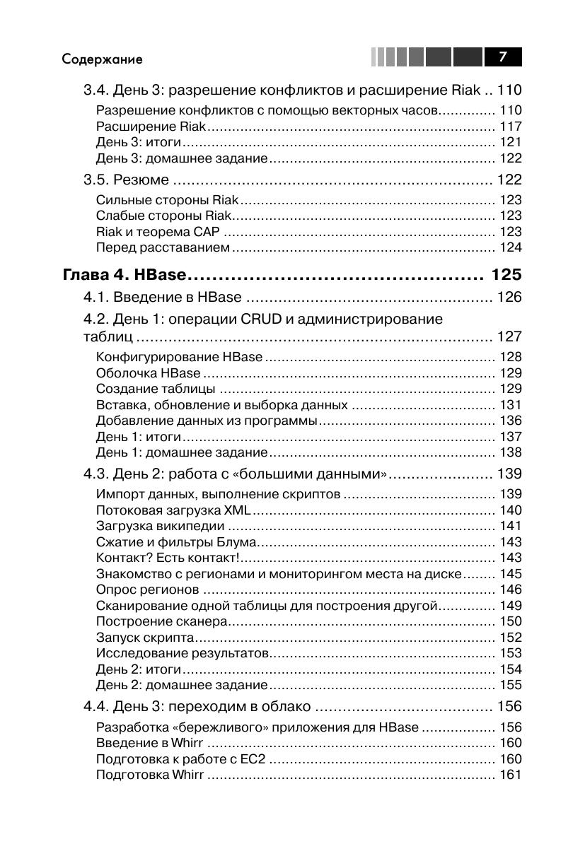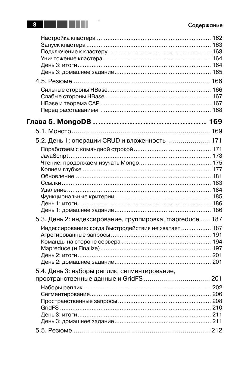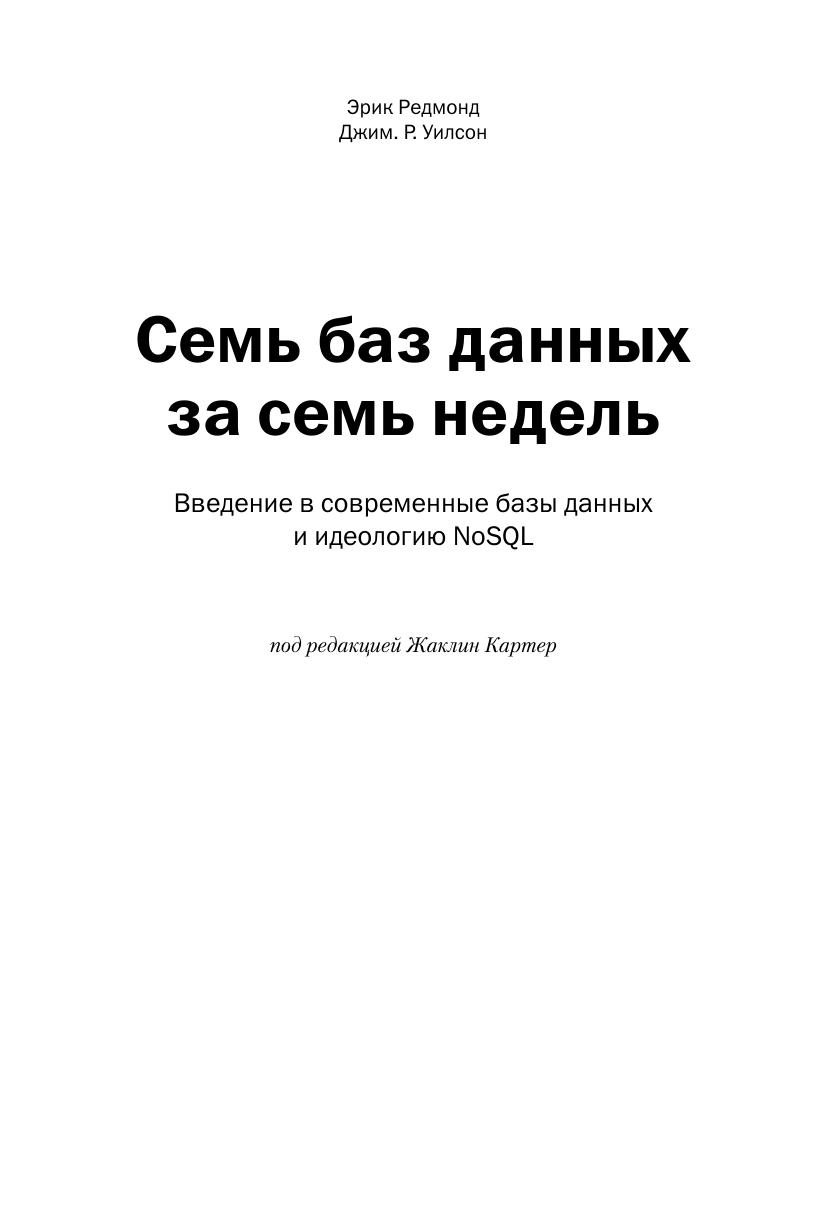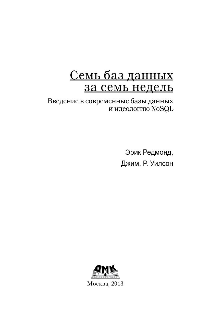 В книге описаны большинство из современных баз данных с открытым исходным кодом: Redis, Neo4J, CouchDB, MongoDB, HBase, PostgreSQL и Riak. Для каждой базы приведены примеры работы с реальными данными, демонстрирующие основные идеи и сильные стороны. Эта книга прольет свет на сильные и слабые стороны каждой из семи баз данных и научит вас выбирать ту, которая лучше отвечает требованиям. Издание предназначено для программистов разной квалификации, использующих базы данных в своей профессиональной деятельности.