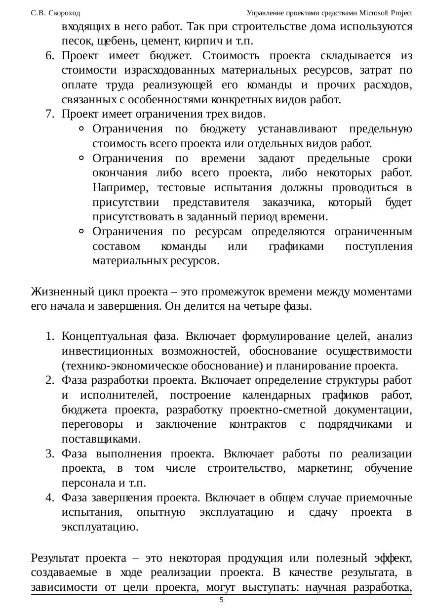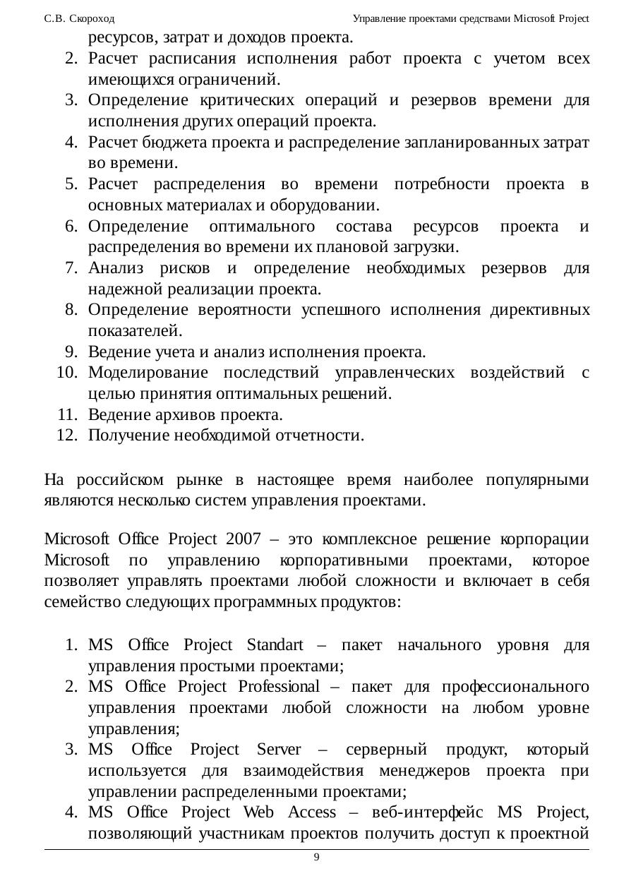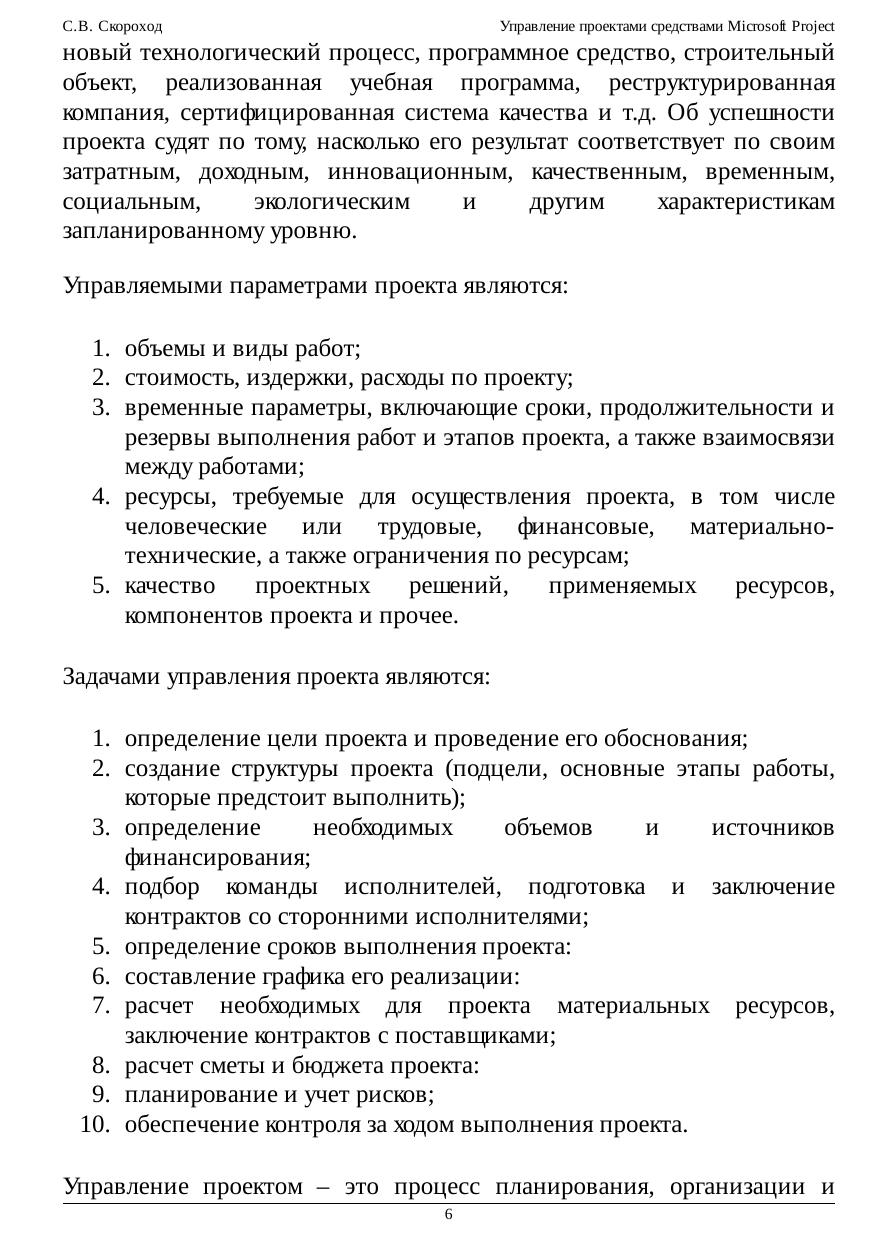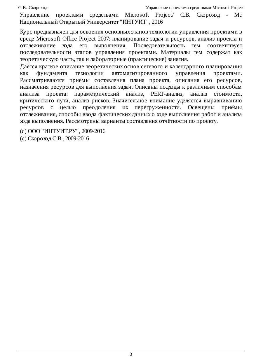 последовательности этапов управления проектами. Материалы тем содержат как теоретическую часть, так и лабораторные (практические) занятия. Даётся краткое описание теоретических основ сетевого и календарного планирования как фундамента технологии автоматизированного управления проектами. Рассматриваются приёмы составления плана проекта, описания его ресурсов, назначения ресурсов для выполнения задач. Описаны подходы к различным способам анализа проекта: параметрический анализ, PERT-анализ, анализ стоимости, критического пути, анализ рисков. Значительное внимание уделяется выравниванию ресурсов с целью преодоления их перегруженности. Освещены приёмы отслеживания, способы ввода фактических данных о ходе выполнения работ и анализа хода выполнения. Рассмотрены варианты составления отчётности по проекту.