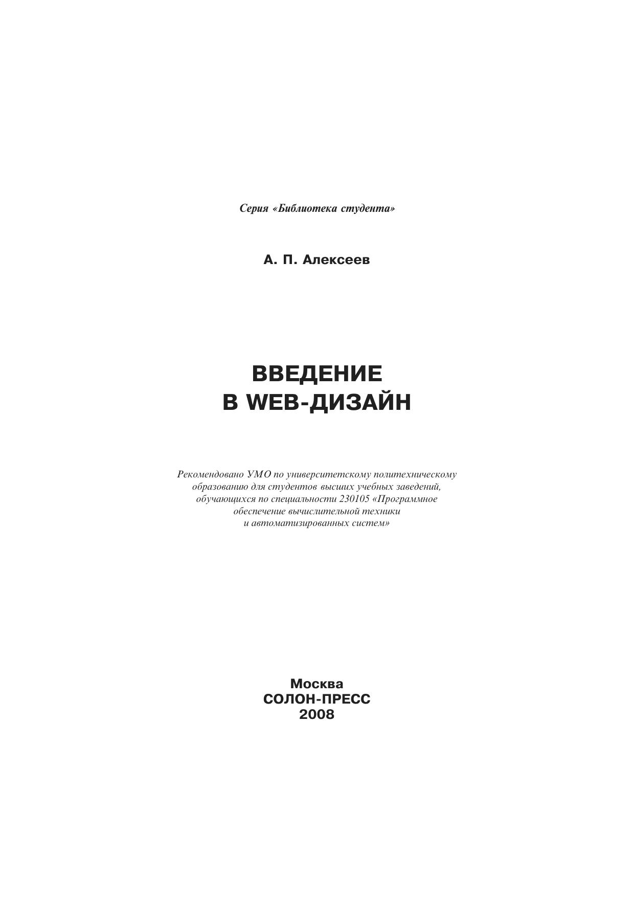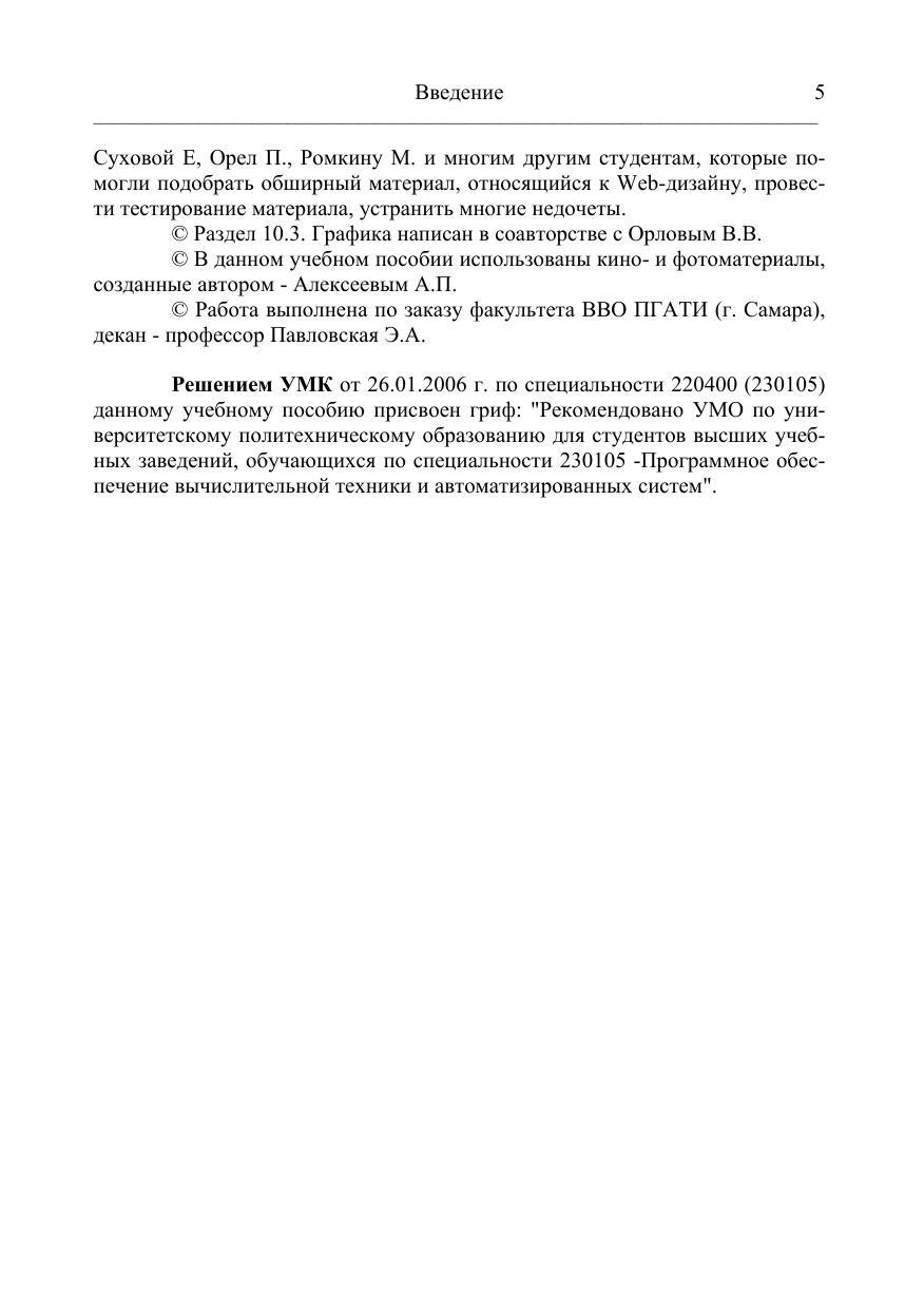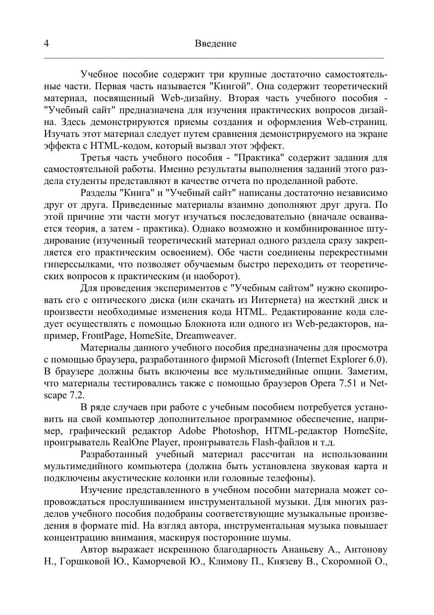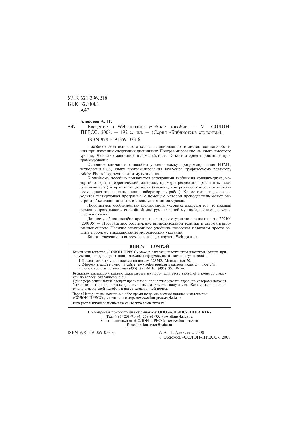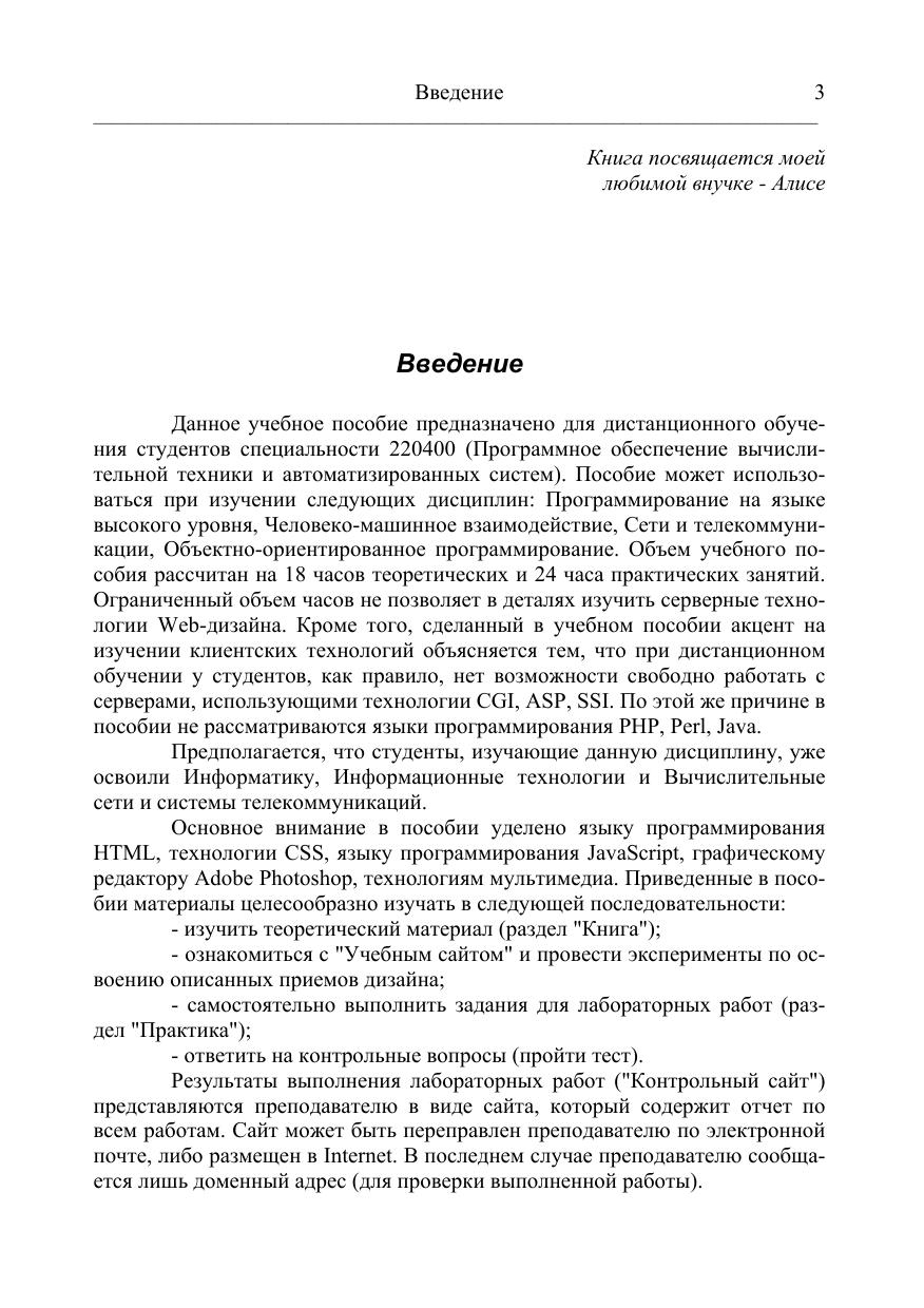 Пособие может использоваться для стационарного и дистанционного обучения при изучении следующих дисциплин: Программирование на языке высокого уровня, Человеко-машинное взаимодействие, Объектно-ориентированное программирование.Основное внимание в пособии уделено языку программирования HTML, технологии CSS, языку программирования JavaScript, графическому редактору Adobe Photoshop, технологии мультимедиа.К учебному пособию прилагается электронный учебник на компакт-диске,ко-торый содержит теоретический материал, примеры реализации различных задач (учебный сайт) и практическую часть (задания, контрольные вопросы и методические указания на выполнение лабораторных работ). Кроме того, на диске находится тестирующая программа, с помощью которой преподаватель может быстро и объективно оценить степень усвоения материала.Любопытной особенностью электронного учебника является то, что каждый раздел сопровождается спокойной инструментальной музыкой, создающей хорошее настроение.Данное учебное пособие предназначено для студентов специальности 220400 (230105) — Программное обеспечение вычислительной техники и автоматизированных систем. Наличие электронного учебника позволяет педагогам просто решить проблему тиражирования методических указаний. Книга незаменима для всех начинающих изучать Web-дизайн.