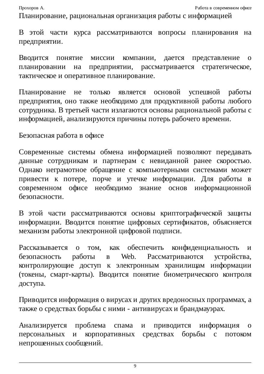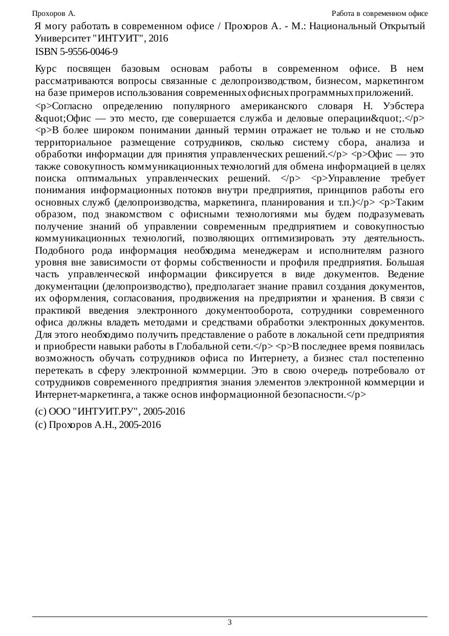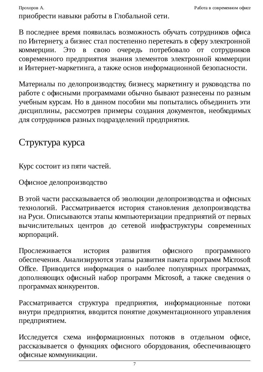 Курс посвящен базовым основам работы в современном офисе. В нем рассматриваются вопросы связанные с делопроизводством, бизнесом, маркетингом на базе примеров использования современных офисных программных приложений. Согласно определению популярного американского словаря Н. Уэбстера "Офис — это место, где совершается служба и деловые операции". В более широком понимании данный термин отражает не только и не столько территориальное размещение сотрудников, сколько систему сбора, анализа и обработки информации для принятия управленческих решений. Офис — это также совокупность коммуникационных технологий для обмена информацией в целях поиска оптимальных управленческих решений. Управление требует понимания информационных потоков внутри предприятия, принципов работы его основных служб (делопроизводства, маркетинга, планирования и т.п.) Таким образом, под знакомством с офисными технологиями мы будем подразумевать получение знаний об управлении современным предприятием и совокупностью коммуникационных технологий, позволяющих оптимизировать эту деятельность. Подобного рода информация необходима менеджерам и исполнителям разного уровня вне зависимости от формы собственности и профиля предприятия. Большая часть управленческой информации фиксируется в виде документов. Ведение документации (делопроизводство), предполагает знание правил создания документов, их оформления, согласования, продвижения на предприятии и хранения. В связи с практикой введения электронного документооборота, сотрудники современного офиса должны владеть методами и средствами обработки электронных документов. Для этого необходимо получить представление о работе в локальной сети предприятия и приобрести навыки работы в Глобальной сети. В последнее время появилась возможность обучать сотрудников офиса по Интернету, а бизнес стал постепенно перетекать в сферу электронной коммерции. Это в свою очередь потребовало от сотрудников современного предприятия знания элементов электронной коммерции и Интернет-маркетинга, а также основ информационной безопасности.