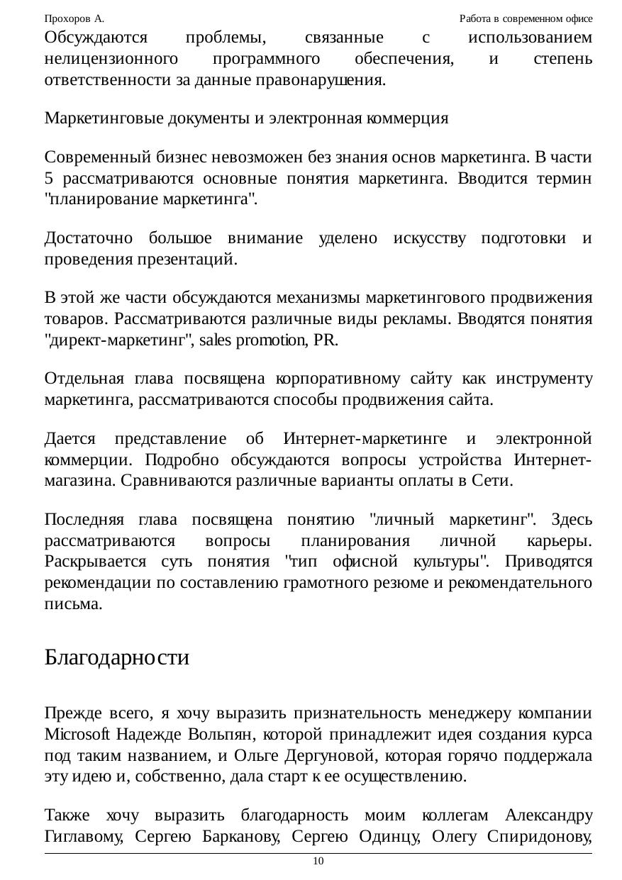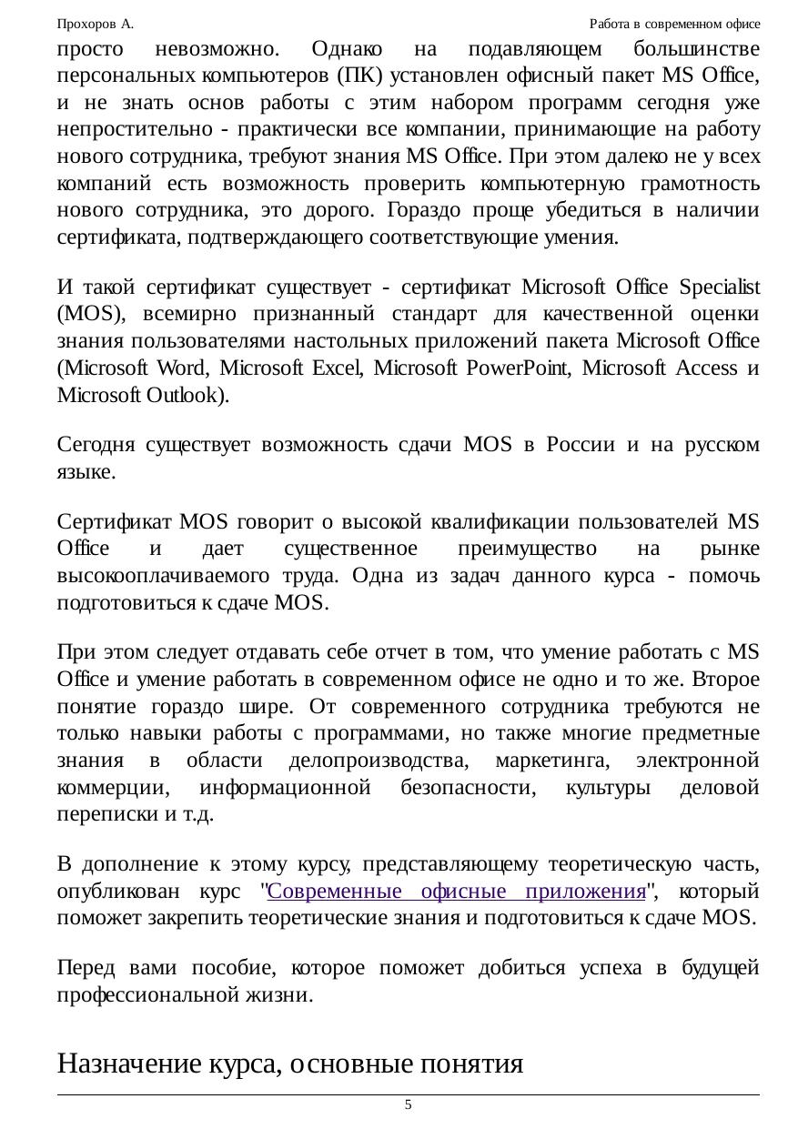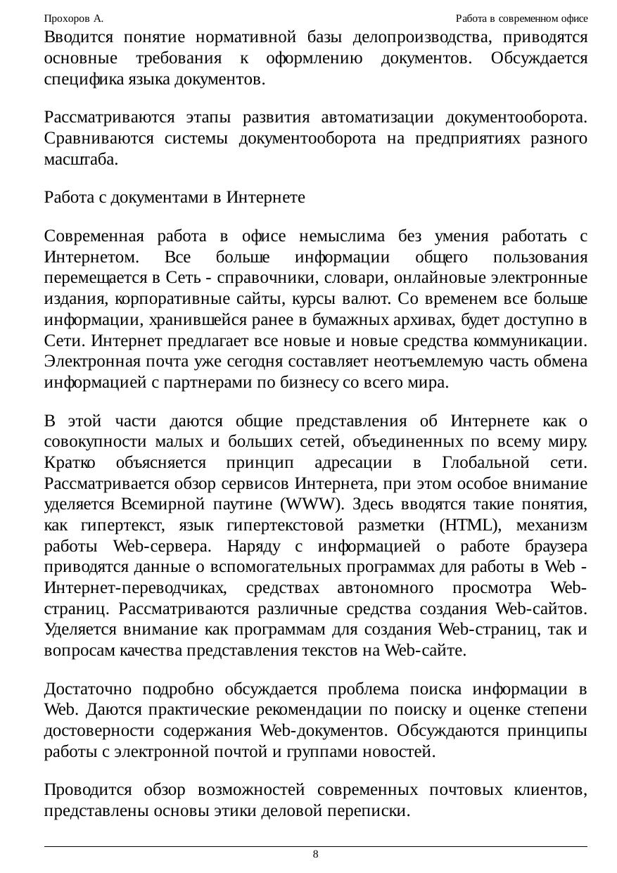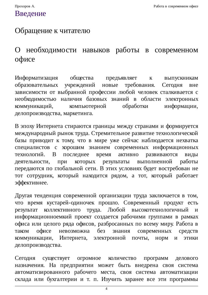 Курс посвящен базовым основам работы в современном офисе. В нем рассматриваются вопросы связанные с делопроизводством, бизнесом, маркетингом на базе примеров использования современных офисных программных приложений. Согласно определению популярного американского словаря Н. Уэбстера "Офис — это место, где совершается служба и деловые операции". В более широком понимании данный термин отражает не только и не столько территориальное размещение сотрудников, сколько систему сбора, анализа и обработки информации для принятия управленческих решений. Офис — это также совокупность коммуникационных технологий для обмена информацией в целях поиска оптимальных управленческих решений. Управление требует понимания информационных потоков внутри предприятия, принципов работы его основных служб (делопроизводства, маркетинга, планирования и т.п.) Таким образом, под знакомством с офисными технологиями мы будем подразумевать получение знаний об управлении современным предприятием и совокупностью коммуникационных технологий, позволяющих оптимизировать эту деятельность. Подобного рода информация необходима менеджерам и исполнителям разного уровня вне зависимости от формы собственности и профиля предприятия. Большая часть управленческой информации фиксируется в виде документов. Ведение документации (делопроизводство), предполагает знание правил создания документов, их оформления, согласования, продвижения на предприятии и хранения. В связи с практикой введения электронного документооборота, сотрудники современного офиса должны владеть методами и средствами обработки электронных документов. Для этого необходимо получить представление о работе в локальной сети предприятия и приобрести навыки работы в Глобальной сети. В последнее время появилась возможность обучать сотрудников офиса по Интернету, а бизнес стал постепенно перетекать в сферу электронной коммерции. Это в свою очередь потребовало от сотрудников современного предприятия знания элементов электронной коммерции и Интернет-маркетинга, а также основ информационной безопасности.