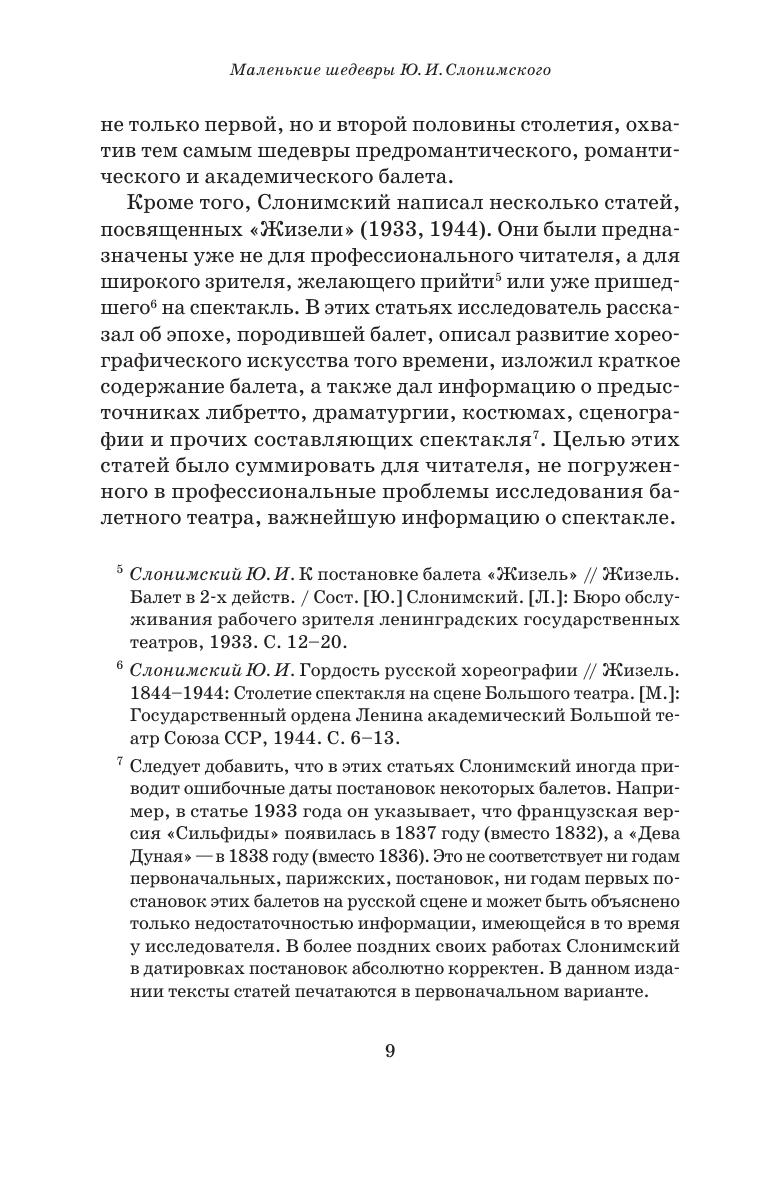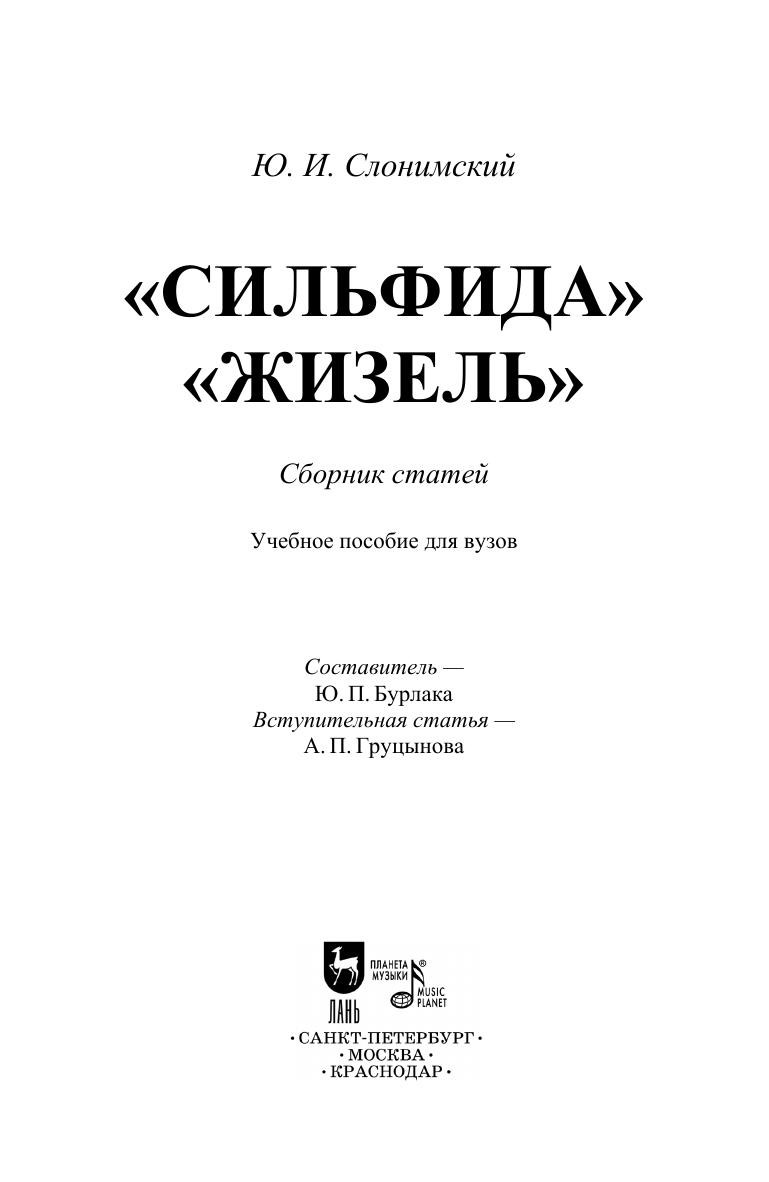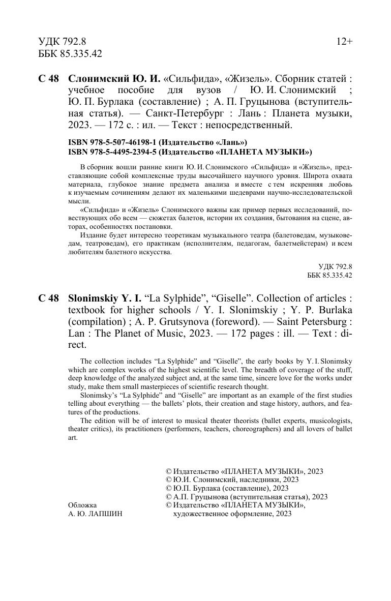 В сборник вошли ранние книги Ю. И. Слонимского «Сильфида» и «Жизель», представляющие собой комплексные труды высочайшего научного уровня. Широта охвата материала, глубокое знание предмета анализа и вместе с тем искренняя любовь к изучаемым сочинениям делают их маленькими шедеврами научно-исследовательской мысли. «Сильфида» и «Жизель» Слонимского важны как пример первых исследований, повествующих обо всем — сюжетах балетов, истории их создания, бытования на сцене, авторах, особенностях постановки. Издание будет интересно теоретикам музыкального театра (балетоведам, музыковедам, театроведам), его практикам (исполнителям, педагогам, балетмейстерам) и всем любителям балетного искусства. The collection includes “La Sylphide” and “Giselle”, the early books by Y. I. Slonimsky which are complex works of the highest scientific level. The breadth of coverage of the stuff, deep knowledge of the analyzed subject and, at the same time, sincere love for the works under study, make them small masterpieces of scientific research thought. Slonimsky’s “La Sylphide” and “Giselle” are important as an example of the first studies telling about everything — the ballets’ plots, their creation and stage history, authors, and features of the productions. The edition will be of interest to musical theater theorists (ballet experts, musicologists, theater critics), its practitioners (performers, teachers, choreographers) and all lovers of ballet art.