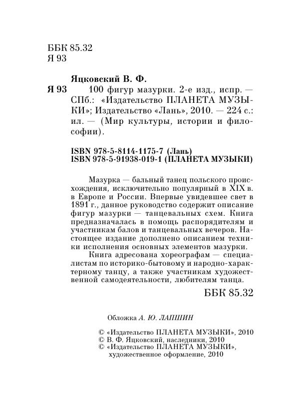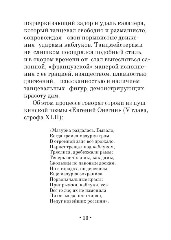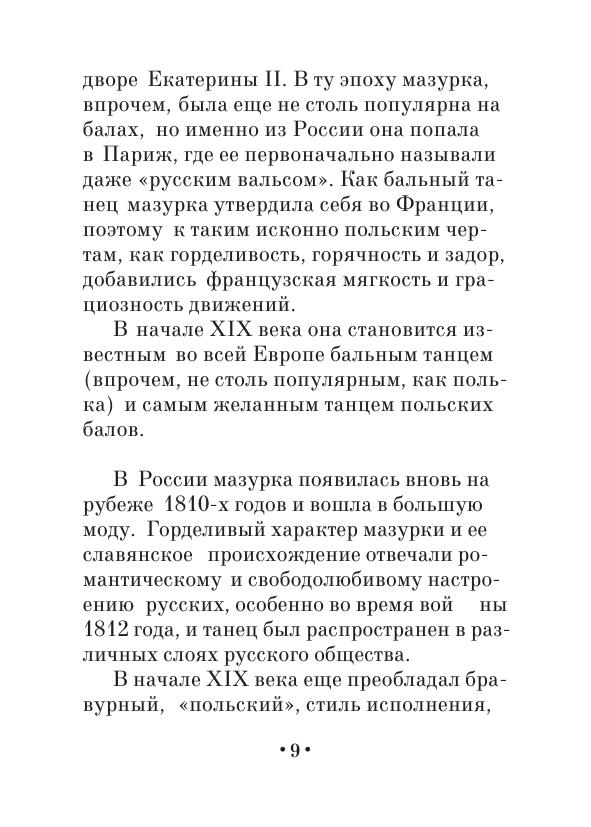 Мазурка — бальный танец польского происхождения, исключительно популярный в XIX в. в Европе и России. Впервые увидевшее свет в 1891 г., данное руководство содержит описание фигур мазурки — танцевальных схем. Книга предназначалась в помощь распорядителям и участникам балов и танцевальных вечеров. Настоящее издание дополнено описанием техники исполнения основных элементов мазурки. Книга адресована хореографам — специалистам по историко-бытовому и народно-характерному танцу, а также участникам художественной самодеятельности, любителям танца.