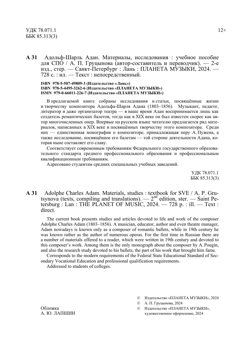В предлагаемой книге собраны исследования и статьи, посвящённые жизни и творчеству композитора Адольфа-Шарля Адана (1803–1856). Музыкант, педагог, литератор и даже организатор театра — в наше время Адан воспринимается лишь как создатель романтических балетов, тогда как в XIX веке он был известен скорее как автор многочисленных опер. Впервые на русском языке читателю предлагается ряд материалов, написанных в XIX веке и посвящённых творчеству этого композитора. Среди них — единственная монография о композиторе, принадлежащая перу А. Пужена, а также исследование, посвящённое его балетам — той стороне деятельности Адана, которая ныне составляет его славу. Соответствует современным требованиям Федерального государственного образова-тельного стандарта среднего профессионального образования и профессиональным квалификационным требованиям. Адресовано студентам средних специальных учебных заведений. The current book presents studies and articles devoted to life and work of the composer Adolphe Charles Adam (1803–1856). A musician, educator, author and even theatre manager, Adam nowadays is known only as a composer of romantic ballets, while in 19th century he was known rather as the author of numerous operas. For the first time in Russian there are a number of materials offered to a reader, which were written in 19th century and devoted to this composer’s work. Among them is the only monograph about the composer by A. Pougin, and also the research study devoted to his ballets, the part of his work that brought him fame. Corresponds to the modern requirements of the Federal State Educational Standard of Sec-ondary Vocational Education and professional qualification requirements. Addressed to students of colleges.