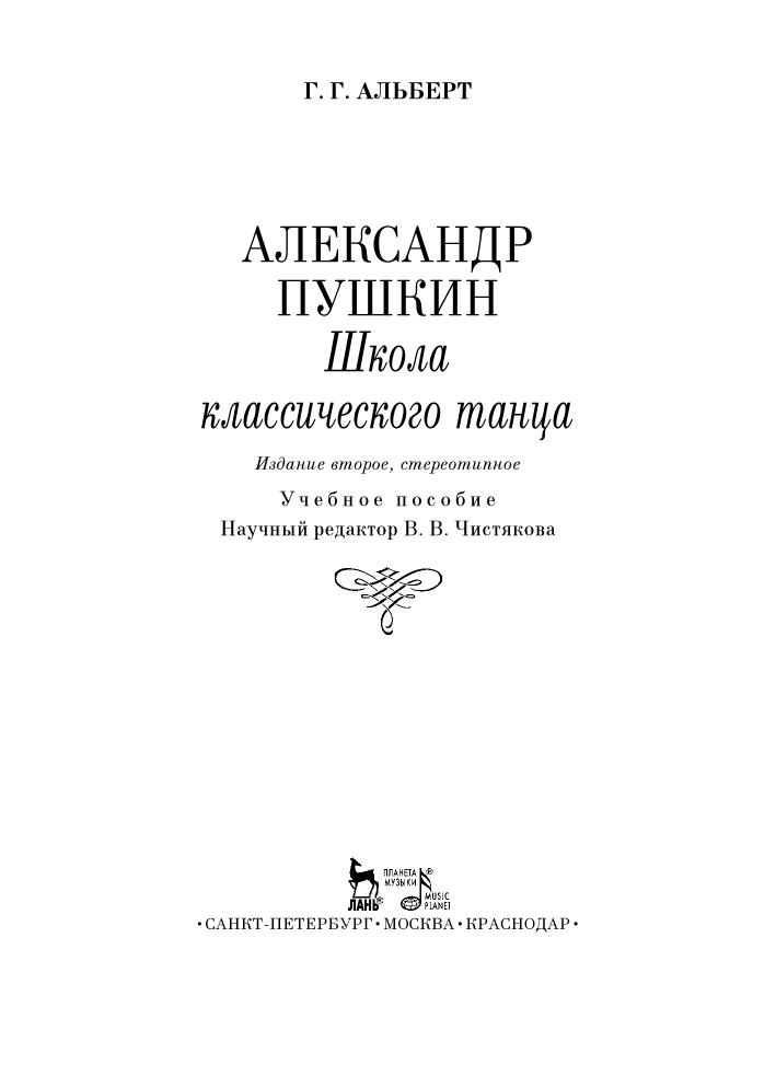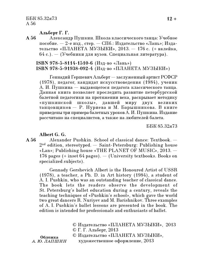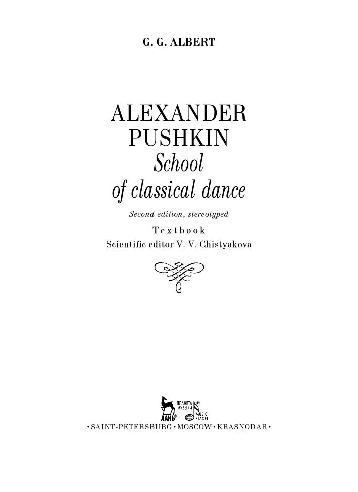 Gennady Gershevich Albert is the Honoured Artist of USSR (1978), a teacher, a Ph. D. in Art history (1984), a student of A. I. Pushkin, who was an outstanding teacher of classical dance. The book lets the readers observe the development of St. Petersburg’s ballet education during a century, reveals the teaching techniques of «Pushkin’s school», which gave the world two great dancers R. Nuriyev and M. Barishnikov. Three examples of A. I. Pushkin’s ballet lessons are presented in the book. The edition is intended for professionals and enthusiasts of ballet.