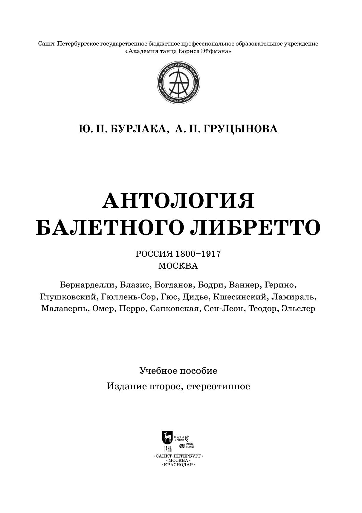 Антология балетного либретто. Россия 1800-1917. Москва. Бернарделли, Блазис, Богданов, Бодри, Ваннер, Герино, Глушковский, Гюллень-Сор, Гюс, Дидье, Кшесинский, Ламираль, Малавернь, Омер, Перро, Санковская, Сен-Леон, Теодор (Шион), Эльслер
