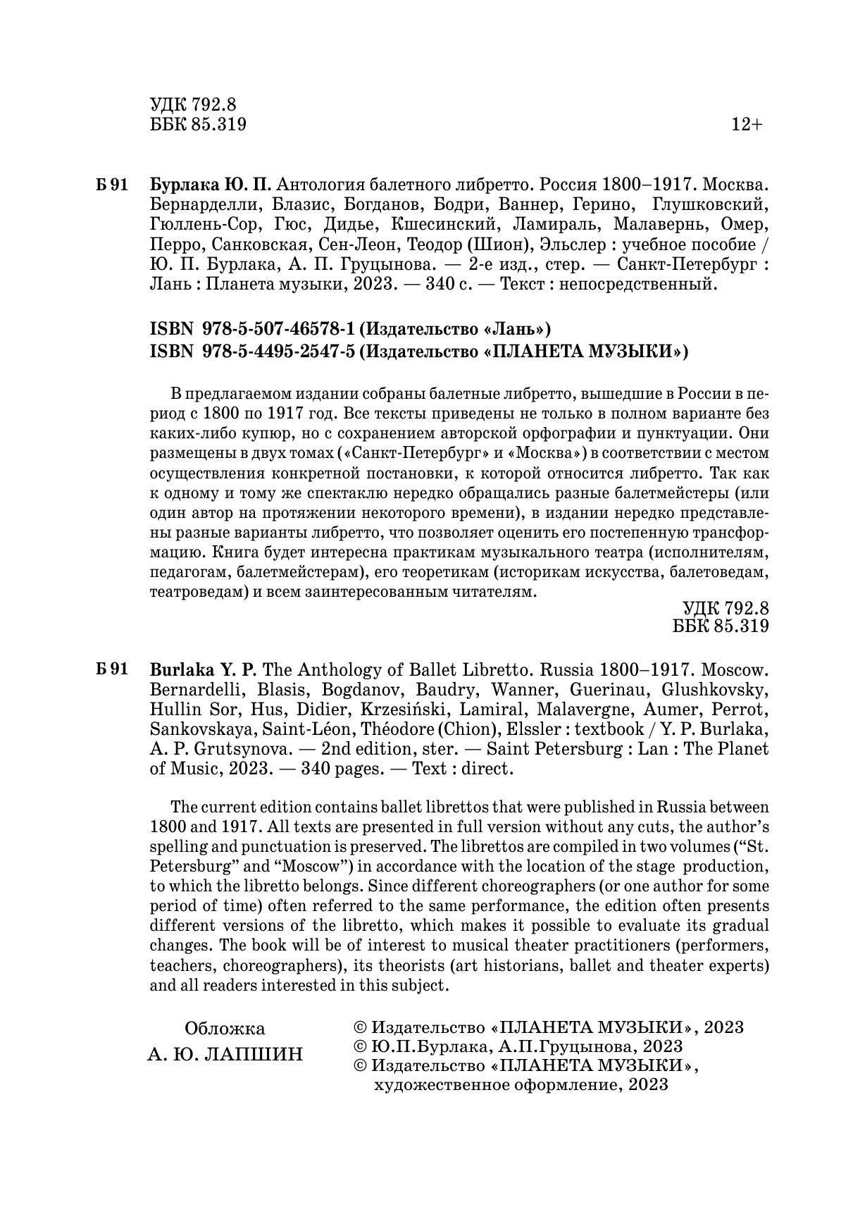 В предлагаемом издании собраны балетные либретто, вышедшие в России в период с 1800 по 1917 год. Все тексты, размещённые в нём, приведены не только в полном варианте без каких-либо купюр, но с сохранением авторской орфографии и пунктуации. Они размещены в двух томах («Санкт-Петербург» и «Москва») в соответствии с местом осуществления конкретной постановки, к которой относится либретто. Так как к одному и тому же спектаклю нередко обращались разные балетмейстеры (или один автор на протяжении некоторого времени), в издании нередко представлены разные варианты либретто, что позволяет оценить его постепенную трансформацию. Книга будет интересна практикам музыкального театра (исполнителям, педагогам, балетмейстерам), его теоретикам (историкам искусства, балетоведам, театроведам) и всем заинтересованным читателям.