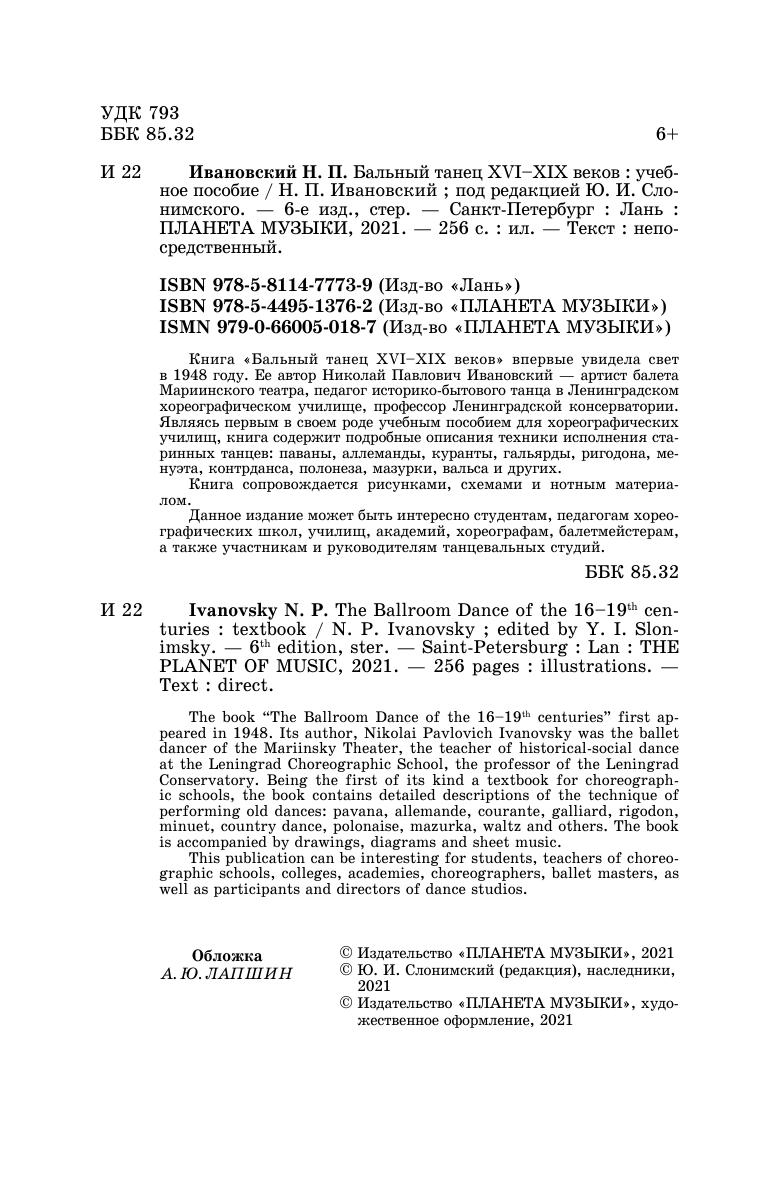 Книга «Бальный танец XVI — XIX веков» впервые увидела свет в 1948 году. Ее автор Николай Павлович Ивановский (1893–1961) — артист балета Мариинского театра, педагог историко-бытового танца в Ленинградском хореографическом училище, профессор Ленинградской консерватории. Являясь первым в своем роде учебным пособием для хореографических училищ, книга содержит подробные описания техники исполнения старинных танцев: паваны, алеманды, куранты, гальярды, ригодона, менуэта, контрданса, полонеза, мазурки, вальса и других.