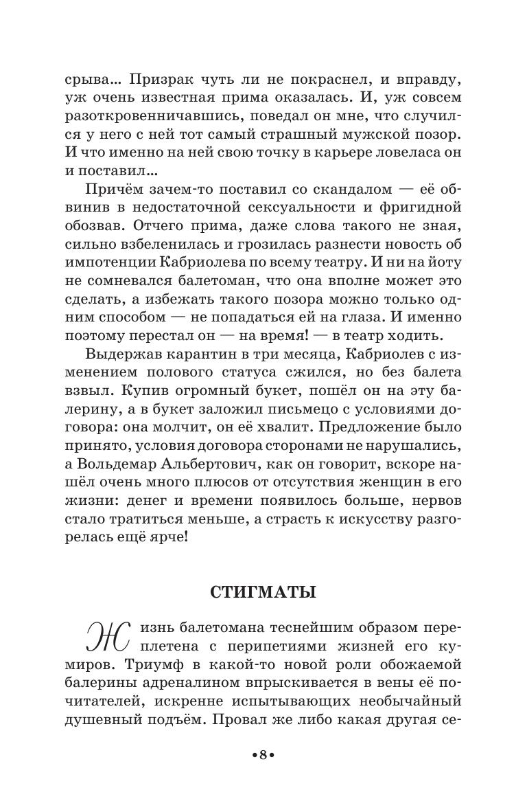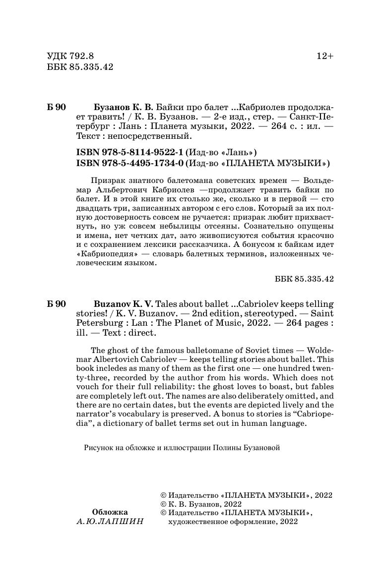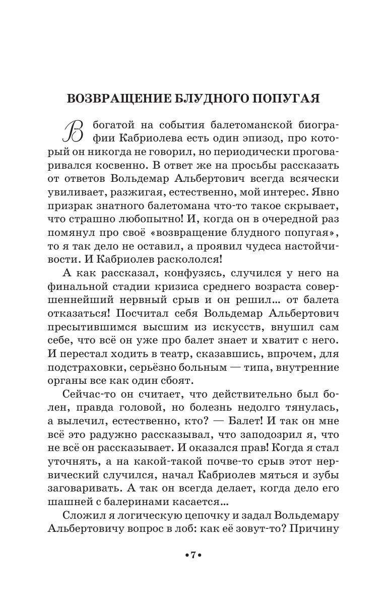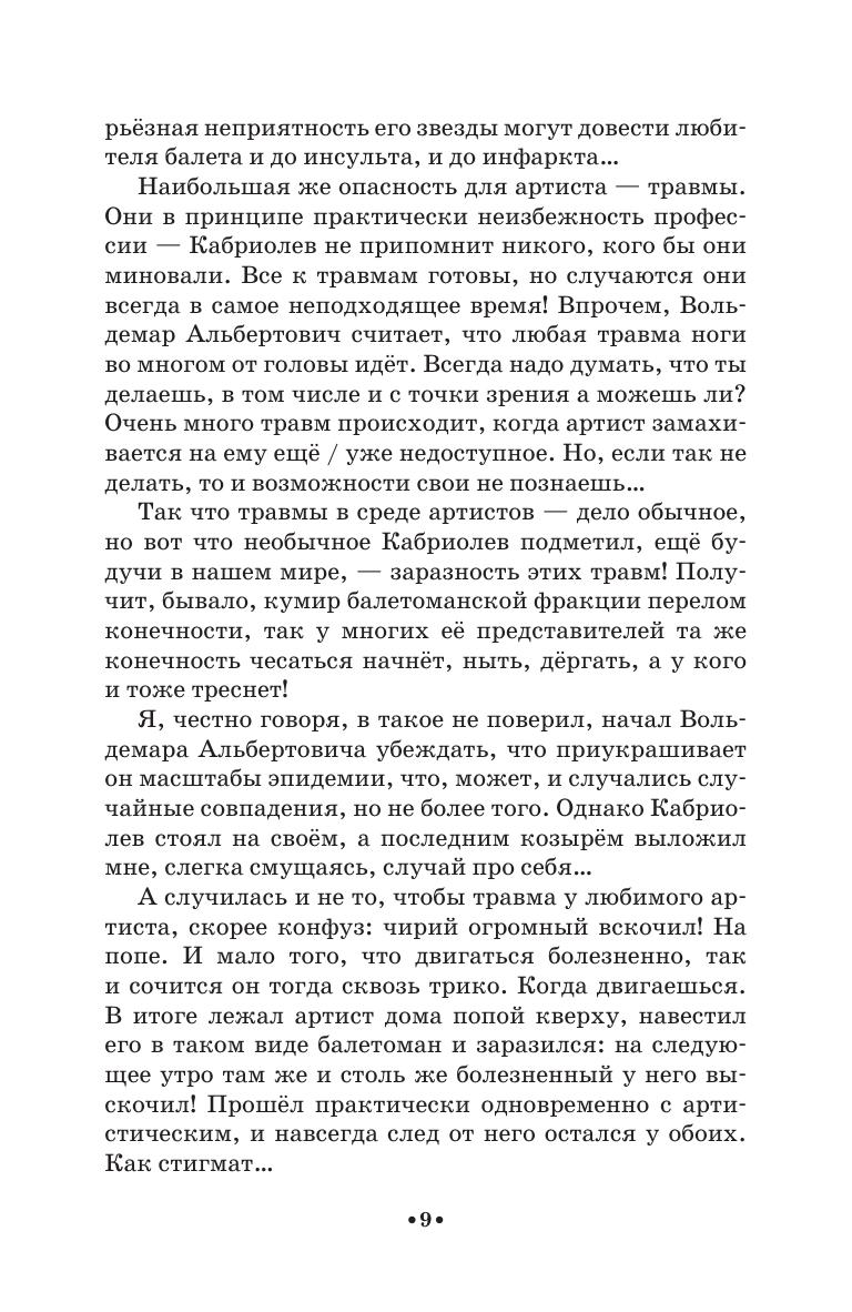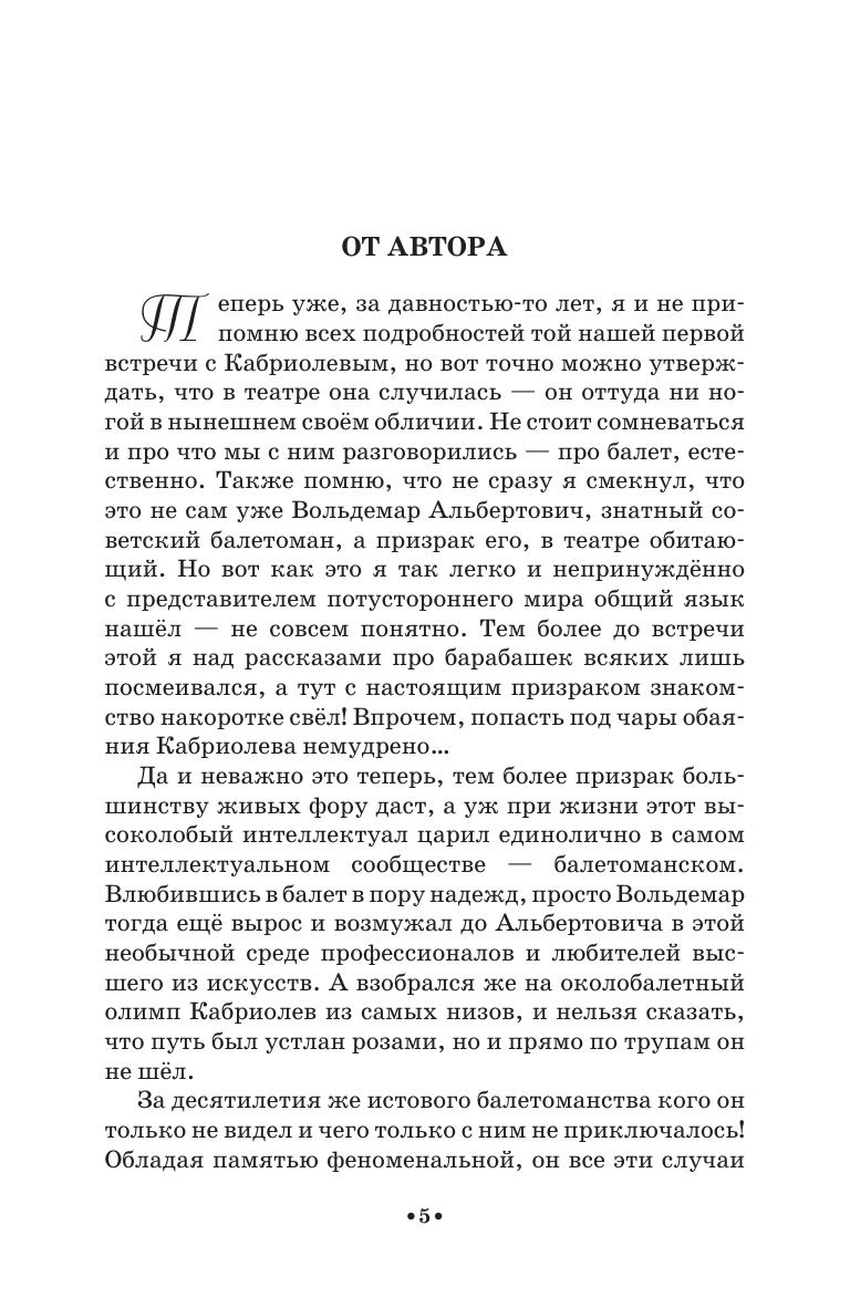 Призрак знатного балетомана советских времён — Вольдемар Альбертович Кабриолев —продолжает травить байки по балет. И в этой книге их столько же, сколько и в первой — сто двадцать три, записанных автором с его слов. Который за их полную достоверность совсем не ручается: призрак любит прихвастнуть, но уж совсем небылицы отсеяны. Сознательно опущены и имена, нет чётких дат, зато живописуются события красочно и с сохранением лексики рассказчика. А бонусом к байкам идёт «Кабриопедия» — словарь балетных терминов, изложенных человеческим языком.