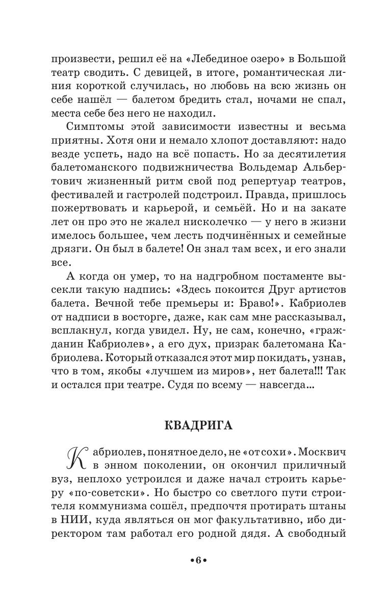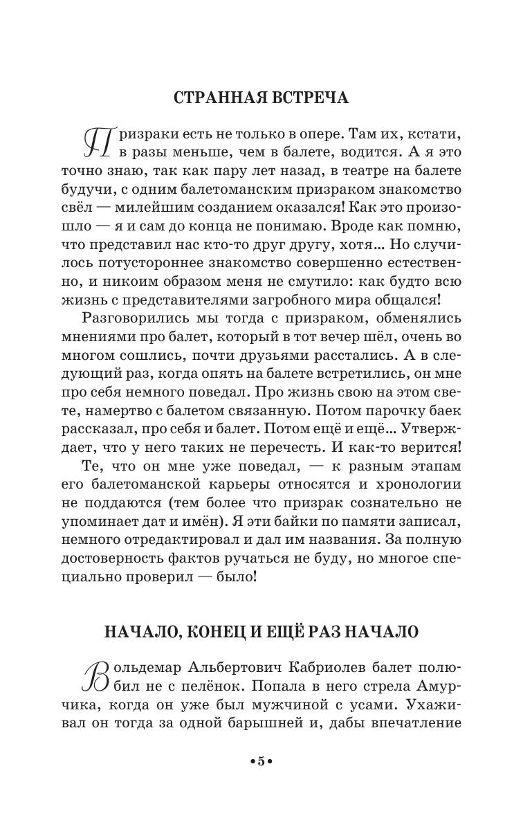 В книге содержится сто двадцать три байки, которые записаны со слов призрака Кабриолева. Все они про балет и около него, в той или иной степени, но вот имён Вольдемар Альбертович никогда не называет, хотя про многих и так понятно. Хронология отсутствует, но мелькают привязки к конкретным событиям. И всё привязано к одному конкретному месту, где сейчас призрак балетомана и обитает – к Большому театру.