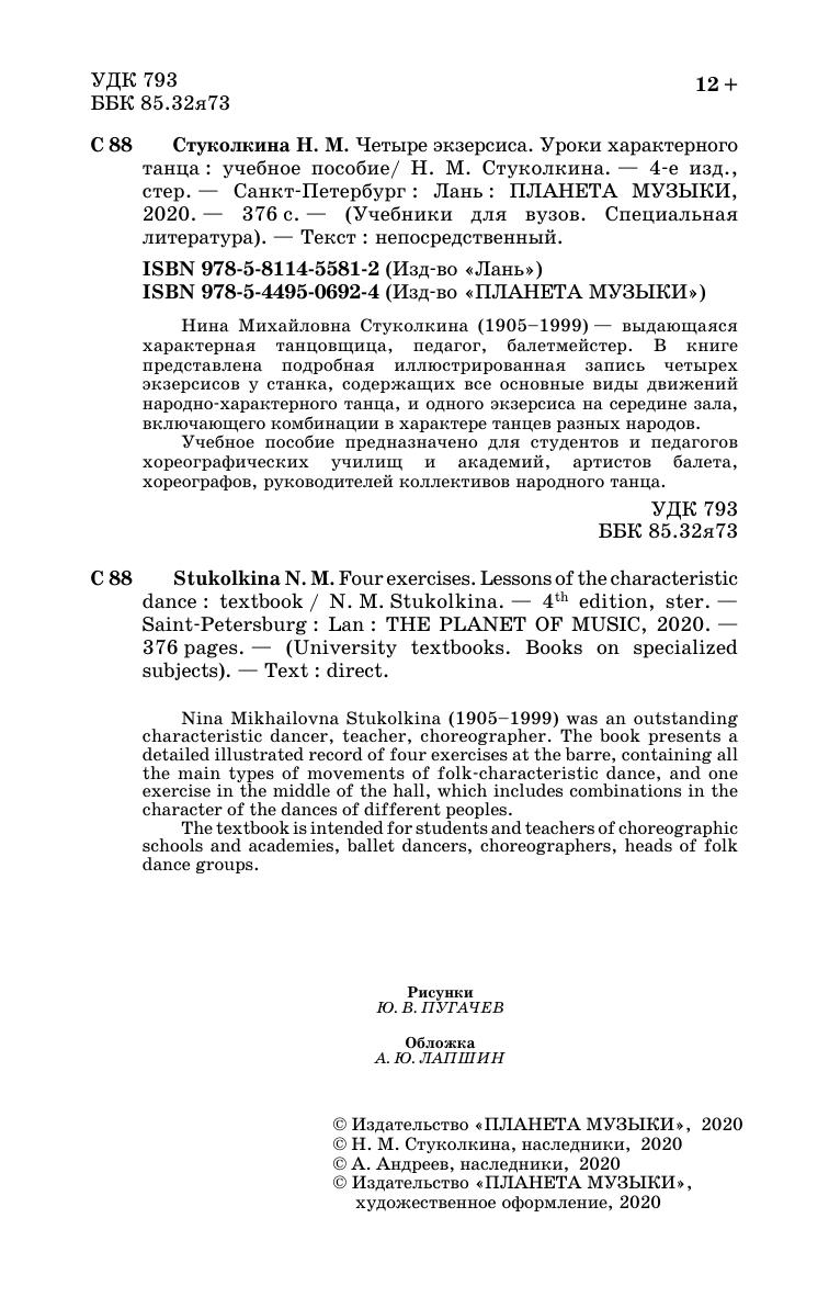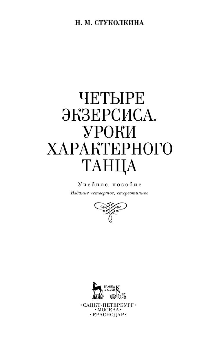 Нина Михайловна Стуколкина (1905–1999) — выдающаяся характерная танцовщица, педагог, балетмейстер. В книге представлена подробная иллюстрированная запись четырех экзерсисов у станка, содержащих все основные виды движений народно-характерного танца, и одного экзерсиса на середине зала, включающего комбинации в характере танцев разных народов.