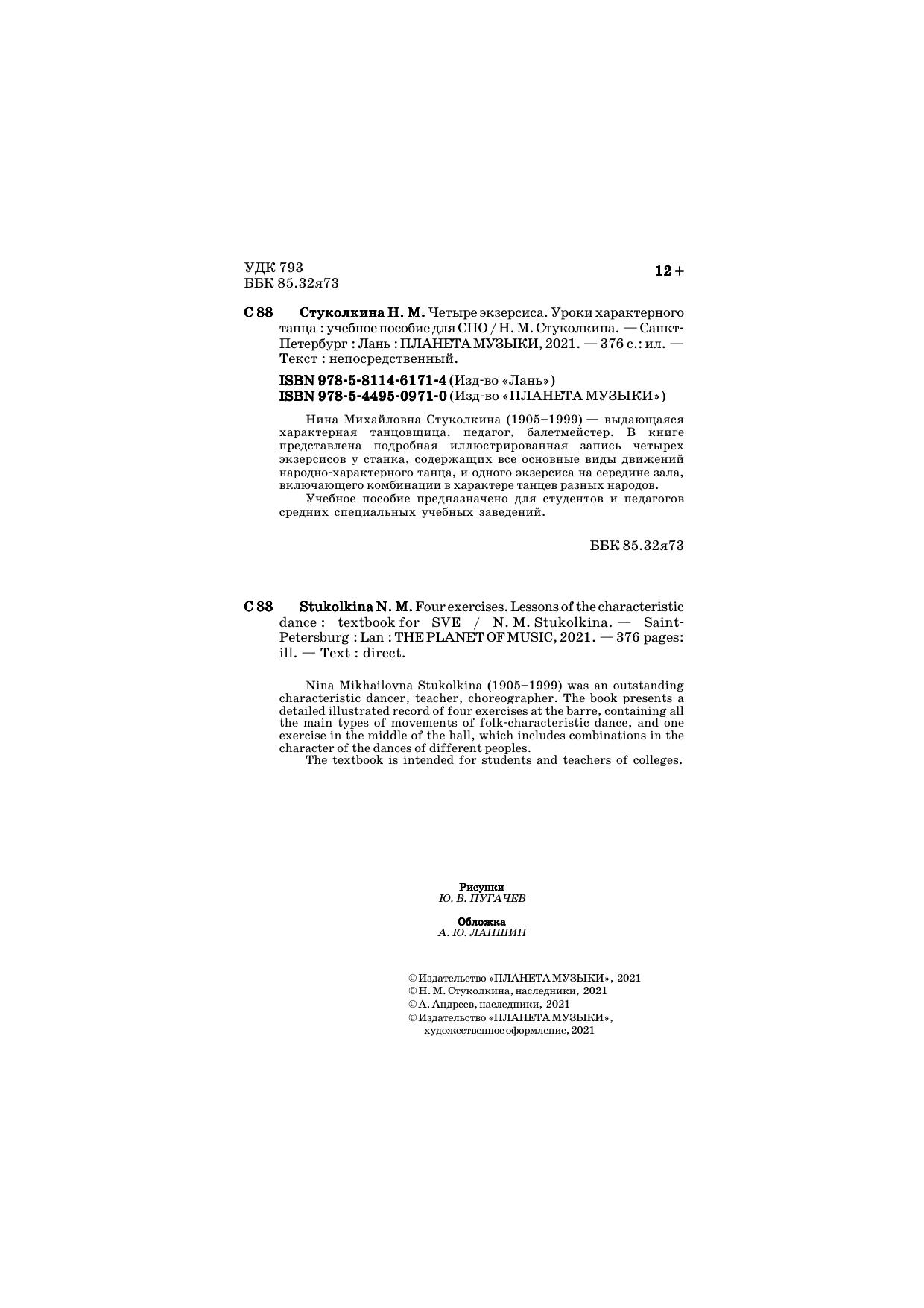 Нина Михайловна Стуколкина (1905–1999) – выдающаяся характерная танцовщица, педагог, балетмейстер. В книге представлена подробная иллюстрированная запись четырех экзерсисов у станка, содержащих все основные виды движений народно-характерного танца, и одного экзерсиса на середине зала, включающего комбинации в характере танцев разных народов. Учебное пособие предназначено для студентов и педагогов средних специальных учебных заведений.