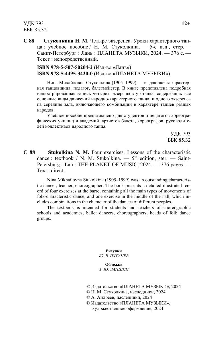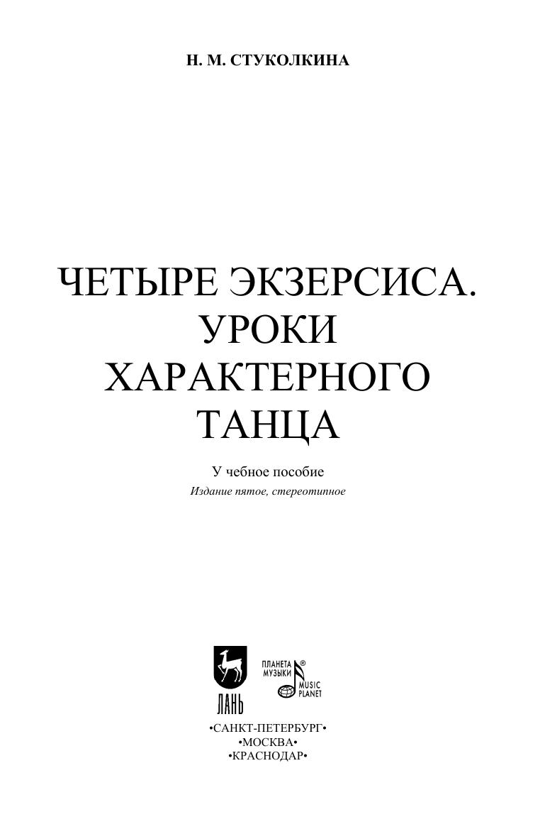 Нина Михайловна Стуколкина (1905–1999) – выдающаяся характерная танцовщица, педагог, балетмейстер. В книге представлена подробная иллюстрированная запись четырех экзерсисов у станка, содержащих все основные виды движений народно-характерного танца, и одного экзерсиса на середине зала, включающего комбинации в характере танцев разных народов. Учебное пособие предназначено для студентов и педагогов хореографических училищ и академий, артистов балета, хореографов, руководителей коллективов народного танца. Nina Mikhailovna Stukolkina (1905–1999) was an outstanding characteristic dancer, teacher, choreographer. The book presents a detailed illustrated record of four exercises at the barre, containing all the main types of movements of folk-characteristic dance, and one exercise in the middle of the hall, which includes combinations in the character of the dances of different peoples. The textbook is intended for students and teachers of choreographic schools and academies, ballet dancers, choreographers, heads of folk dance groups.