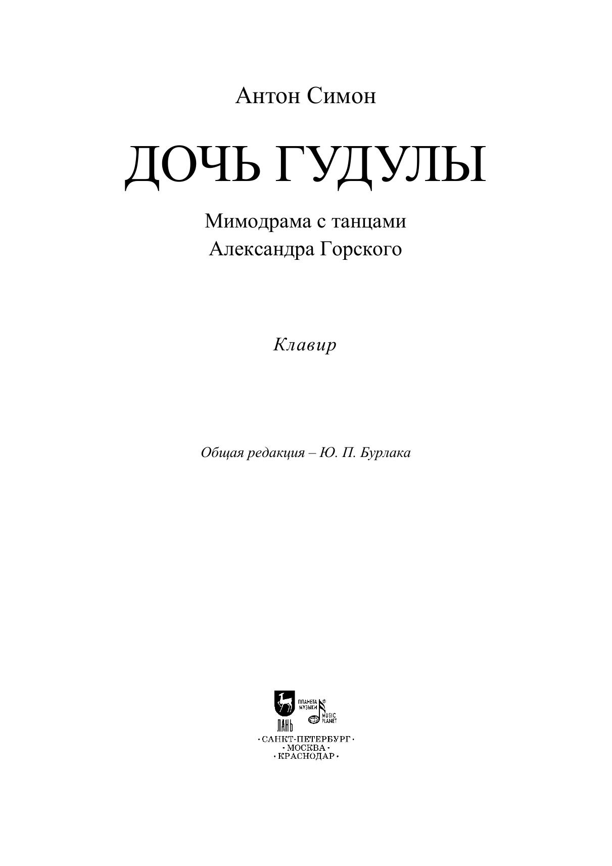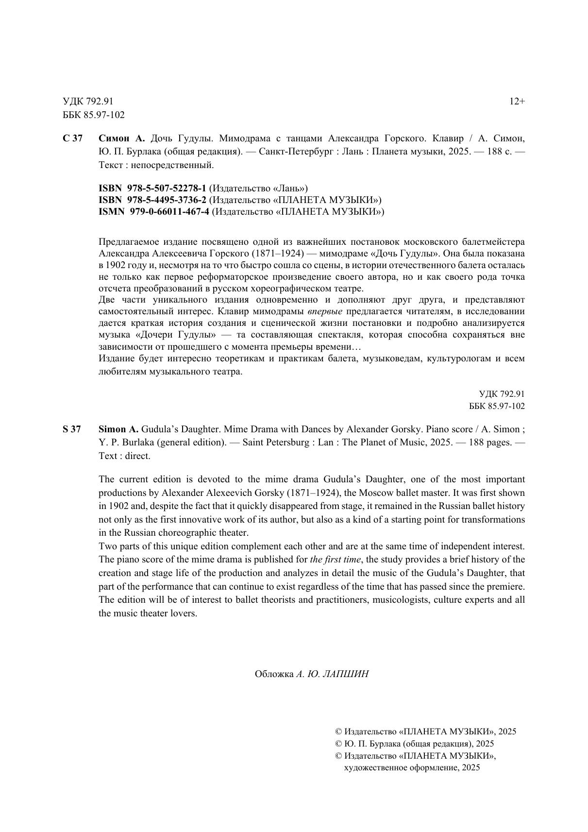 Предлагаемое издание посвящено одной из важнейших постановок московского балетмейстера Александра Алексеевича Горского (1871–1924) — мимодраме «Дочь Гудулы». Она была показана в 1902 году и, несмотря на то что быстро сошла со сцены, в истории отечественного балета осталась не только как первое реформаторское произведение своего автора, но и как своего рода точка отсчёта преобразований в русском хореографическом театре. Две части уникального издания одновременно и дополняют друг друга, и представляют самостоятельный интерес. Клавир мимодрамы впервые предлагается читателям, в исследовании даётся краткая история создания и сценической жизни постановки и подробно анализируется музыка «Дочери Гудулы» — та составляющая спектакля, которая способна сохраняться вне зависимости от прошедшего со времени премьеры времени. Издание будет интересно теоретикам и практикам балета, музыковедам, культурологам и всем любителям музыкального театра. The current edition is devoted to the mime drama Gudula’s Daughter, one of the most important productions by Alexander Alexeevich Gorsky (1871–1924), the Moscow ballet master. It was first shown in 1902 and, despite the fact that it quickly disappeared from stage, it remained in the Russian ballet history not only as the first innovative work of its author, but also as a kind of a starting point for transformations in the Russian choreographic theater. Two parts of this unique edition complement each other and are at the same time of independent interest. The piano score of the mime drama is published for the first time, the study provides a brief history of the creation and stage life of the production and analyzes in detail the music of the Gudula’s Daughter, that part of the performance that can continue to exist regardless of the time that has passed since the premiere. The edition will be of interest to ballet theorists and practitioners, musicologists, culture experts and all the music theater lovers.