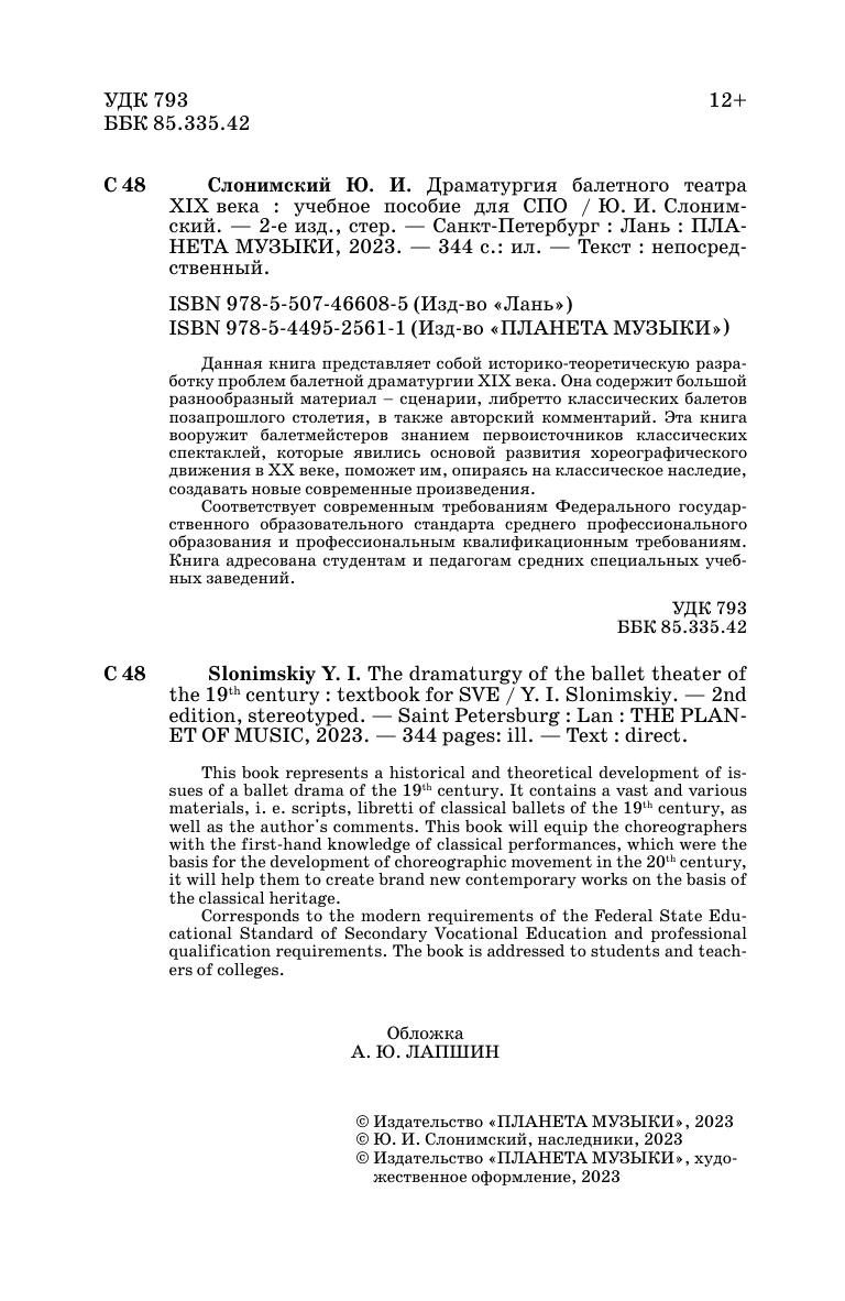 Данная книга представляет собой историко-теоретическую разработку проблем балетной драматургии XIX века. Она содержит большой разнообразный материал – сценарии, либретто классических балетов позапрошлого столетия, в также авторский комментарий. Эта книга вооружит балетмейстеров знанием первоисточников классических спектаклей, которые явились основой развития хореографического движения в XX веке, поможет им, опираясь на классическое наследие, создавать новые современные произведения. Соответствует современным требованиям Федерального государственного образовательного стандарта среднего профессионального образования и профессиональным квалификационным требованиям. Книга адресована студентам и педагогам средних специальных учебных заведений. This book represents a historical and theoretical development of issues of a ballet drama of the XIX century. It contains a vast and various materials, i.e. scripts, libretti of classical ballets of the XIX century, as well as the author's comments. This book will equip the choreographers with the first-hand knowledge of classical performances, which were the basis for the development of choreographic movement in the XX century, it will help them to create brand new contemporary works on the basis of the classical heritage. Corresponds to the modern requirements of the Federal State Educational Standard of Secondary Vocational Education and professional qualification requirements. The book is addressed to students and teachers of colleges.