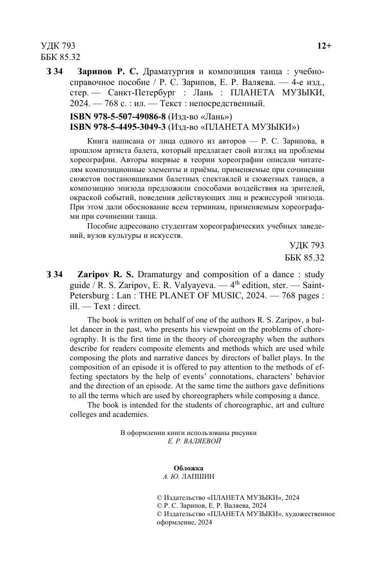 Книга написана от лица одного из авторов — Зарипова Р. С., в прошлом артиста балета, который предлагает свой взгляд на проблемы хореографии. Авторы впервые в теории хореографии описали читателям композиционные элементы и приёмы, применяемые при сочинении сюжетов постановщиками балетных спектаклей и сюжетных тан-цев, а в композиции эпизода предлагают обратить внимание на способы воздействия на зрителей, окраской событий, поведения действующих лиц и режиссурой эпизода. При этом дали обоснование всем терминам, применяемым хореографами при сочинении танца. Пособие адресовано студентам хореографических учебных заведений, вузов культуры и искусств.