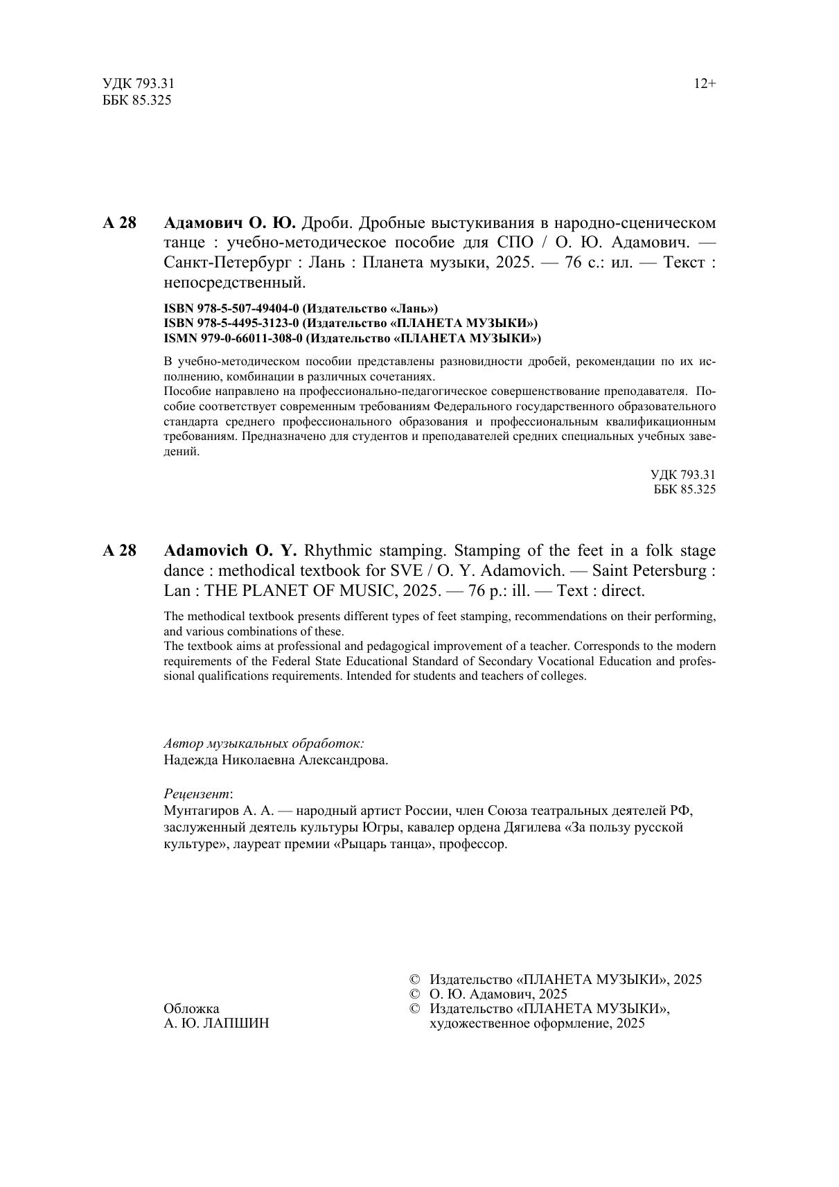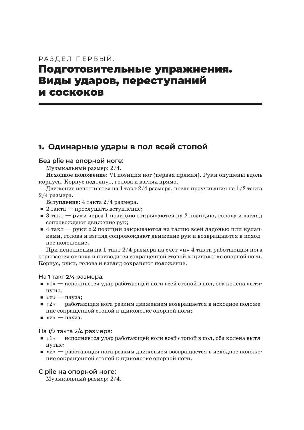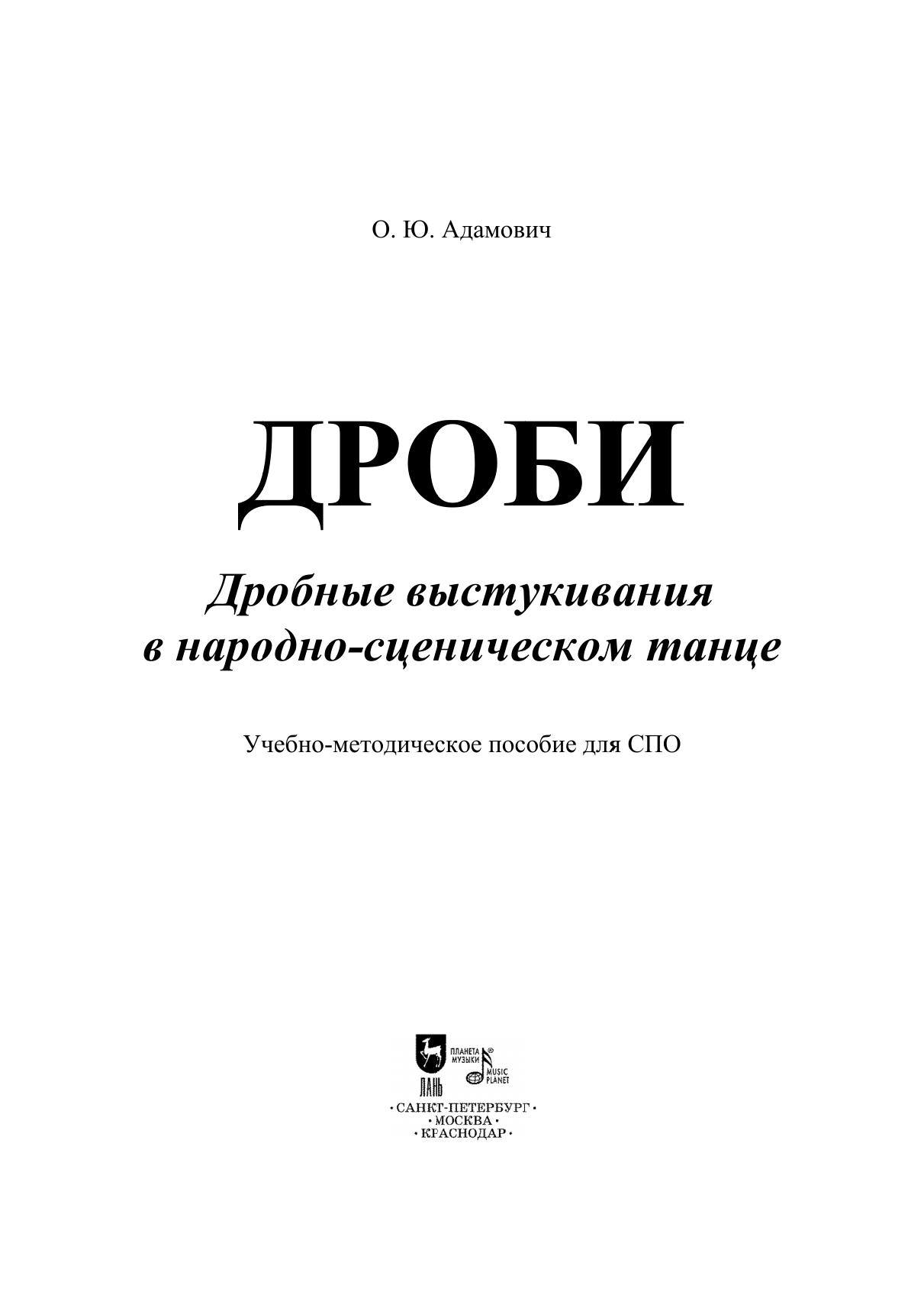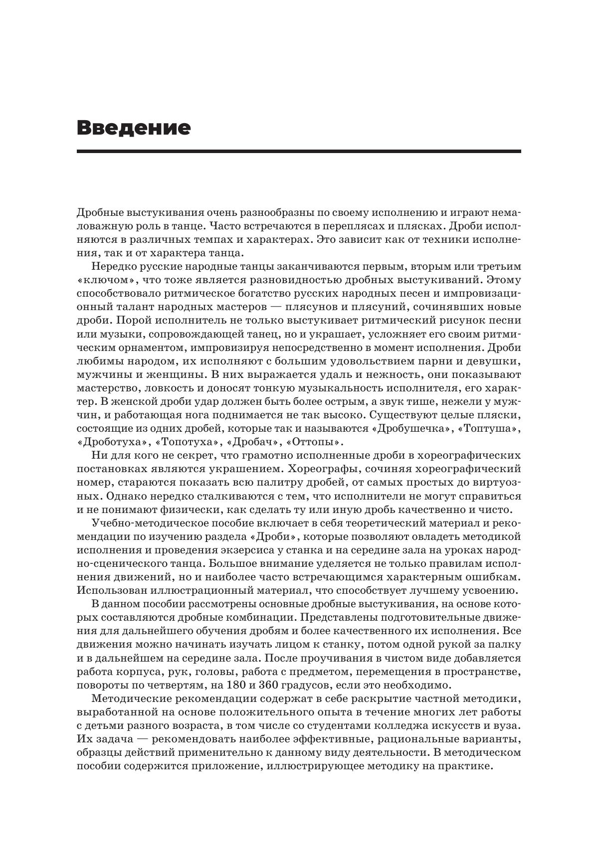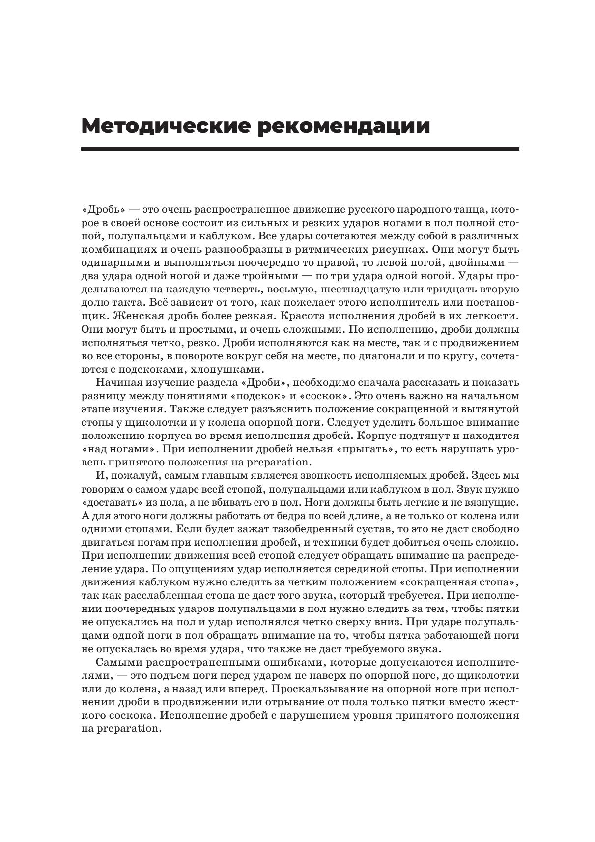 В учебно-методическом пособии представлены разновидности дробей, рекомендации по их исполнению, комбинации в различных сочетаниях. Материал направлен на профессионально-педагогическое совершенствование преподавателя. Пособие соответствует современным требованиям Федерального государственного образовательного стандарта среднего профессионального образования и профессиональным квалификационным требованиям. Предназначено для студентов и преподавателей средних специальных учебных заведений. The methodical textbook presents different types of feet stamping, recommendations on their performing, and various combinations of these. The textbook aims at professional and pedagogical improvement of a teacher. Corresponds to the modern requirements of the Federal State Educational Standard of Secondary Vocational Education and professional qualifications requirements. Intended for students and teachers of colleges.