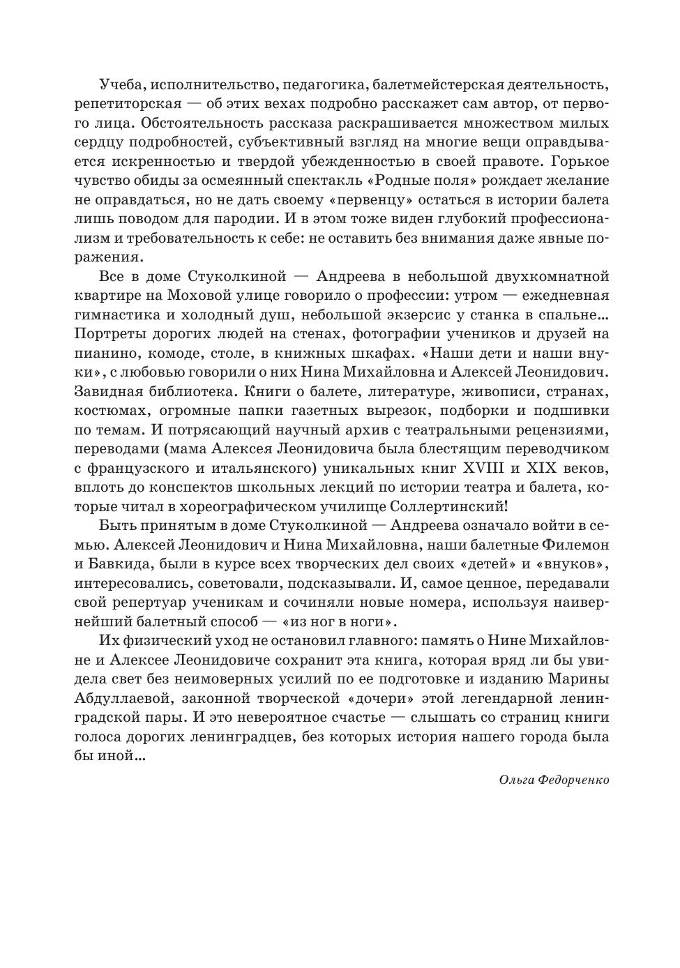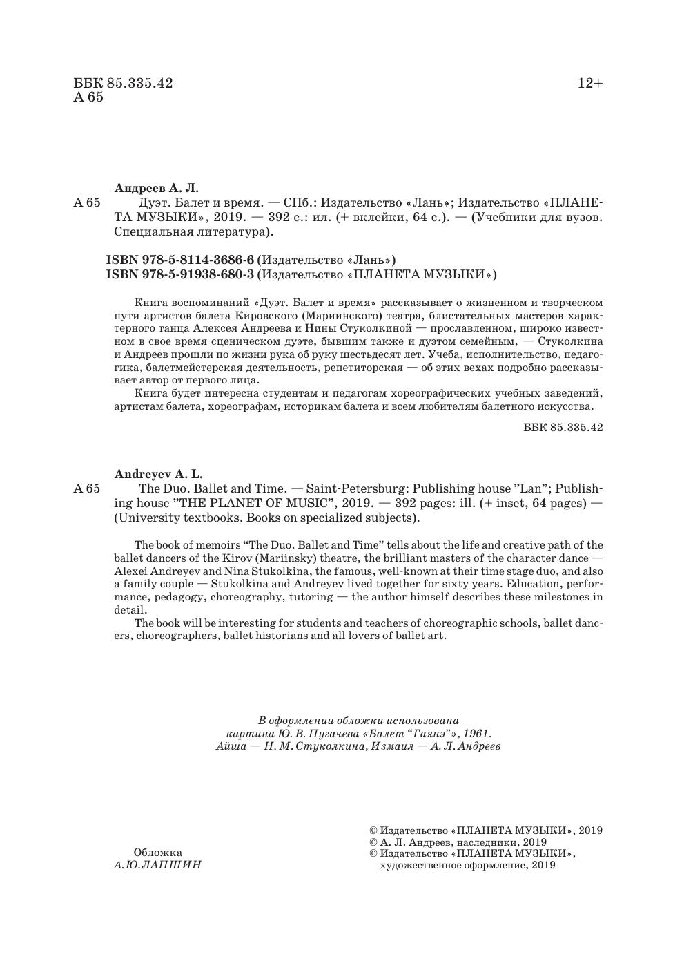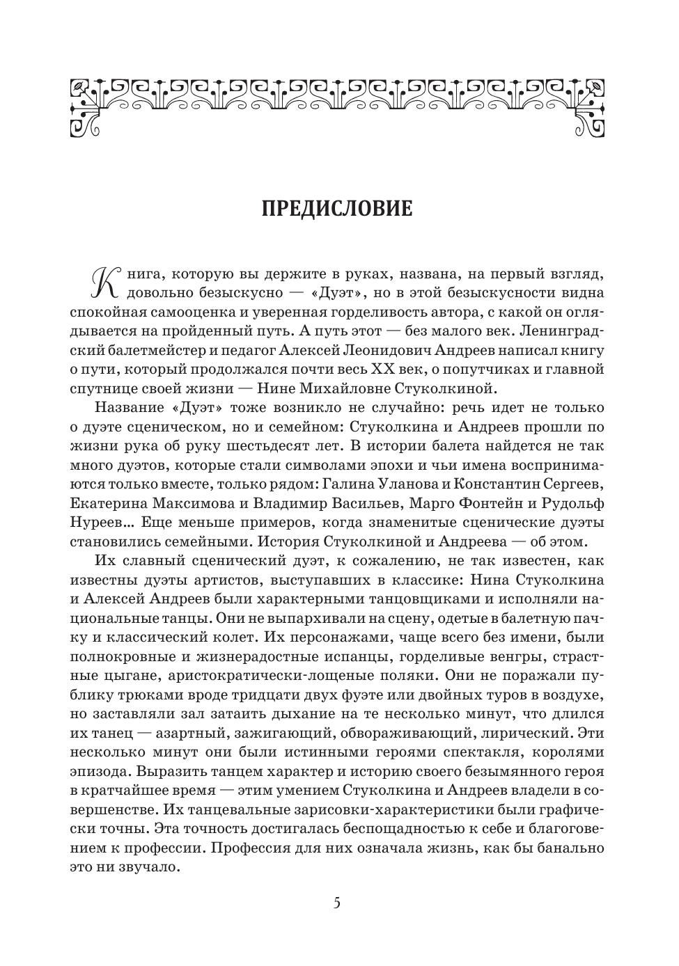 Книга воспоминаний «Дуэт. Балет и время» рассказывает о жизненном и творческом пути артистов балета Кировского (Мариинского) театра, блистательных мастеров характерного танца Алексея Андреева и Нины Стуколкиной — прославленном, широко известном в свое время сценическом дуэте, бывшим также и дуэтом семейным, — Стуколкина и Андреев прошли по жизни рука об руку шестьдесят лет. Учеба, исполнительство, педагогика, балетмейстерская деятельность, репетиторская — об этих вехах подробно рассказывает автор от первого лица.