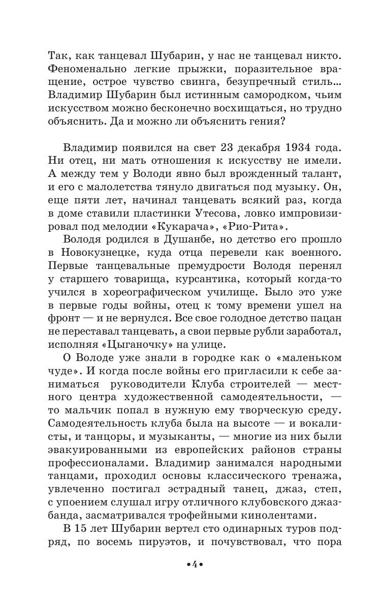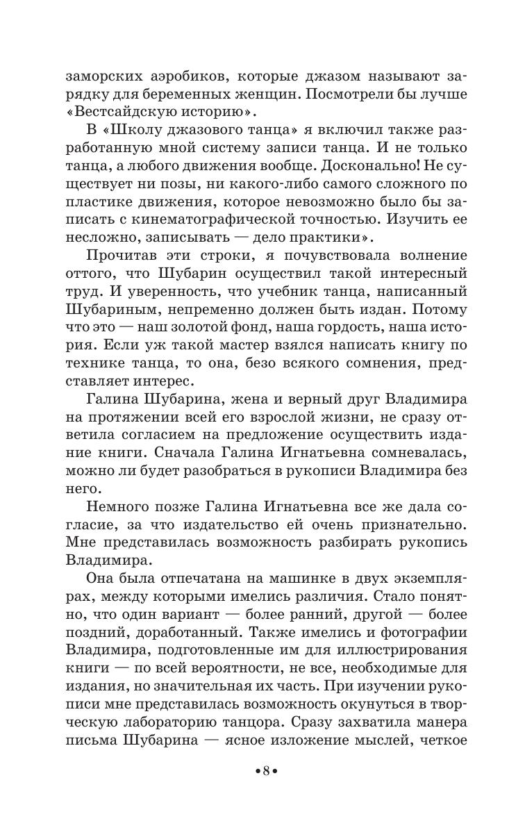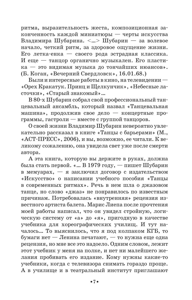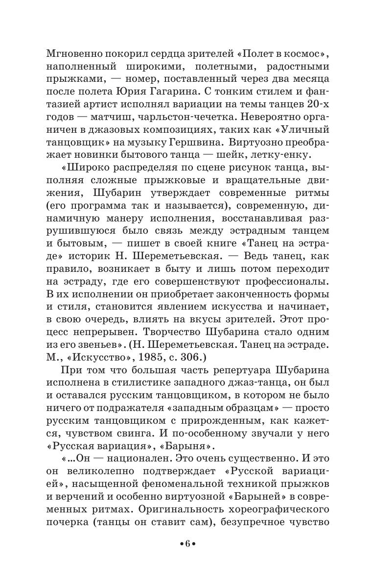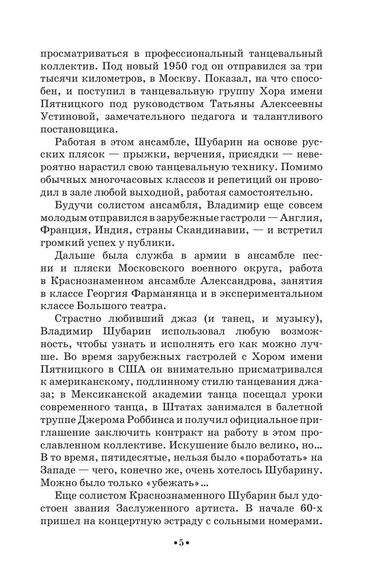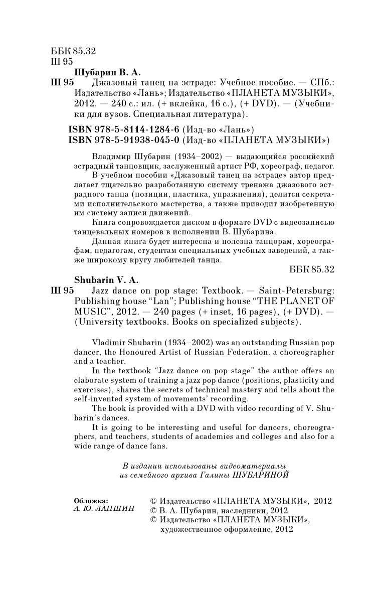 Vladimir Shubarin (1934–2002) was an outstanding Russian pop dancer, the Honoured Artist of Russian Federation, a choreographer and a teacher. In the textbook “Jazz dance on pop stage” the author offers an elaborate system of training a jazz pop dance (positions, plasticity and exercises), shares the secrets of technical mastery and tells about the self-invented system of movements’ recording. The book is provided with a DVD with video recording of V. Shubarin’s dances. It is going to be interesting and useful for dancers, choreographers, and teachers, students of academies and colleges and also for a wide range of dance fans.