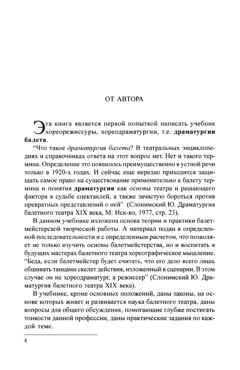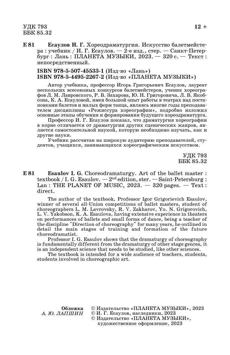 Автор учебника, профессор Игорь Григорьевич Есаулов, лауреат нескольких всесоюзных конкурсов балетмейстеров, ученик хореографов Л. М. Лавровского, Р. В. Захарова, Ю. Н. Григоровича, Л. В. Якобсона, К. А. Есауловой, имея большой опыт работы в театрах над постановками балетов и малых форм танца, являясь многие годы преподавателем дисциплины «Режиссура хореографии», подробно изложил основные этапы обучения и формирования будущего хореодраматурга. Профессор И. Г. Есаулов показывает, что драматургия хореографии в корне отличается от драматургии других сценических жанров, является самостоятельной наукой, которую необходимо изучать, как и другие науки. Учебник расчитан на широкую аудиторию преподавателей, студентов, учащихся, занимающихся хореографическим искусством. The author of the textbook, Professor Igor Grigorievich Esaulov, winner of several all-Union competitions of ballet masters, student of choreographers L. M. Lavrovsky, R. V. Zakharov, Yu. N. Grigorovich, L. V. Yakobson, K. A. Esaulova, having extensive experience in theaters on performances of ballets and small forms of dance, being a teacher of the discipline "Direction of choreography" for many years, he outlined in detail the main stages of training and formation of the future choreodramatist. Professor I. G. Esaulov shows that the dramaturgy of choreography is fundamentally different from the dramaturgy of other stage genres, it is an independent science that needs to be studied, like other sciences. The textbook is intended for a wide audience of teachers, students, students involved in choreographic art.
