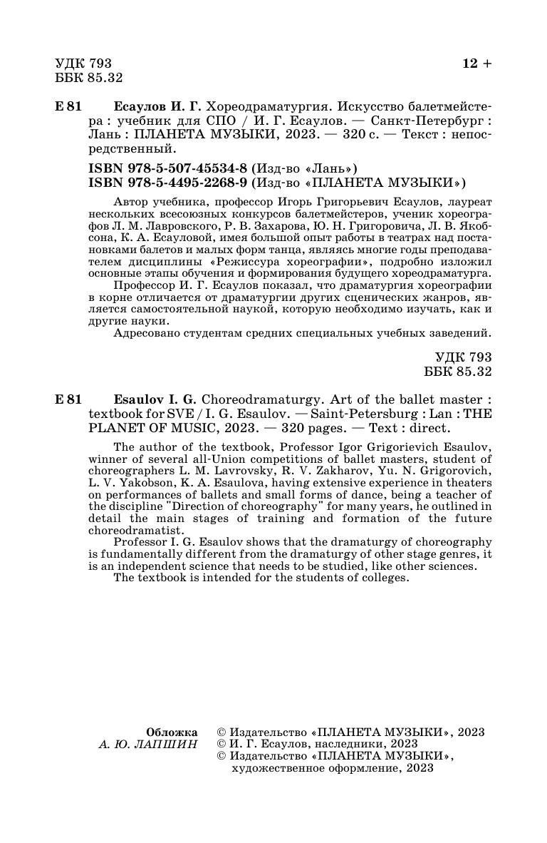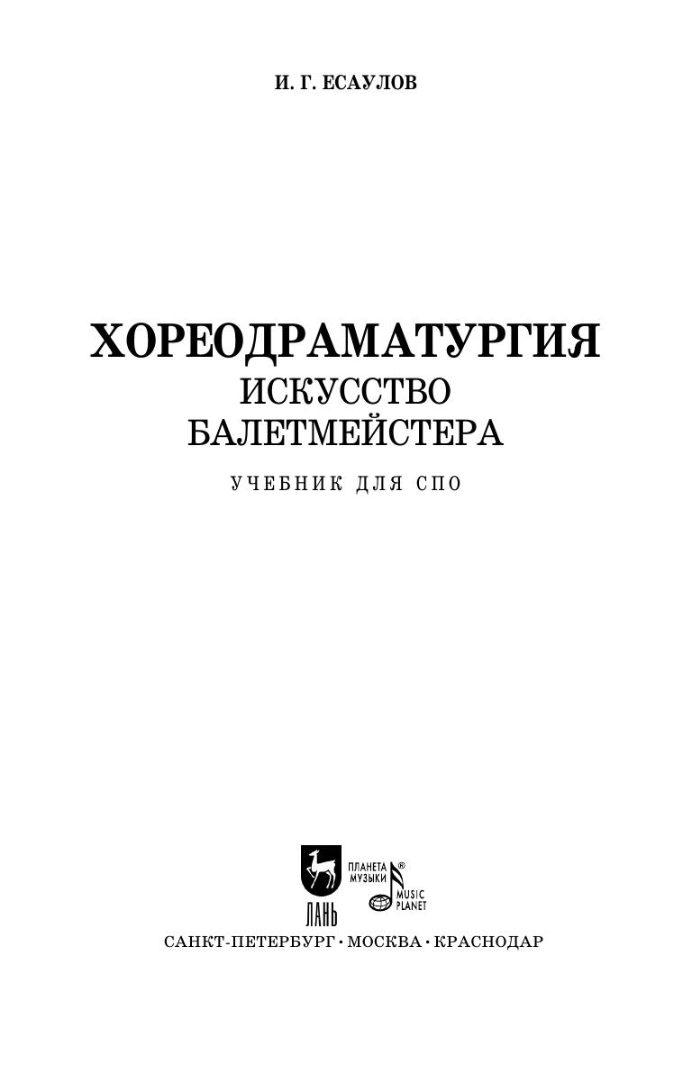 Автор учебника, профессор Игорь Григорьевич Есаулов, лауреат нескольких всесоюзных конкурсов балетмейстеров, ученик хореографов Л. М. Лавровского, Р. В. Захарова, Ю. Н. Григоровича, Л. В. Якобсона, К. А. Есауловой, имея большой опыт работы в театрах над постановками балетов и малых форм танца, являясь многие годы преподавателем дисциплины «Режиссура хореографии», подробно изложил основные этапы обучения и формирования будущего хореодраматурга. Профессор И. Г. Есаулов показывает, что драматургия хореографии в корне отличается от драматургии других сценических жанров, является самостоятельной наукой, которую необходимо изучать, как и другие науки. Адресовано студентам средних специальных учебных заведений. The author of the textbook, Professor Igor Grigorievich Esaulov, winner of several all-Union competitions of ballet masters, student of choreographers L. M. Lavrovsky, R. V. Zakharov, Yu. N. Grigorovich, L. V. Yakobson, K. A. Esaulova, having extensive experience in theaters on performances of ballets and small forms of dance, being a teacher of the discipline "Direction of choreography" for many years, he outlined in detail the main stages of training and formation of the future choreodramatist. Professor I. G. Esaulov shows that the dramaturgy of choreography is fundamentally different from the dramaturgy of other stage genres, it is an independent science that needs to be studied, like other sciences. The textbook is intended for the students of colleges.