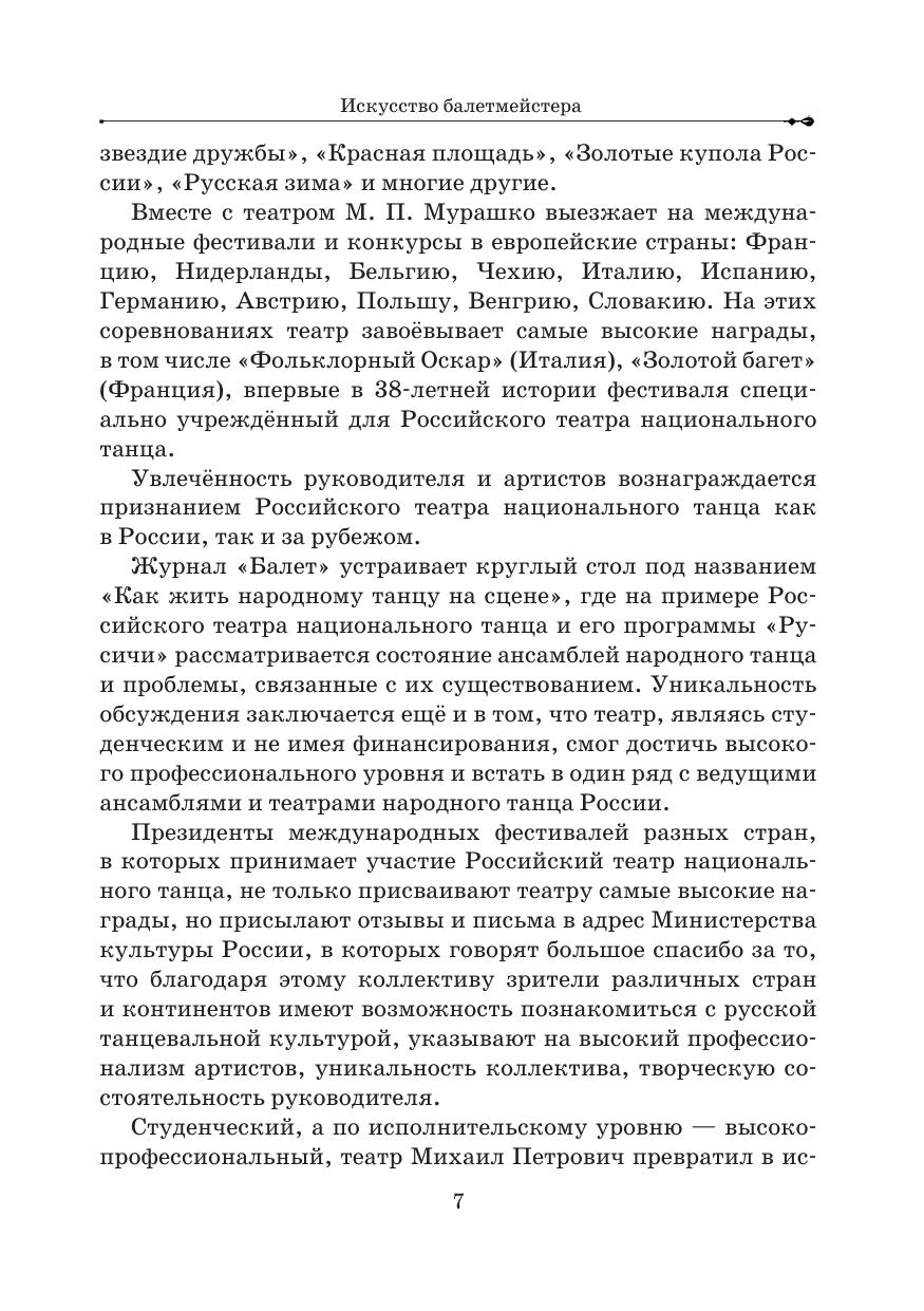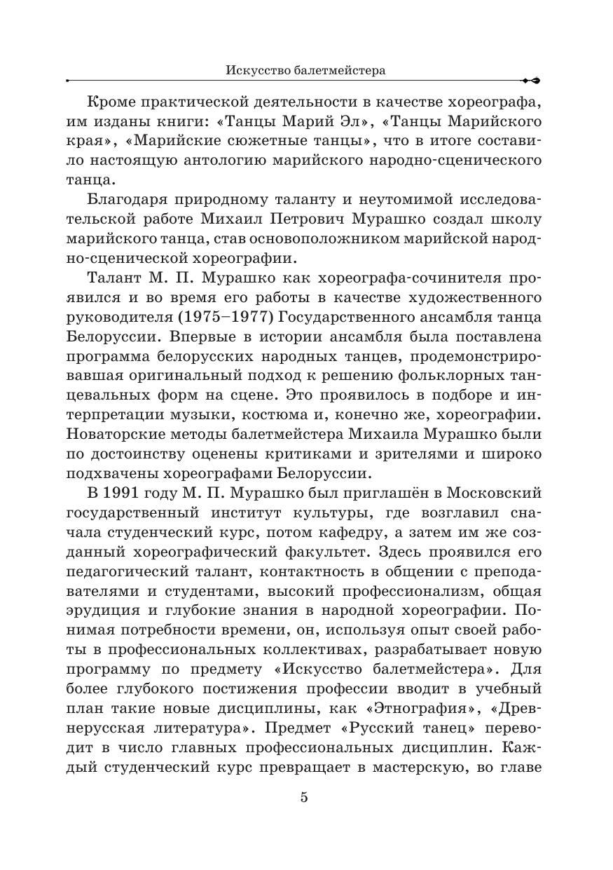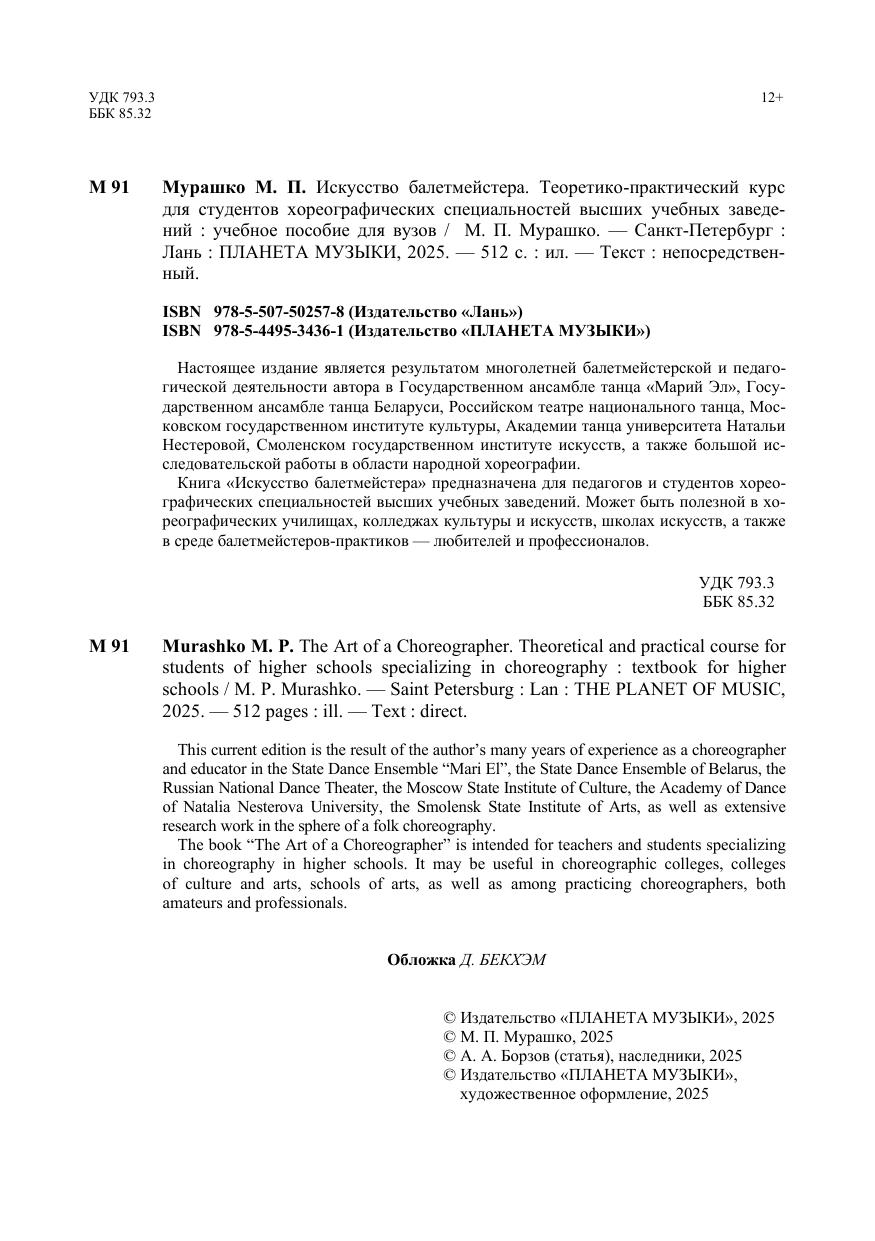 Настоящее издание является результатом многолетней балетмейстерской и педагогической деятельности автора в Государственном ансамбле танца "Марий Эл", Государственном ансамбле танца Беларуси, Российском театре национального танца, Московском Государственном институте культуры, Академии танца Университета Натальи Нестеровой, Смоленском Государственном институте искусств, а также большой исследовательской работы в области народной хореографии. Книга «Искусство балетмейстера» предназначена для педагогов и студентов хореографических специальностей высших учебных заведений. Может быть полезной в хореографических училищах, колледжах культуры и искусств, школах искусств, а также в среде балетмейстеров-практиков – любителей и профессионалов. This current edition is the result of the author’s many years of experience as a choreographer and educator in the State Dance Ensemble “Mari El”, the State Dance Ensemble of Belarus, the Russian National Dance Theater, the Moscow State Institute of Culture, the Academy of Dance of Natalia Nesterova University, the Smolensk State Institute of Arts, as well as extensive research work in the sphere of a folk choreography. The book “The Art of a Choreographer” is intended for teachers and students specializing in choreography in higher schools. It may be useful in choreographic colleges, colleges of culture and arts, schools of arts, as well as among practicing choreographers, both amateurs and professionals.