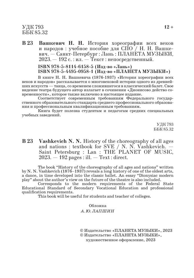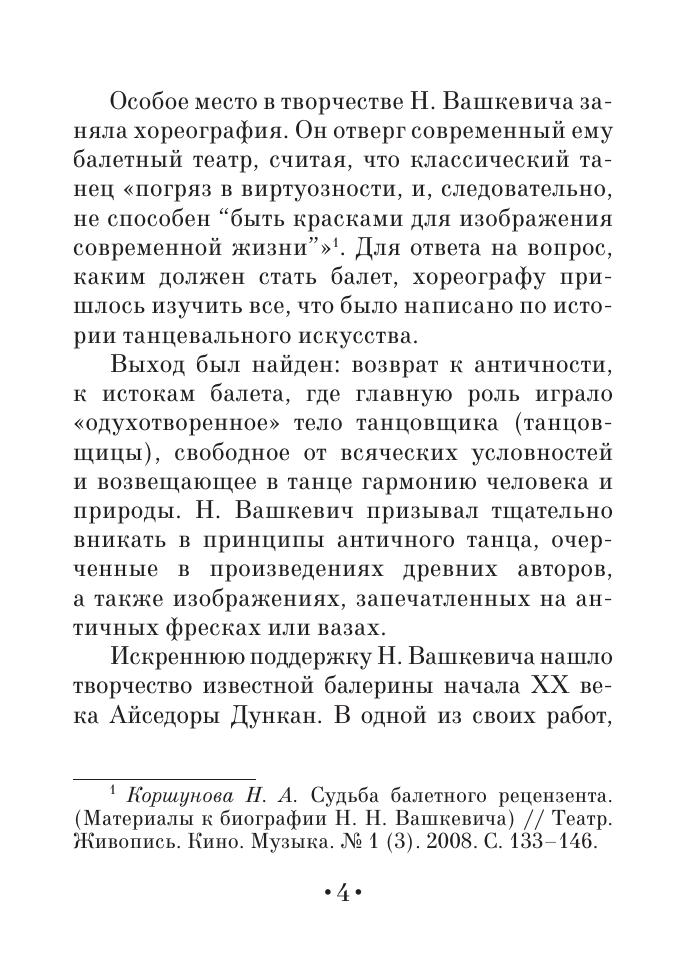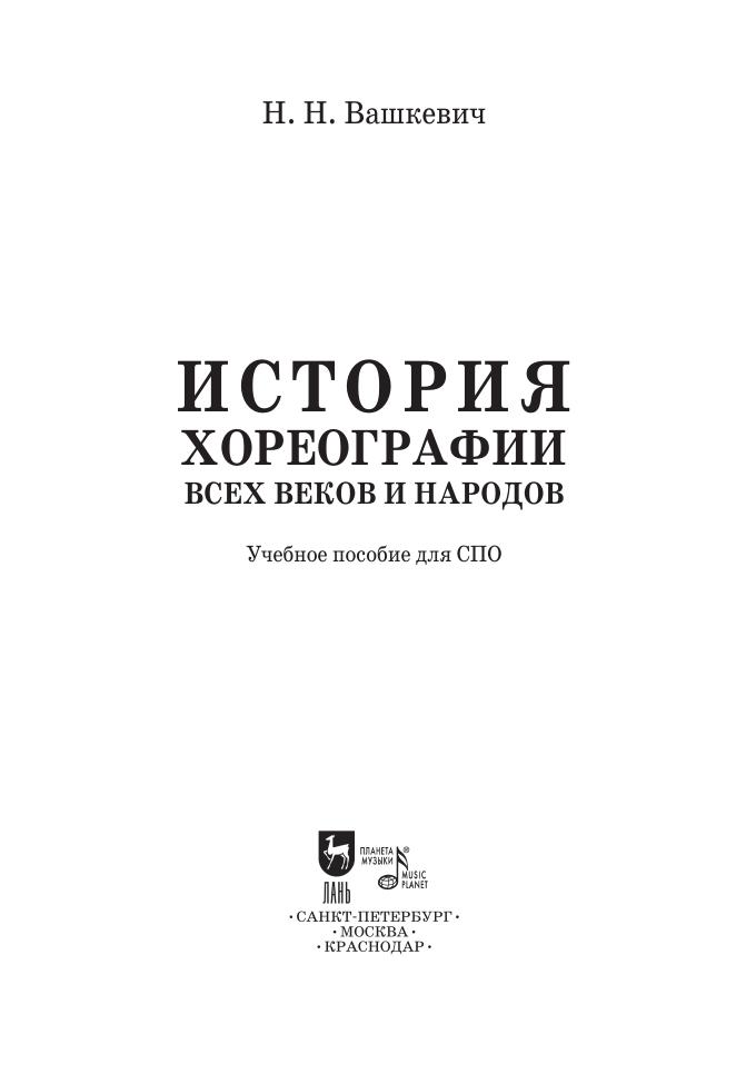 The book “History of the choreography of all ages and nations” written by N. N. Vashkevich (1876–1937) reveals a long history of one of the oldest arts, a dance, in time developed into the classic ballet. An essay “Dionysiac modern play” about the author’s view on the future of the theatre is also included. Corresponds to the modern requirements of the Federal State Educational Standard of Secondary Vocational Education and professional qualification requirements.