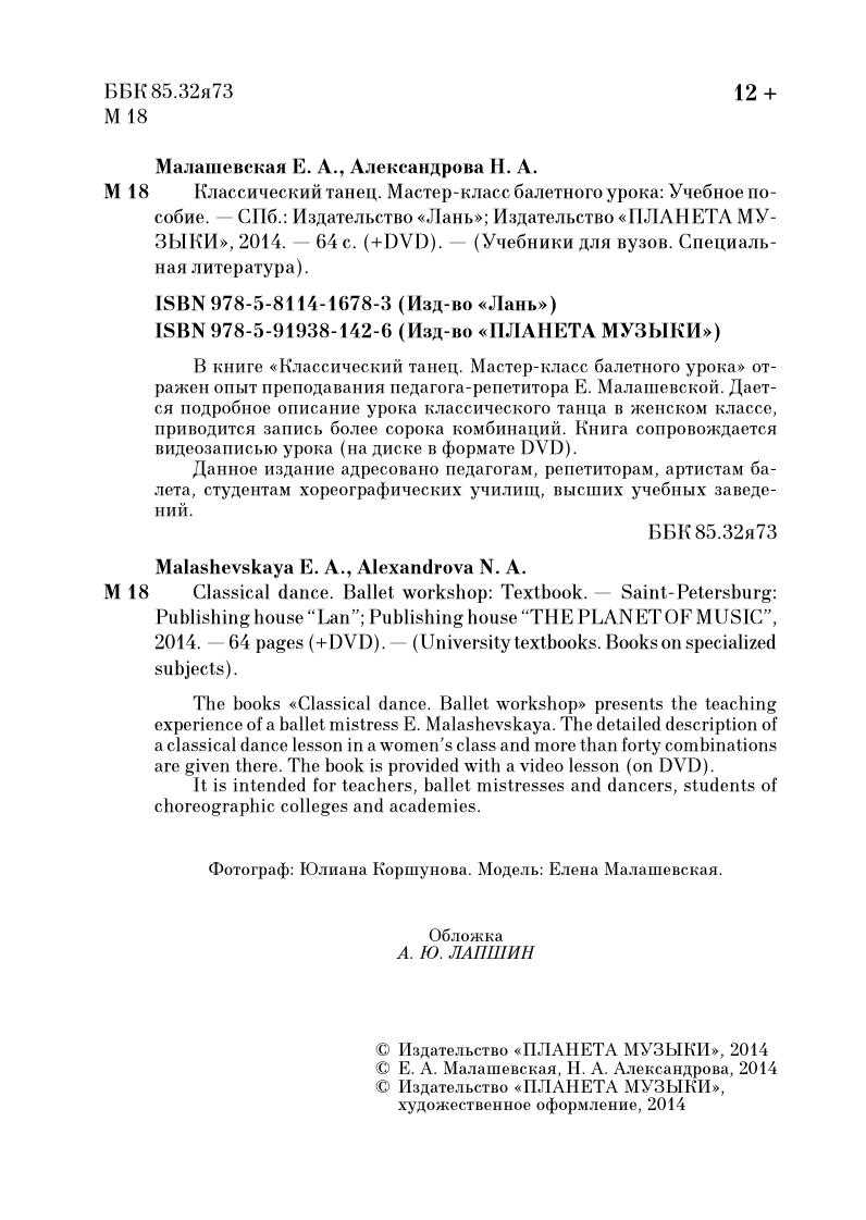 The books «Classical dance. Ballet workshop» presents the teaching experience of a ballet mistress E. Malashevskaya. The detailed description of a classical dance lesson in a women’s class and more than forty combinations are given there. The book is provided with a video lesson (on DVD). It is intended for teachers, ballet mistresses and dancers, students of choreographic colleges and academies.