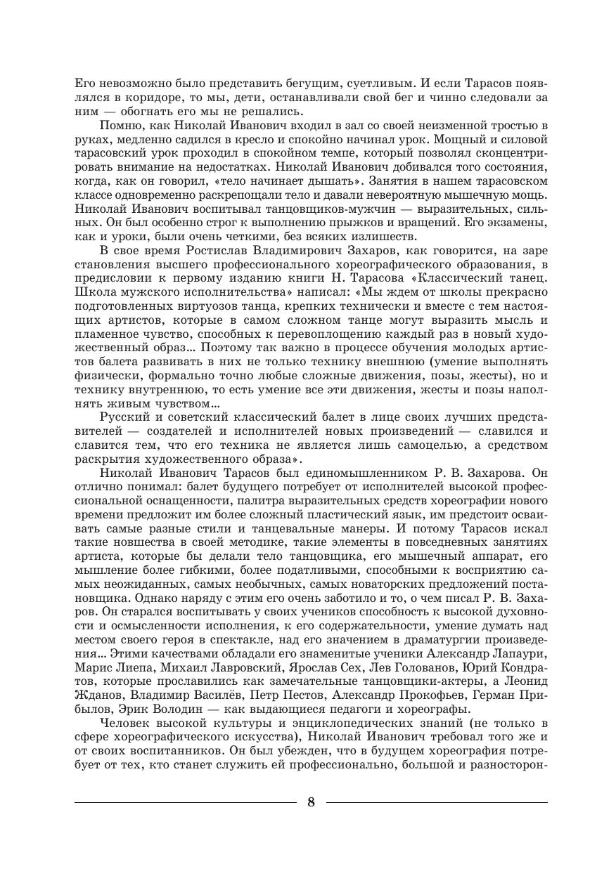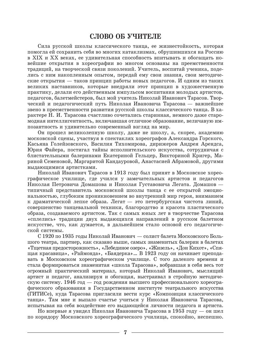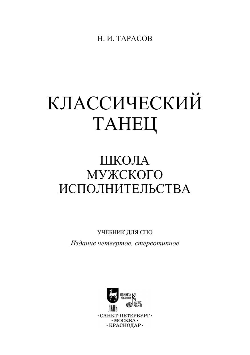 Книга «Классический танец. Школа мужского исполнительства» — переиздание труда Н. И. Тарасова, одного из корифеев педагогики в области балета. Это руководство для тех, кто занят обучением танцевальному искусству, охватывает все стороны педагогического процесса: основы классического танца, его цели и задачи, планирование работы педагога и учет успеваемости, эстетическое воспитание учеников, подбор музыкального материала для уроков. Работавший в годы советской власти, автор часто обращается к опыту советского балета, и издатели оставили текст без изменений из уважения к искусству, получившему всемирное признание. Большая часть учебного пособия посвящена методике обучения танцу — позам, танцевальным движениям, прыжкам, поворотам в той последовательности и в тех сочетаниях, которые проверены опытом и обеспечивают усвоение всех, даже самых сложных движений классического танца. Учебник предназначен педагогам и студентам средних специальных учебных заведений. “Classical dance. Technique for the Male Dancer” is a re-edition of the work written by N. I. Tarasov, the coryphaeus of ballet pedagogy. The textbook provides recommendations for those learning dance art about all parts of pedagogical process: the basics of classical dance, its goals and objectives, planning of pedagogical work, record of academic achievements, aesthetic education of students, and selection of music material for lessons. The author, worked in the Soviet Union, often refers to the Soviet Ballet, publishers left this material with respect to internationally recognized art. The textbook is designed to teachers and students of colleges. The main body of the textbook is given over to dance teaching method — poses, movements, bounces, and twirls are presented sequentially, that helps to learn all, even difficult, dance steps.