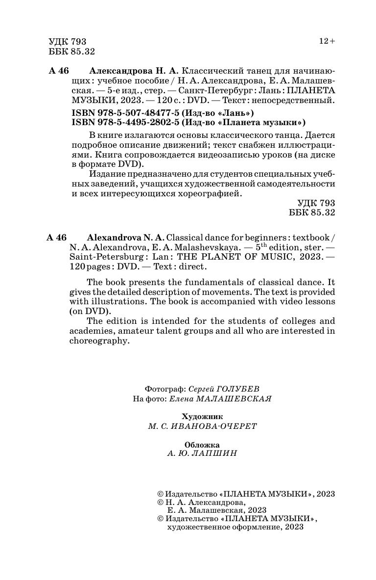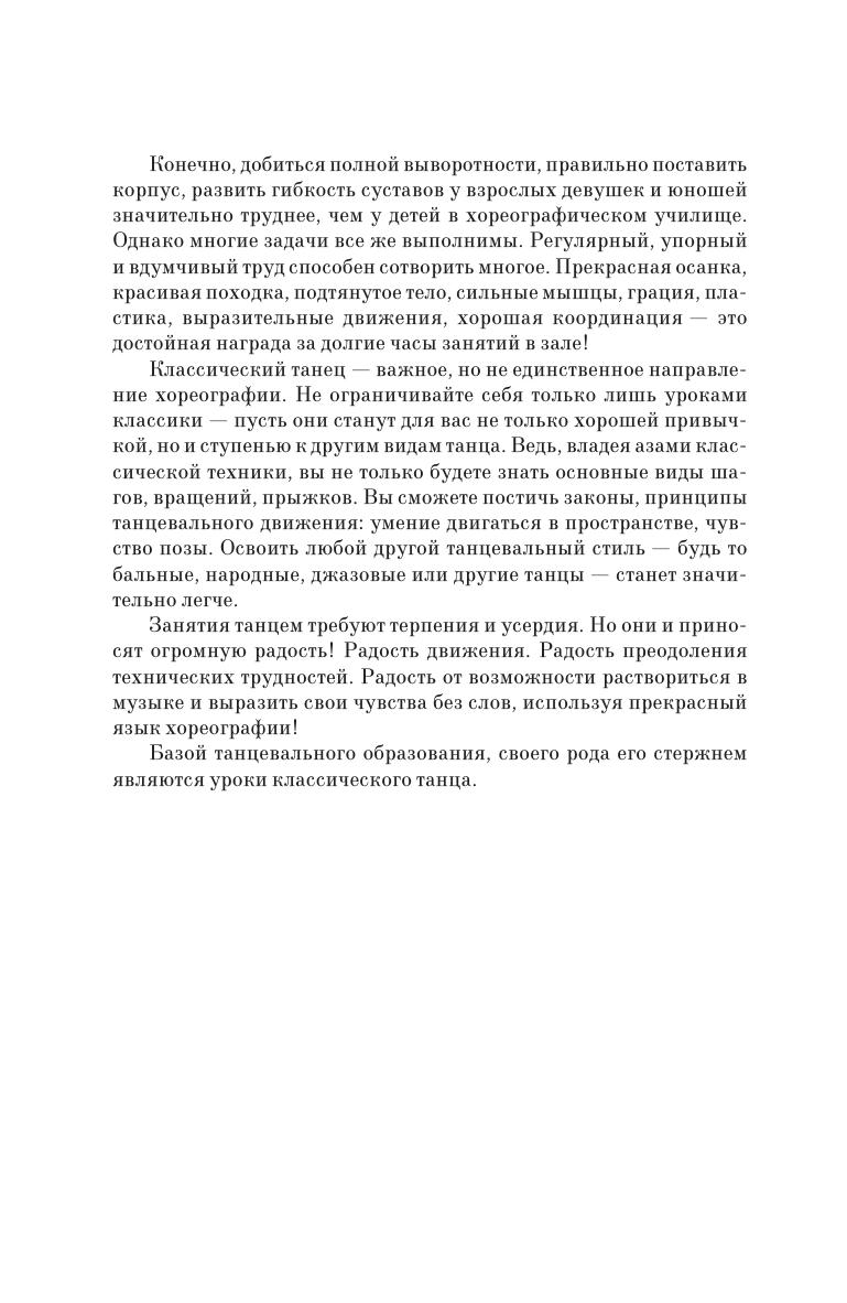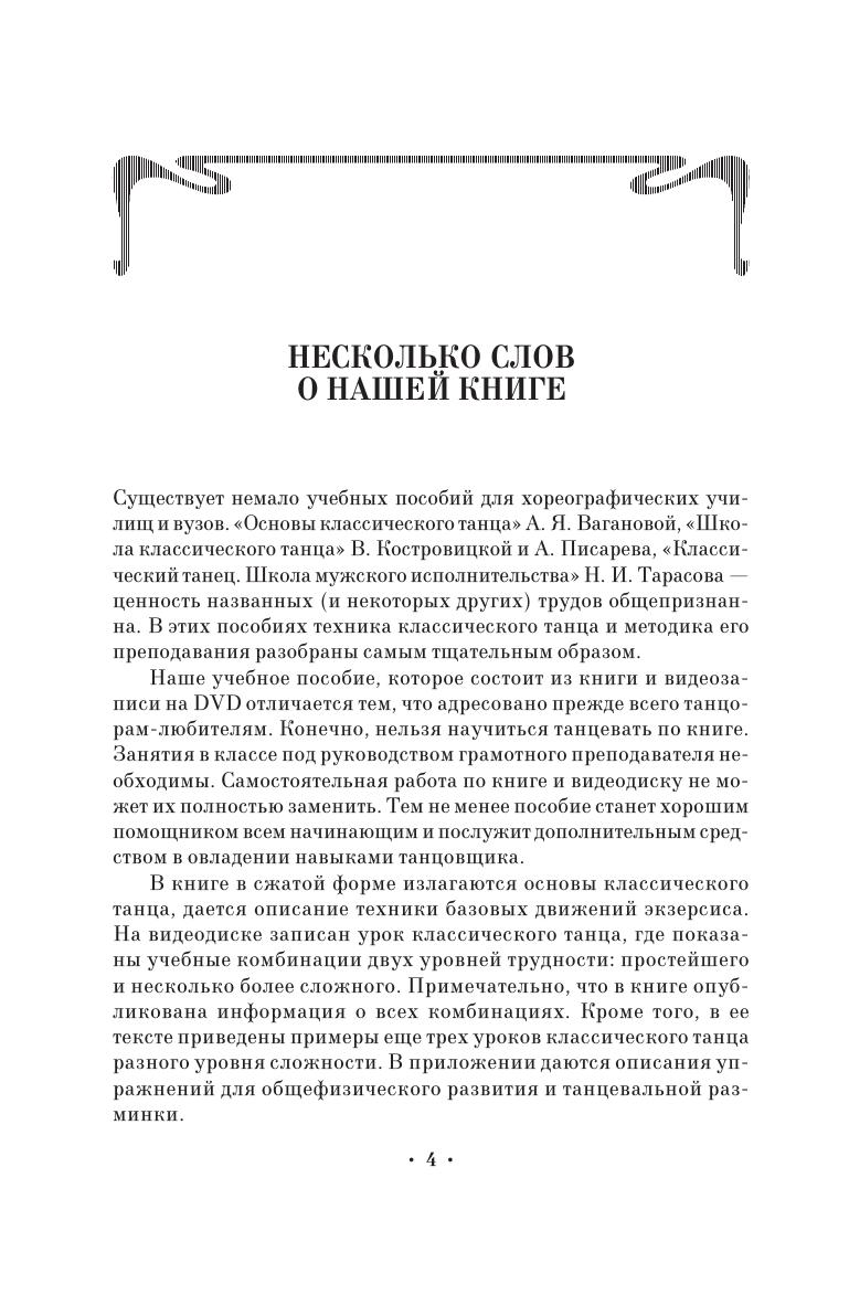 В книге излагаются основы классического танца. Дается подробное описание движений, текст снабжен иллюстрациями. Книга сопровождается видеозаписью уроков (на диске в формате DVD). Издание предназначено для студентов специальных учебных заведений, учащихся художественной самодеятельности и всех интересующихся хореографией. The book presents the fundamentals of classical dance. It gives the detailed description of movements. The text is provided with illustrations. The book is accompanied with video lessons (on DVD). The edition is intended for the students of colleges and academies, amateur talent groups and all who are interested in choreography.