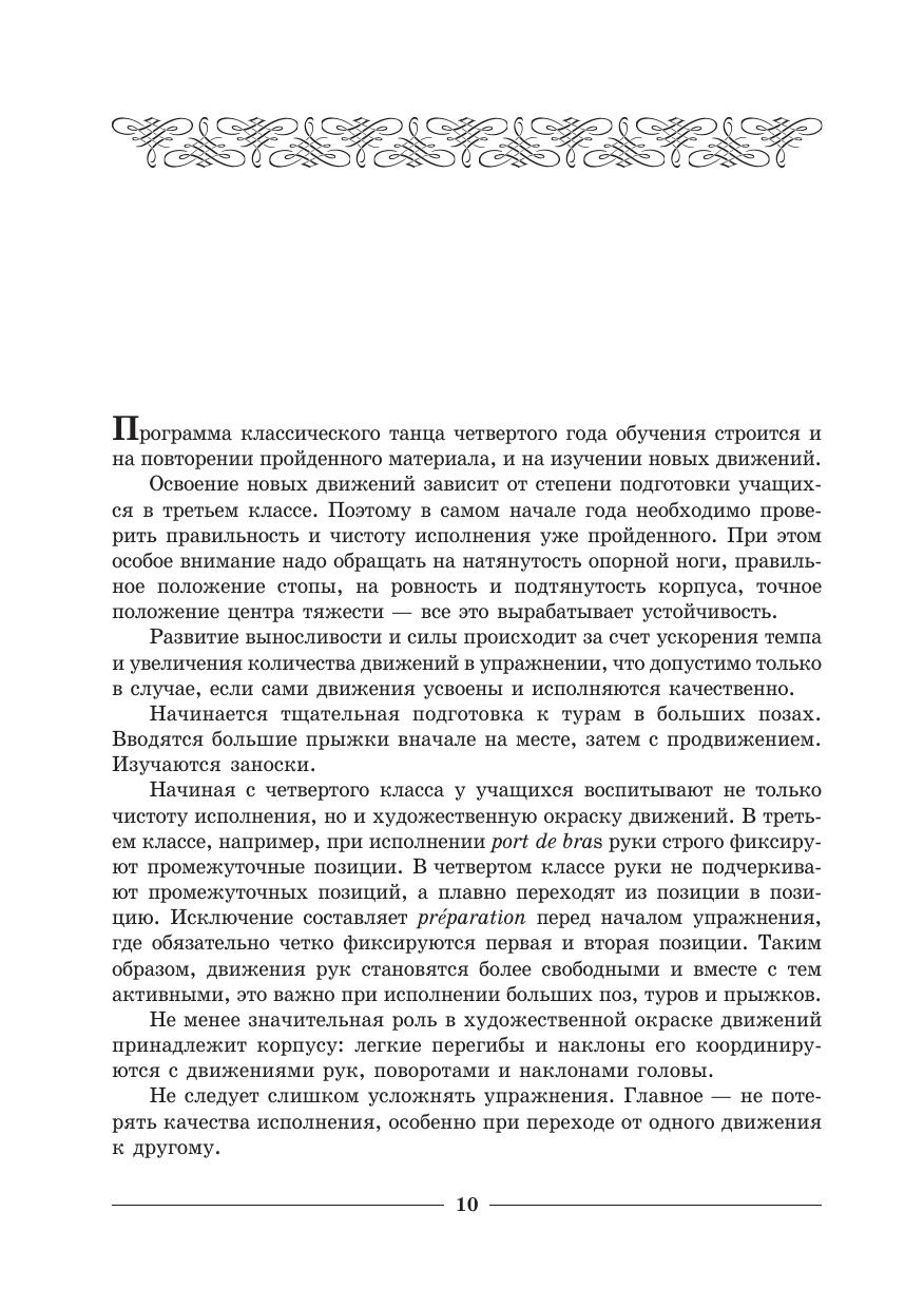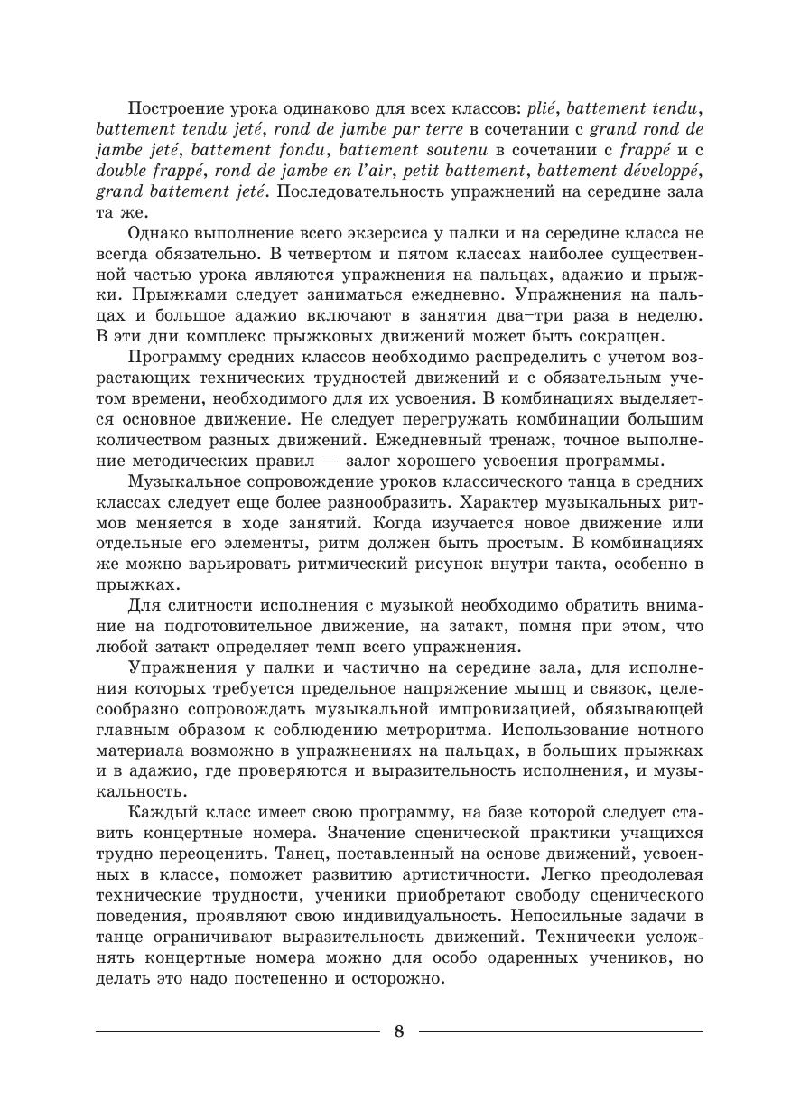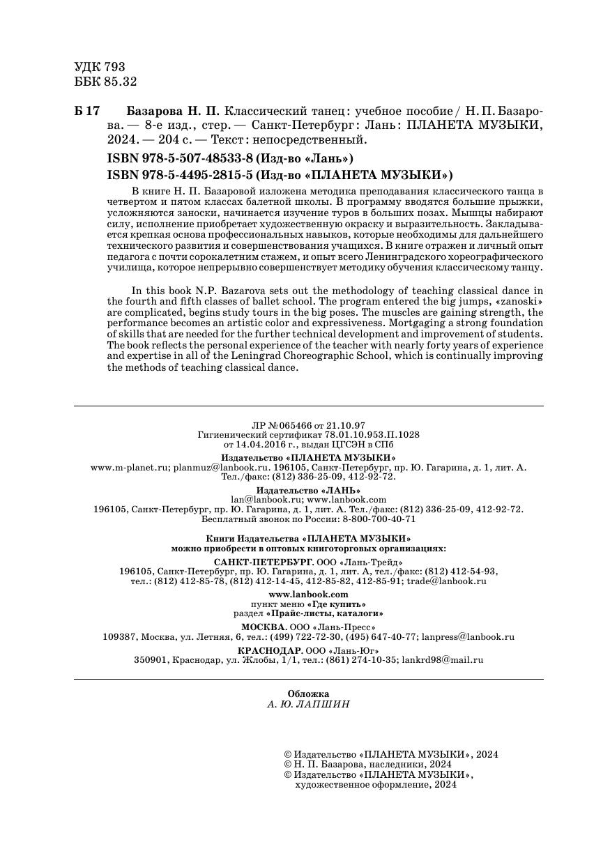 В книге Н.П.Базаровой изложена методика преподавания классического танца в четвертом и пятом классах балетной школы. В программу вводятся большие прыжки, усложняются заноски, начинается изучение туров в больших позах. Мышцы набирают силу, исполнение приобретает художественную окраску и выразительность. Закладывается крепкая основа профессиональных навыков, которые необходимы для дальнейшего технического развития и совершенствования учащихся. В книге отражен и личный опыт педагога с почти сорокалетним стажем, и опыт всего Ленинградского хореографического училища, которое непрерывно совершенствует методику обучения классическому танцу. In this book N.P. Bazarova sets out the methodology of teaching classical dance in the fourth and fifth classes of ballet school. The program entered the big jumps, «zanoski» are complicated, begins study tours in the big poses. The muscles are gaining strength, the performance becomes an artistic color and expressiveness. Mortgaging a strong foundation of skills that are needed for the further technical development and improvement of students. The book reflects the personal experience of the teacher with nearly forty years of experience and expertise in all of the Leningrad Choreographic School, which is continually improving the methods of teaching classical dance.